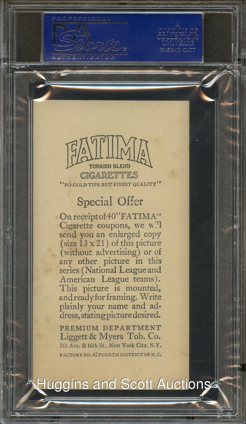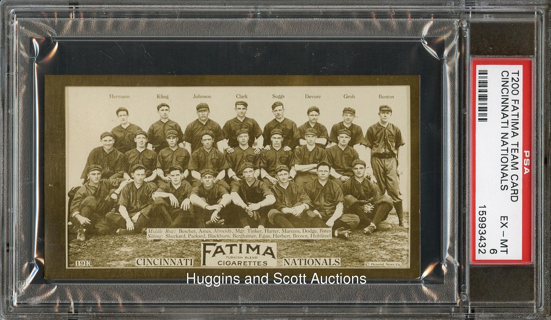 Graded EX-MT 6 by PSA. Representatives of the “Queen City” are found on this impressive 1913 T200 Fatima Cincinnati Nationals team card. This premium is one of three at the grading tier with only one better. This delicate card, which features Almeida, Brown and Marsans, displays inconsequential surface wear and light flaking on the reverse.