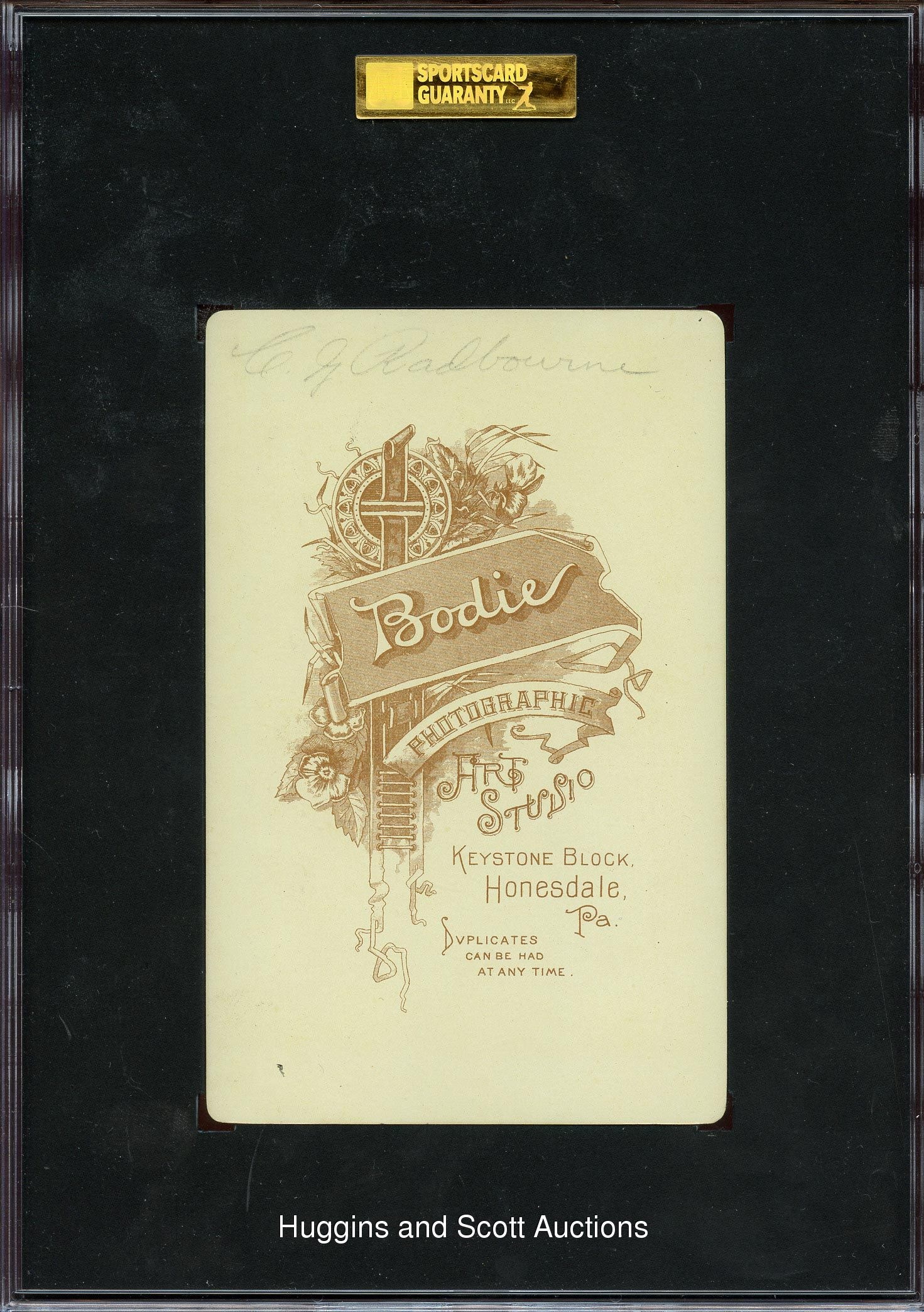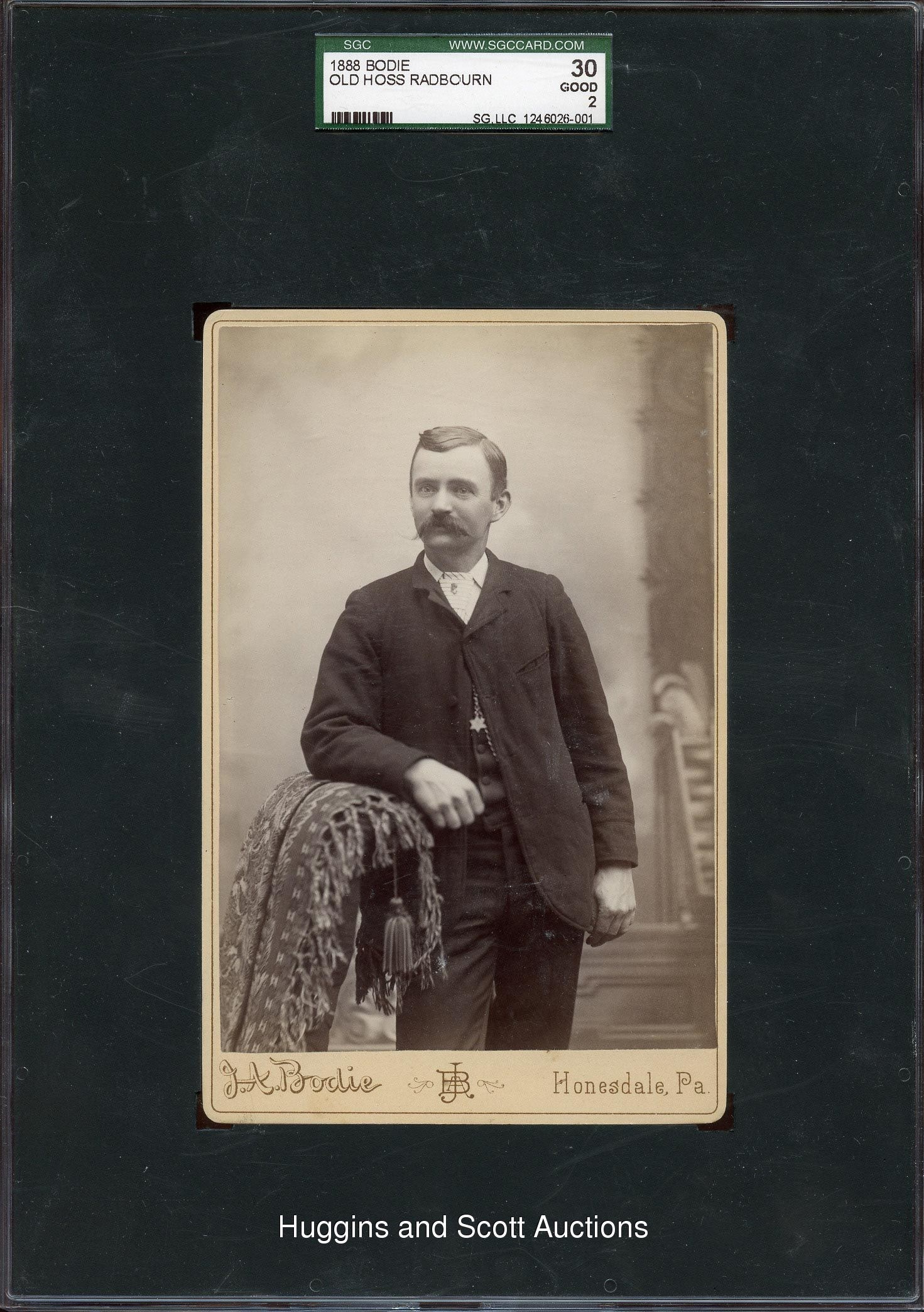 Graded 30 Good 2 by SGC. Although he endured his least successful season during the 1888 campaign, Charles Old Hoss Radbourn is all smiles on the offered Bodie Cabinet. The sepia image is captured with remarkable clarity on this well preserved nineteenth-century keepsake. The surface is unobstructed by any significant wear, while a reverse pencil notation, which confirms the hurler’s identity, factors into the technical assessment. The only such example judged by SGC, this card is an integral cornerstone of any Cooperstown-themed gathering.
