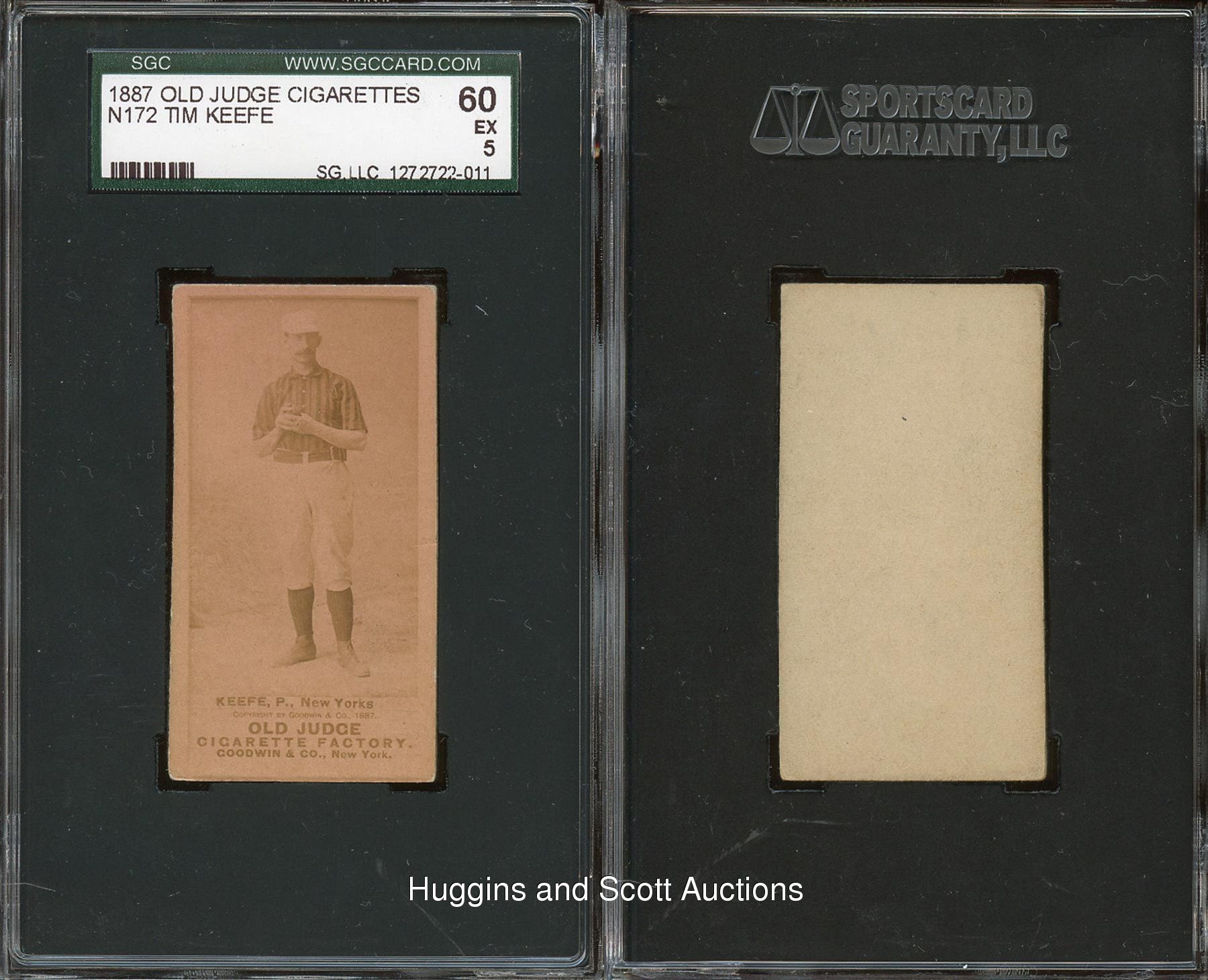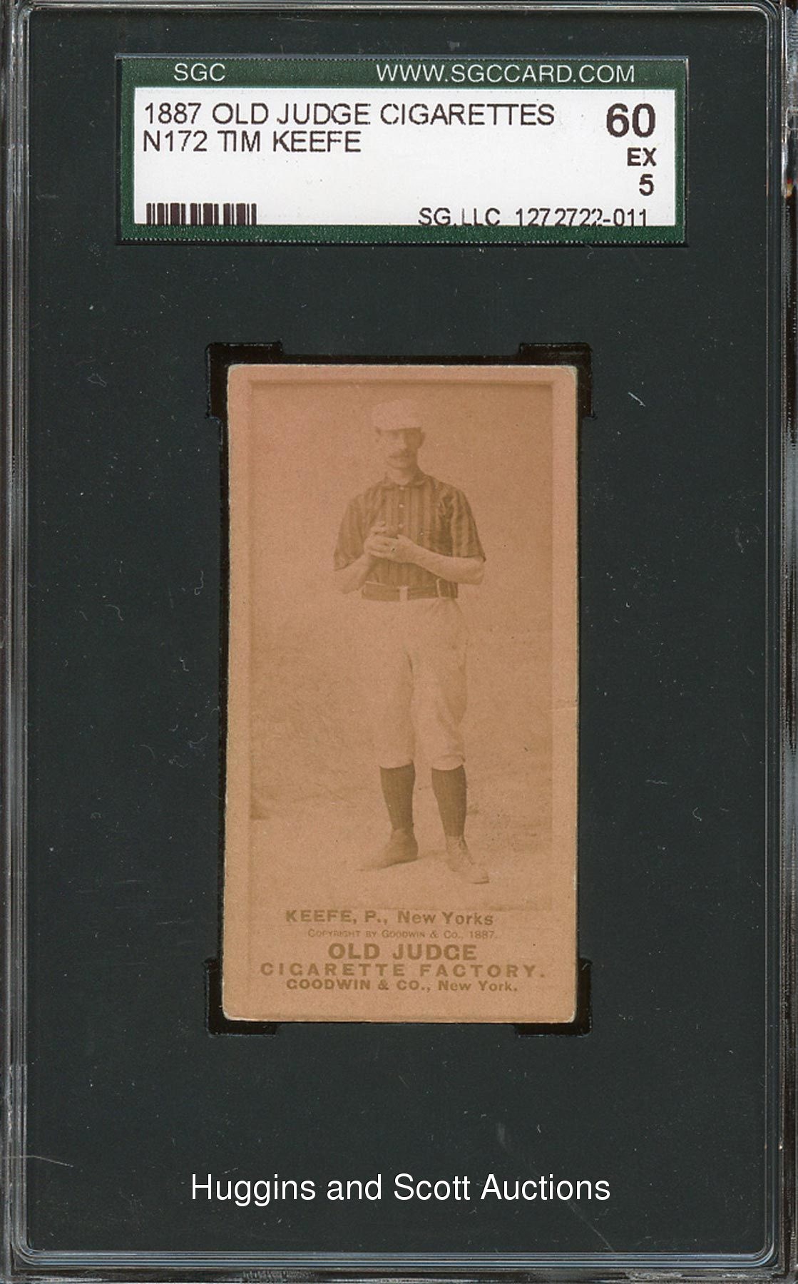Graded 60 EX 5 by SGC. This 1887 Old Judge Cigarettes N172 Tim Keefe example is one of nine at its tier with only six graded higher by the esteemed third-party service. A "Ball in hands at chest" version, this high-end collectible portrays the mustachioed Hall of Famer during the peak of his 342-win career. The crystal-clear image is one of several attributes contributing to this specimen's status, along with near-perfect centering and an immaculate (blank) reverse. Very mild edge and corner wear are consistent with the technical assessment of this tobacco card depicting a pre-war, 19th-century Hall of Famer.