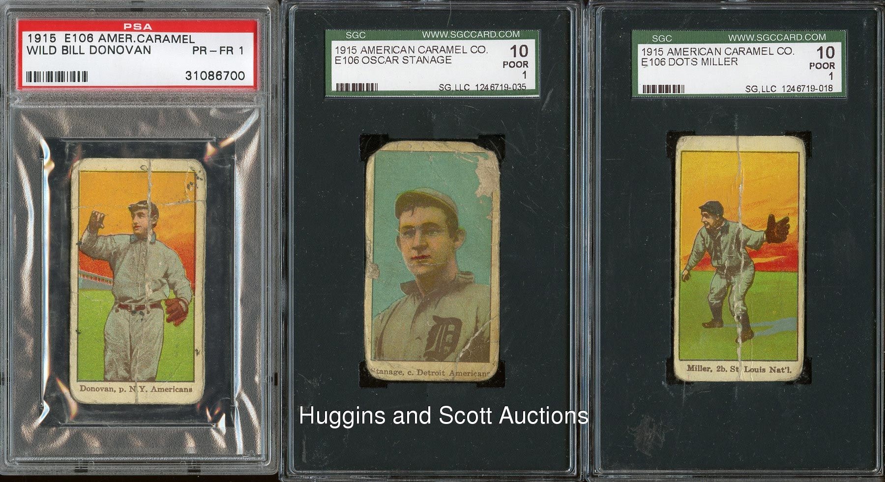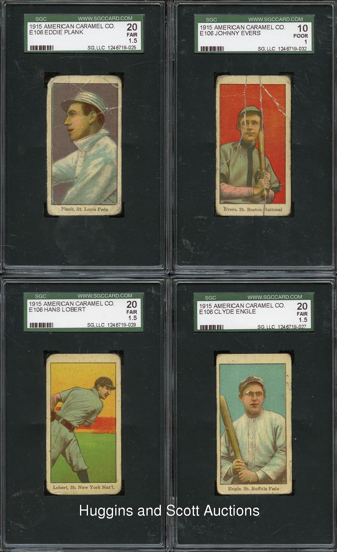 Assembled is a grouping of seven 1915 E106 American Caramel graded cards. Included in this assortment are PSA: (1 card) with Donovan (PSA 1); SGC: (6 cards) with SGC 20: (3 cards) with Engle, Lobert, Plank; SGC 10: (3 cards) with Evers, Miller and Stanage. Despite a combination of surface and reverse wear which accounts for their technical assessment, this gathering is ideal for the World War I era enthusiast.