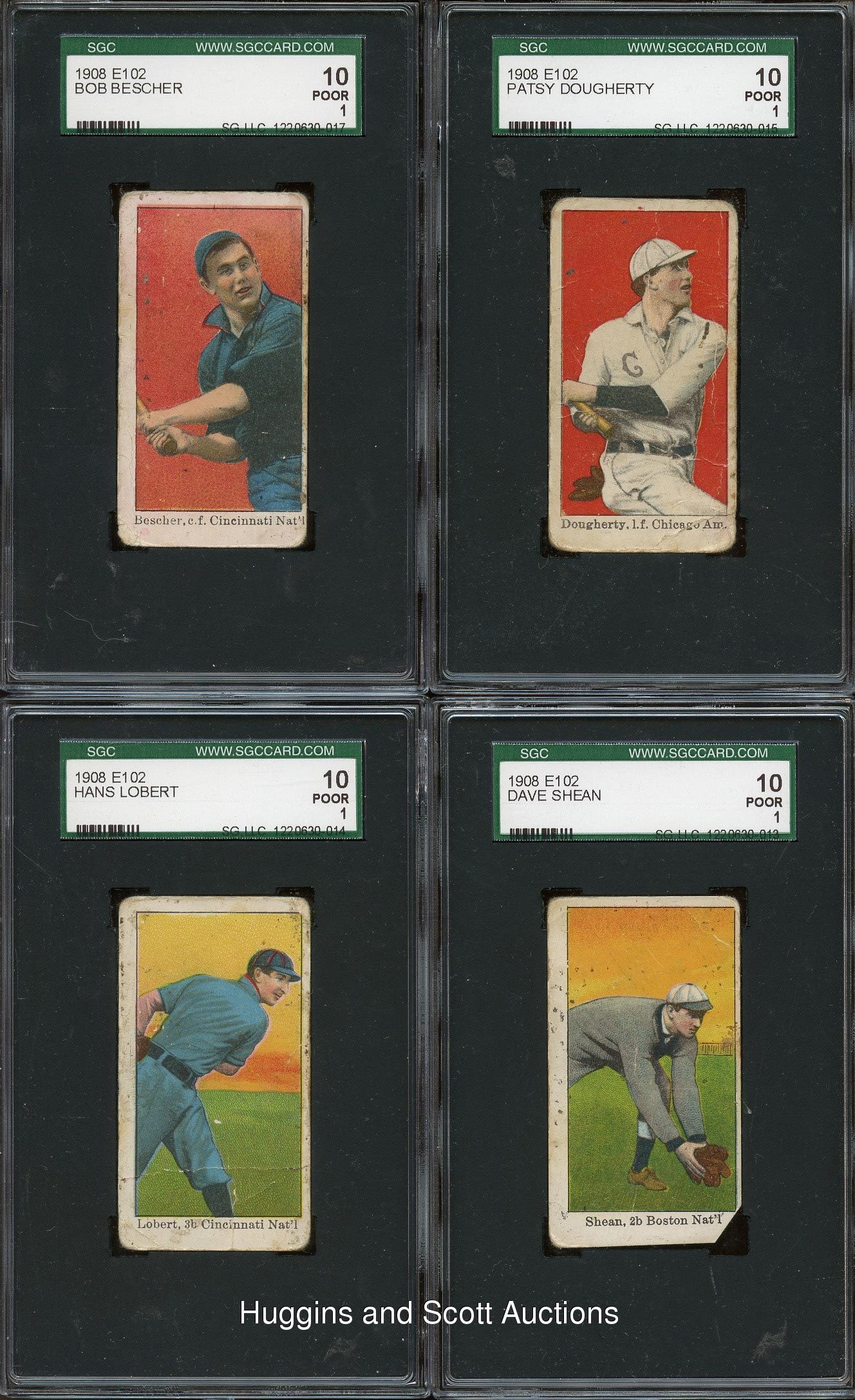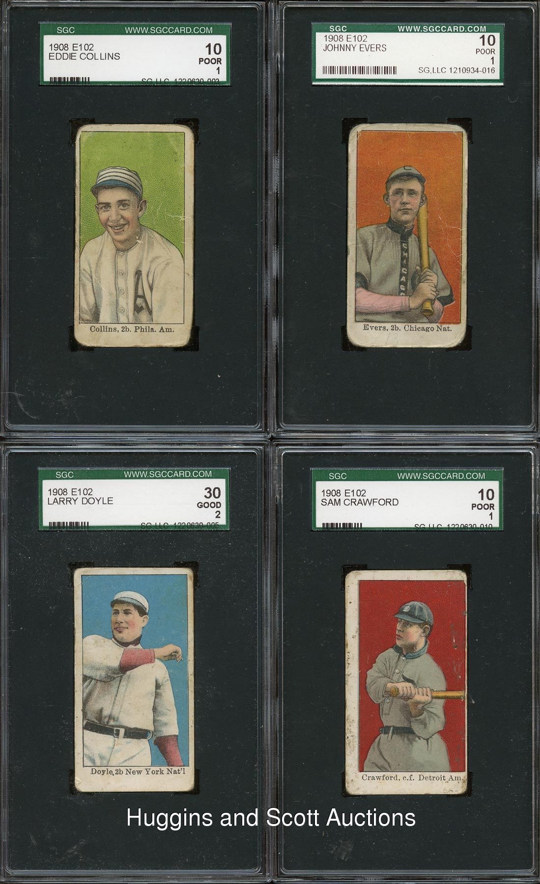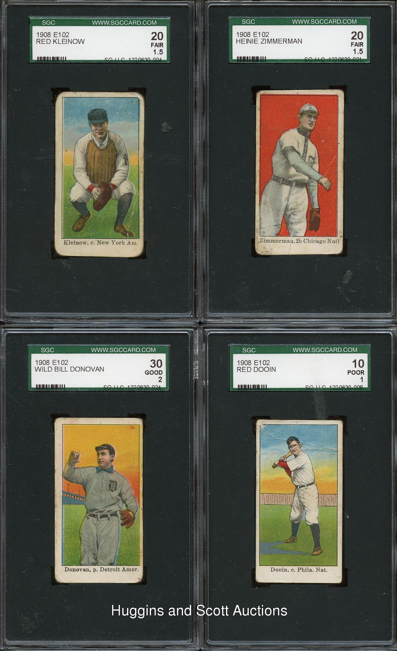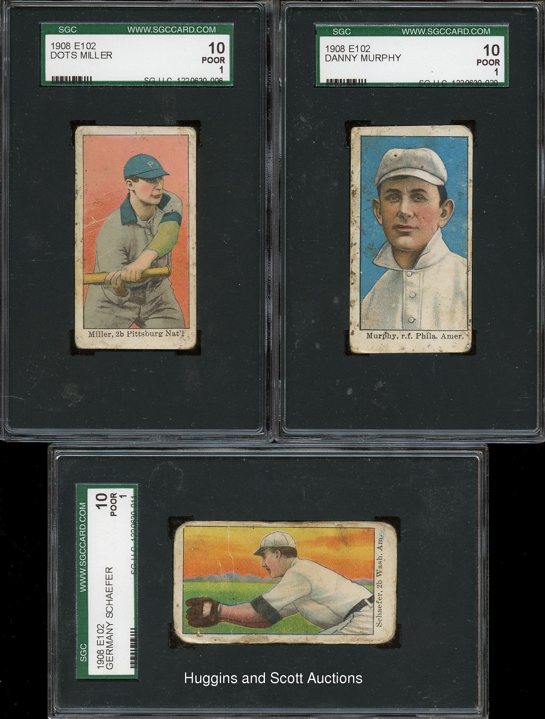 Each graded by SGC, presented is a selection of fifteen 1908 E102 Anonymous singles which includes a trio of Hall of Famers. Included are SGC 30: (2 cards) with Donovan, Doyle; SGC 20: (2 cards) with Kleinlow, Zimmerman; SGC 10: (11 cards) with Bescher, E. Collins, Crawford, Dooin, Dougherty, Evers, Lobert, Miller, Murphy, Schaefer and Shean. Despite a combination of wear which accounts for their technical grades, over 70% of this elusive century-old edition is present.