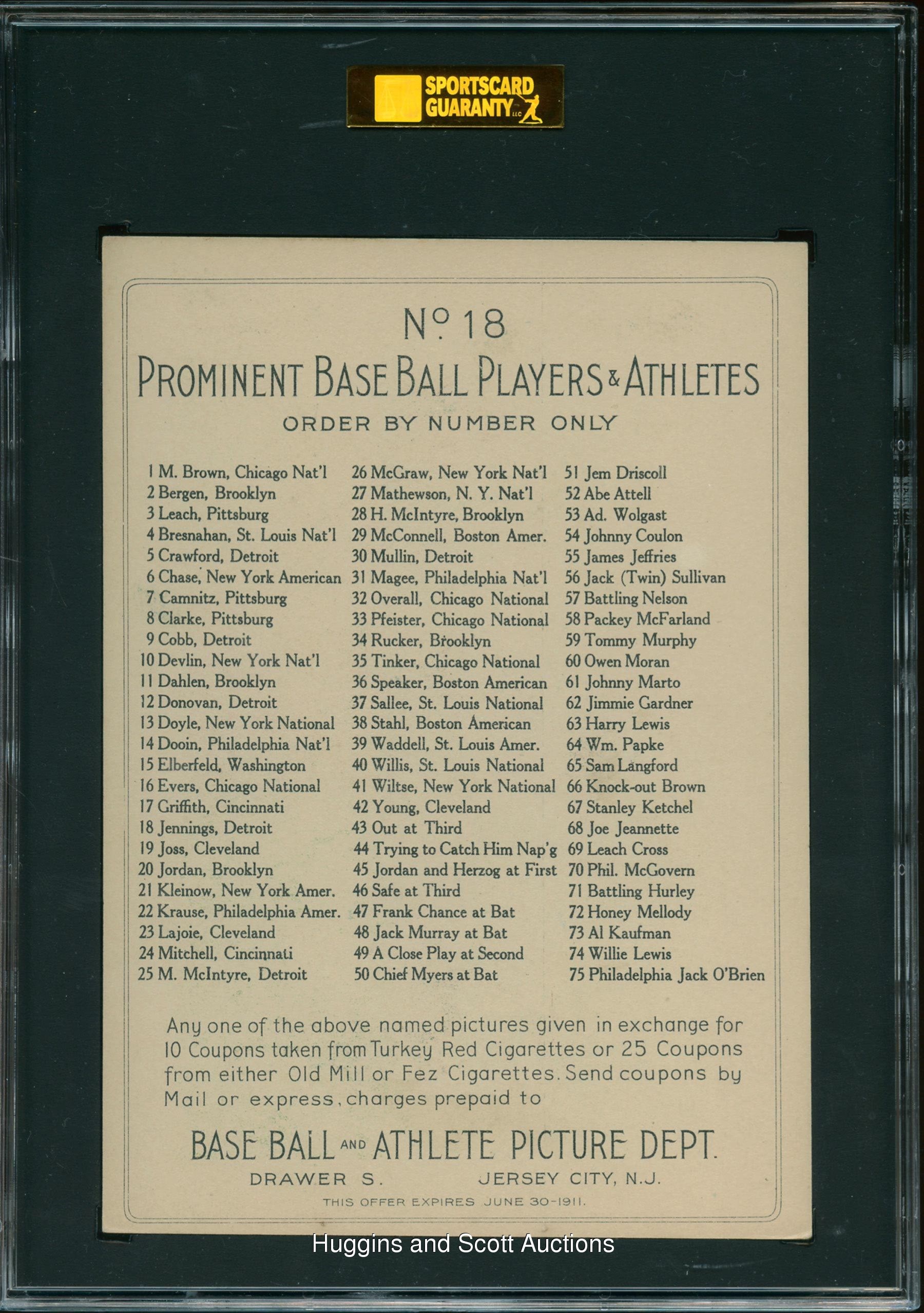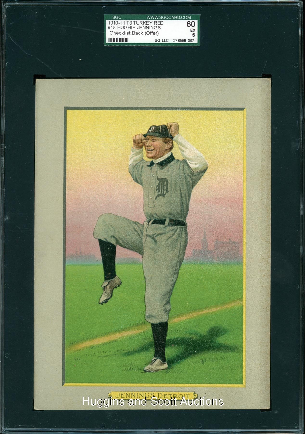 Graded 60 EX 5 by SGC. Despite his jovial appearance, Hughie “Ee-Yah” Jennings was a hard charging player and coach for six big league franchises. For the SGC Registry participant, the offered 1910-11 T3 Turkey Red Cabinets #18 Hughie Jennings is an ideal choice. This century-old premium is the highest graded of the Hall of Famer with none equal. Glistening multi-colored dusk hues, well-constructed corners and edges along with a clean checklist reverse are all attributes of this appropriately graded keepsake.