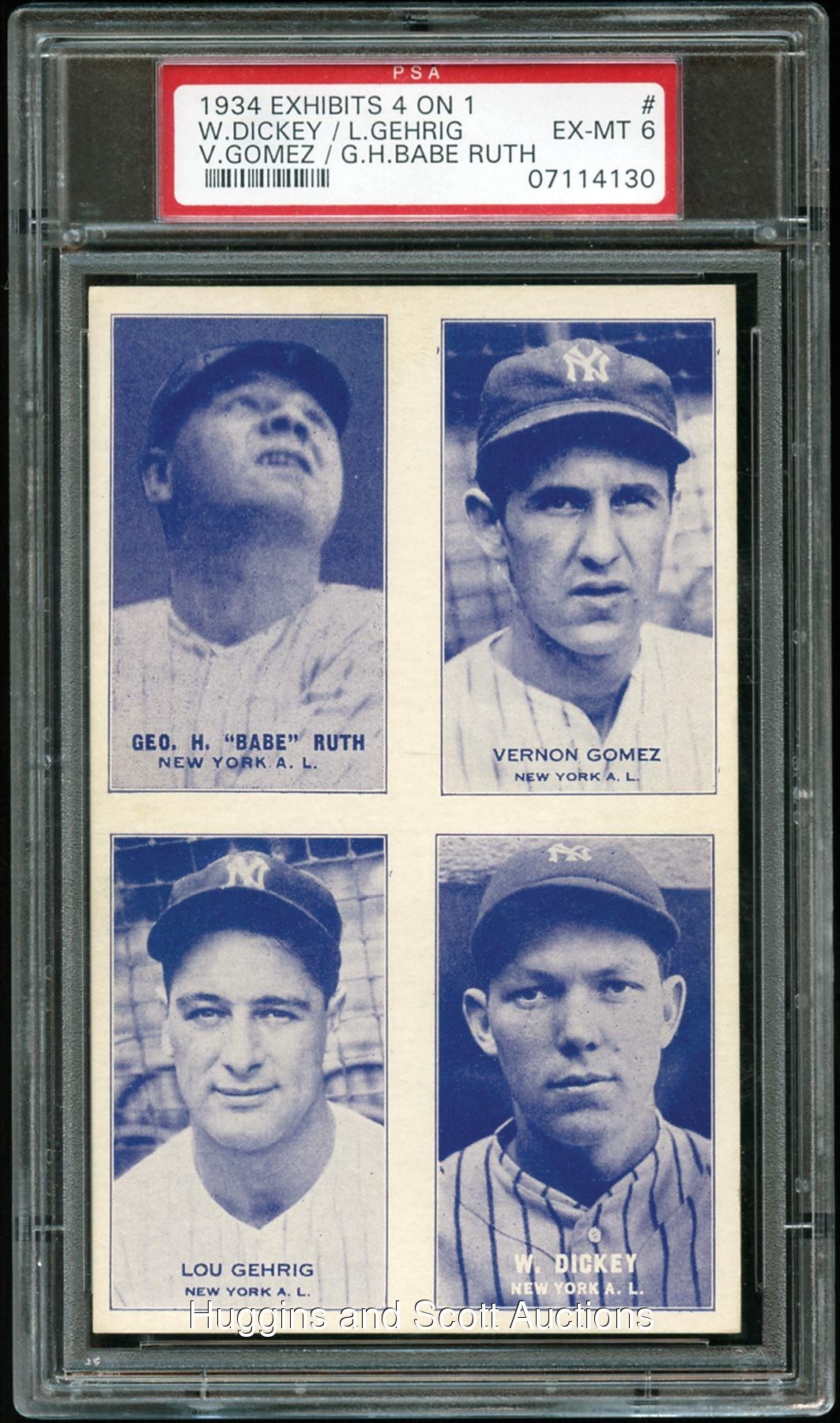 Graded EX-MT 6 by PSA. The core of 1930s pinstripe dominance is depicted with the offered 1934 Exhibits 4 on 1 with Ruth/Gehrig/Gomez/Dickey. These Hall of Famers with pinpoint centering and a clear surface registration are detracted by only touches of wear on the well-defined corners. One of two at the grading tier with none better.