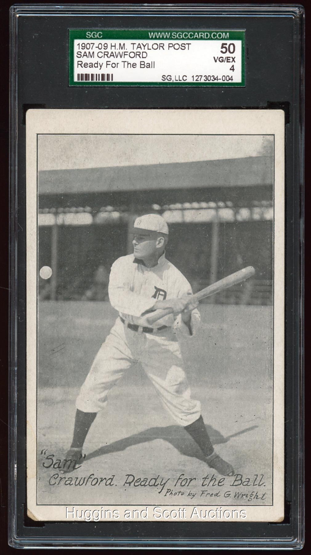Graded 50 VG-EX 4 by SGC. The pre-war Hall of Fame specialist will go "Wahoo" for the offered 1907-09 H.M. Taylor Sam Crawford postcard. This scarce correspondence item is crease-free with moderate perimeter wear and a clean reverse. The highest graded of three such examples confirmed by the third-party service.