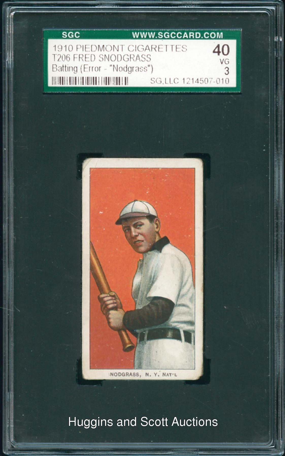 Graded 40 VG 3 by SGC. In eternal infamy for his gaffe in the 1912 World Series, New York Giants outfielder Fred Snodgrass was the subject of a separate "error" prior to his monumental October blunder. Specifically, his 1910 T206 card had a sparse number of examples on which his surname was spelled "NODGRASS." Offered is one such specimen. Among those with the "Piedmont" reverse, this is the lone example at its tier with only one better. This version exhibits prominent colors with corner wear consistent with the technical grade.