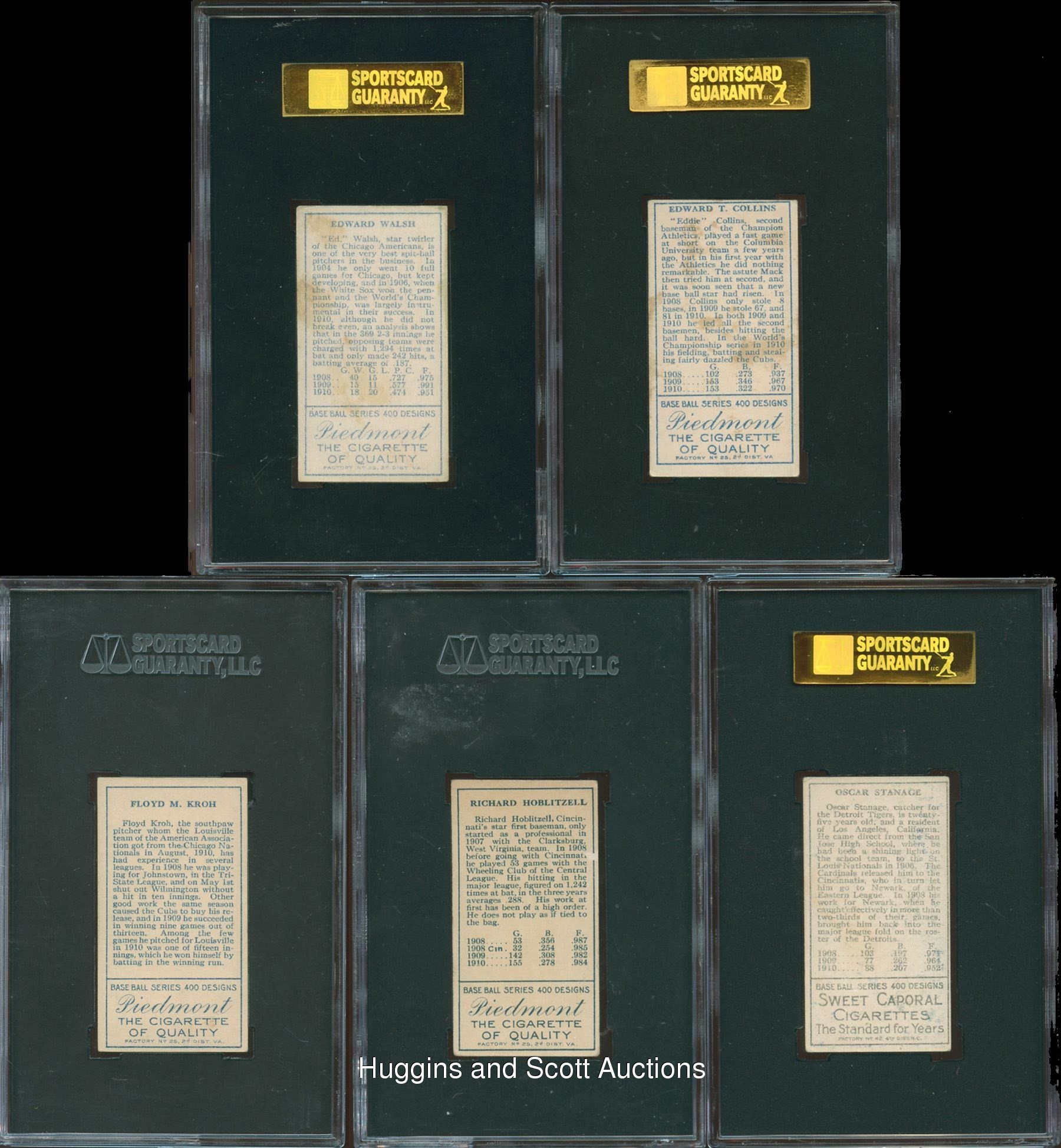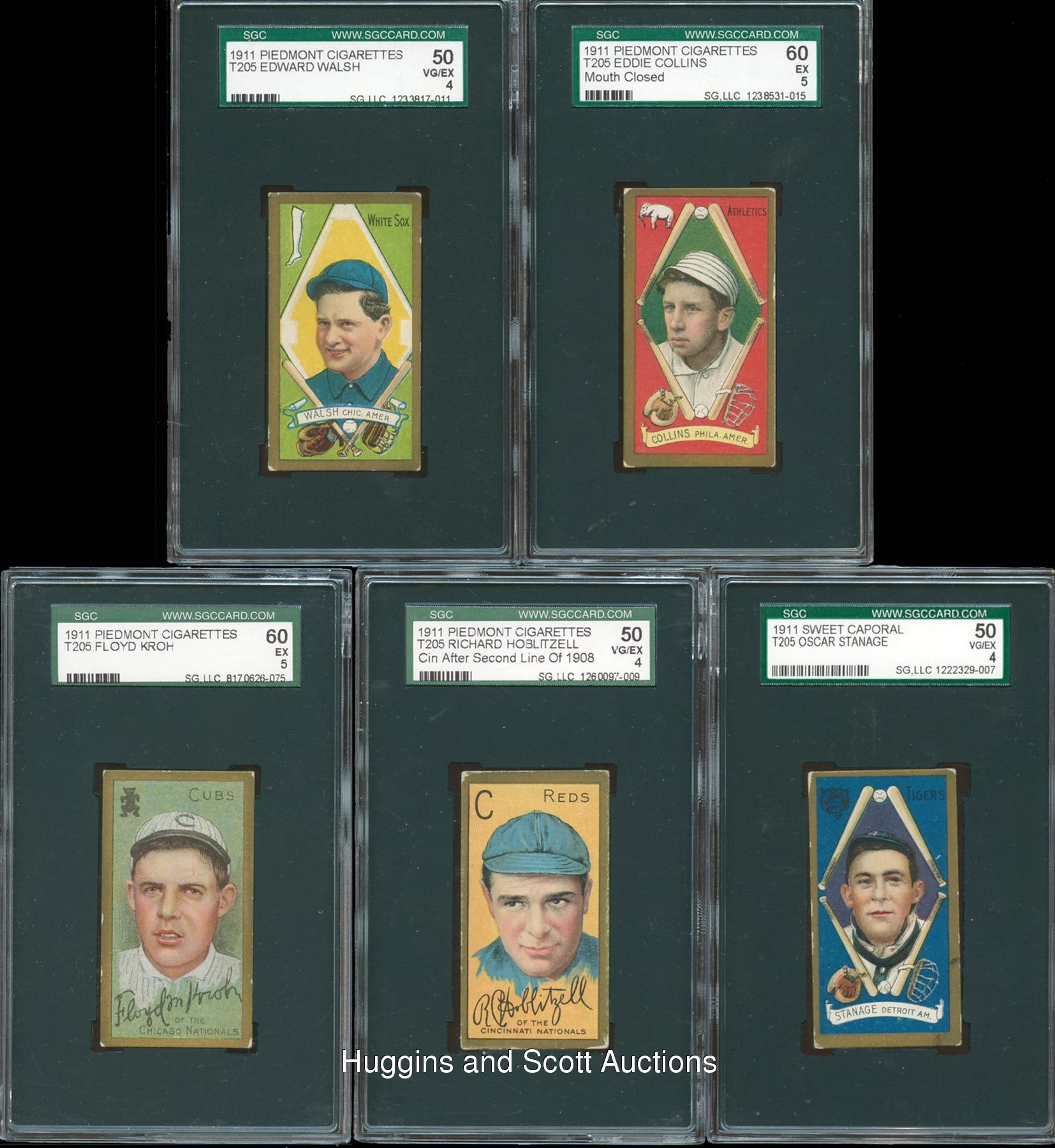 Each graded either 60 EX 5 or 50 VG-EX 4 by SGC. Presented is a grouping of five 1911 T205 Gold Border singles with either Piedmont or Sweet Caporal reverses. Included are SGC 60: (2 cards) with E. Collins (mouth closed), Kroh; SGC 50: (3 cards) with Hoblitzell (Cin. after second line of 1908), Stanage and Walsh.