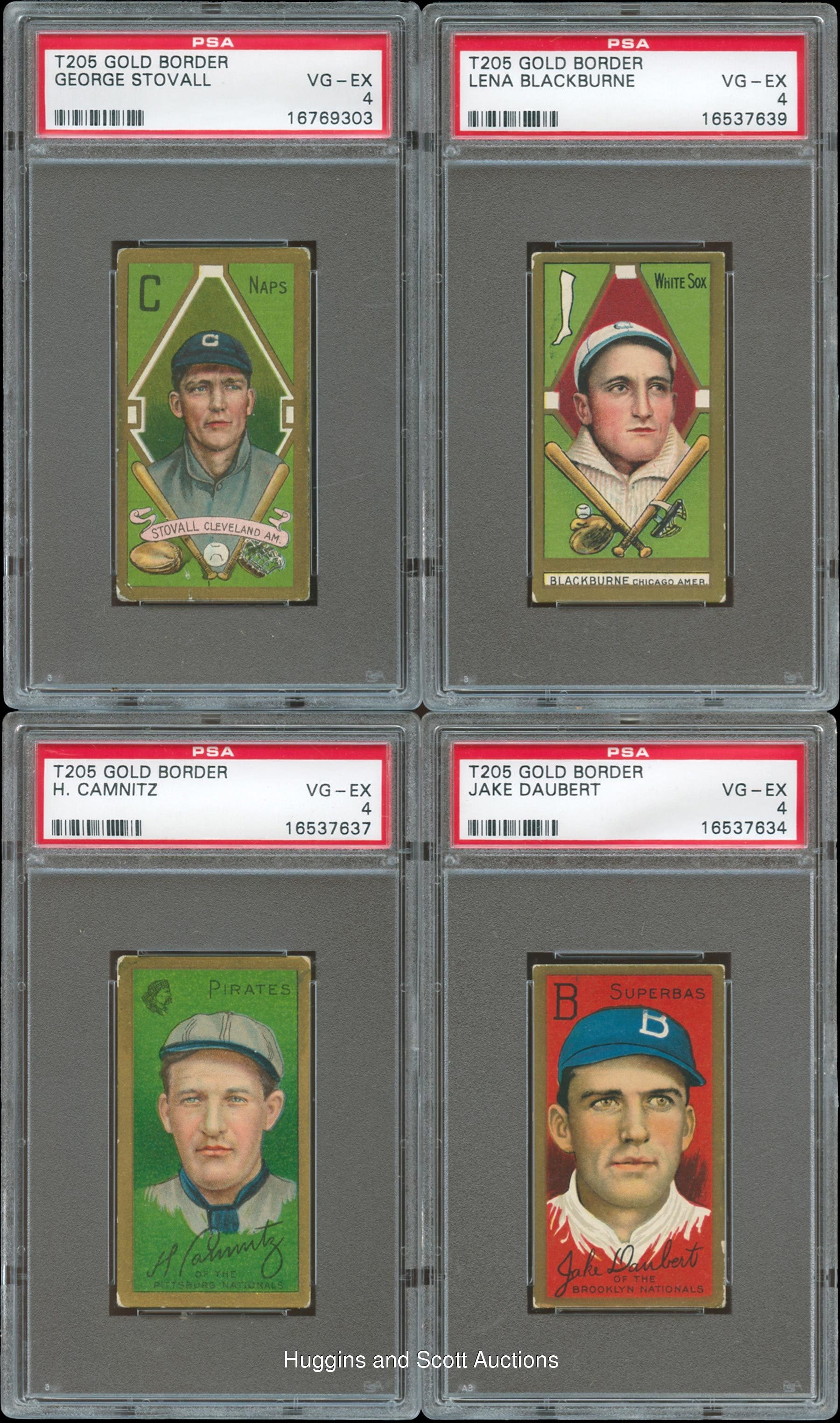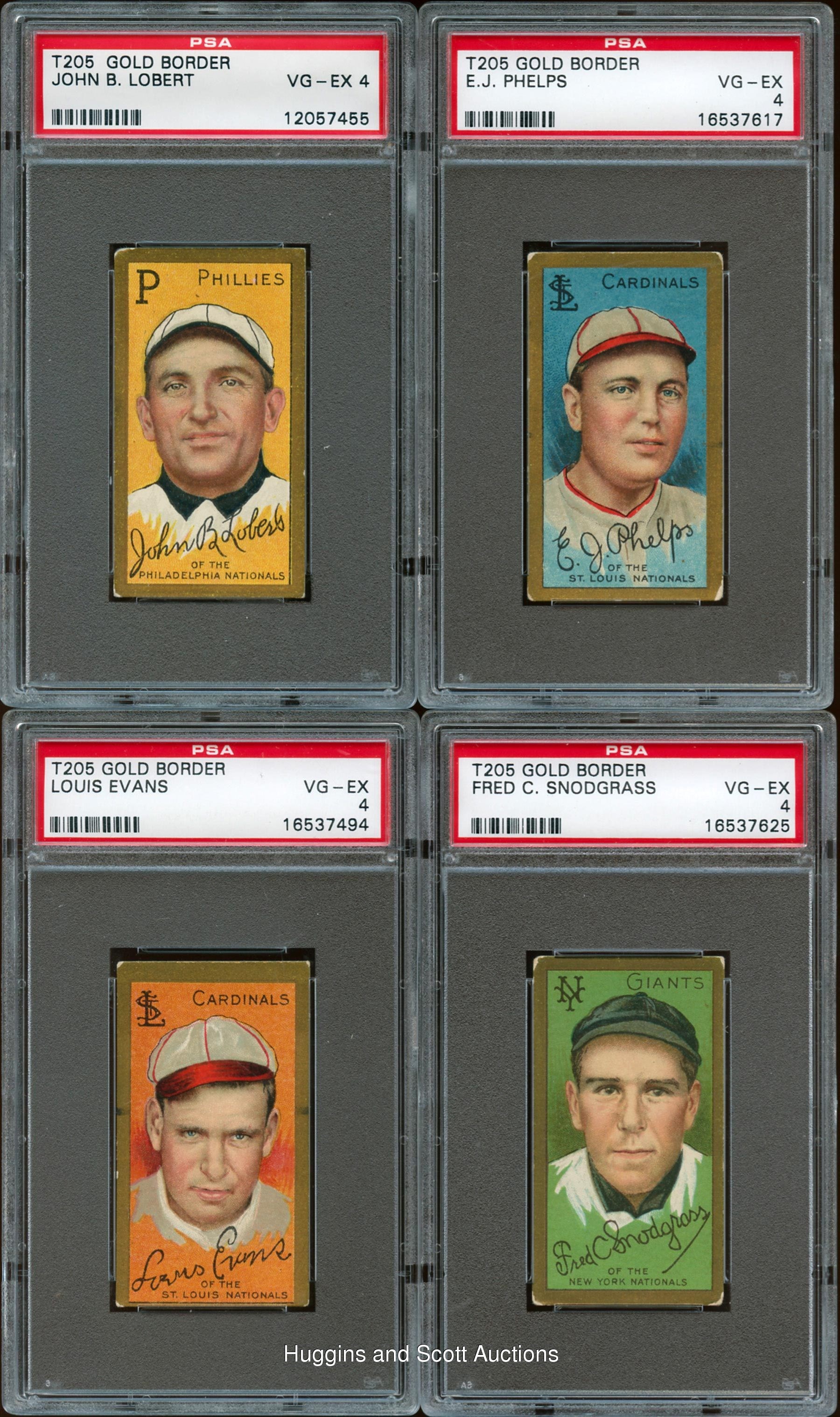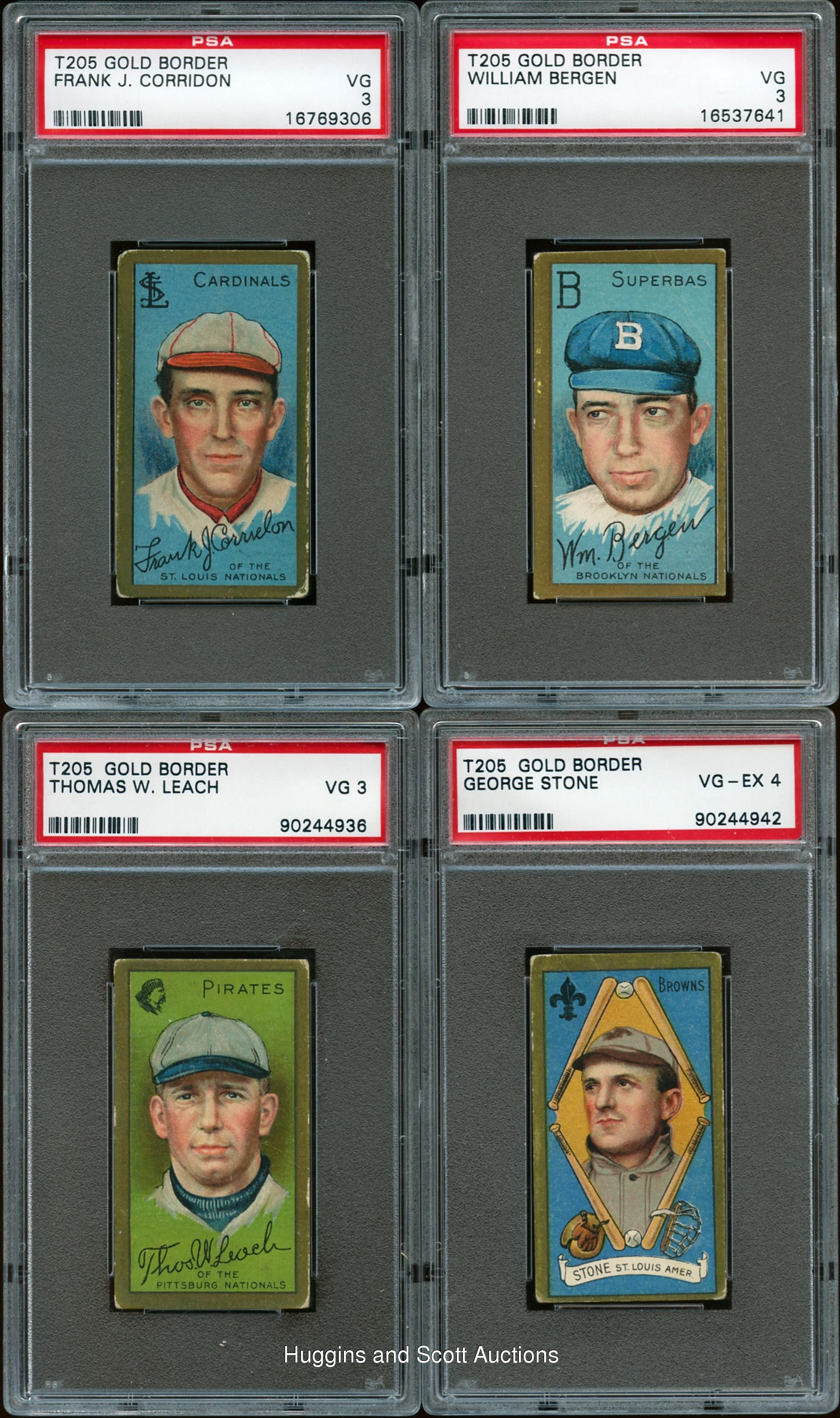 Get a jump on the acclaimed 1911 T205 Gold Border series with these (25) PSA graded singles. Included are PSA 4: (14 cards) with Barger (full “B” on cap), Blackburne, Camnitz, Daubert, Devore, Evans, Fletcher, Graham (Rustlers), Lobert, Phelps, Shean (Rustlers), Snodgrass, Stone, Stovall; PSA 3: (7 cards) with Bergen, Carrigan, Chance, Corridon, Jacklitsch, Latham (A. Latham on Back), Leach; PSA 2.5: Wilson; PSA 2: Mattern; PSA 1: (2 cards) with Scott and Sharpe. Each of these accurately graded cards displays either a Piedmont or Sweet Caporal back.