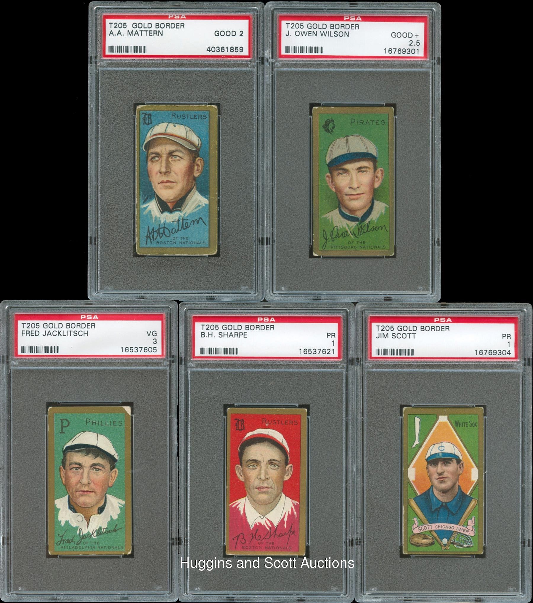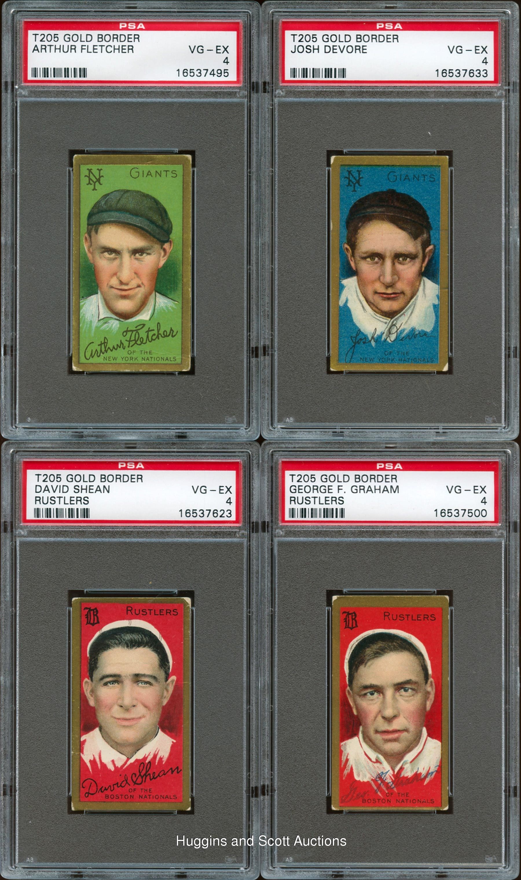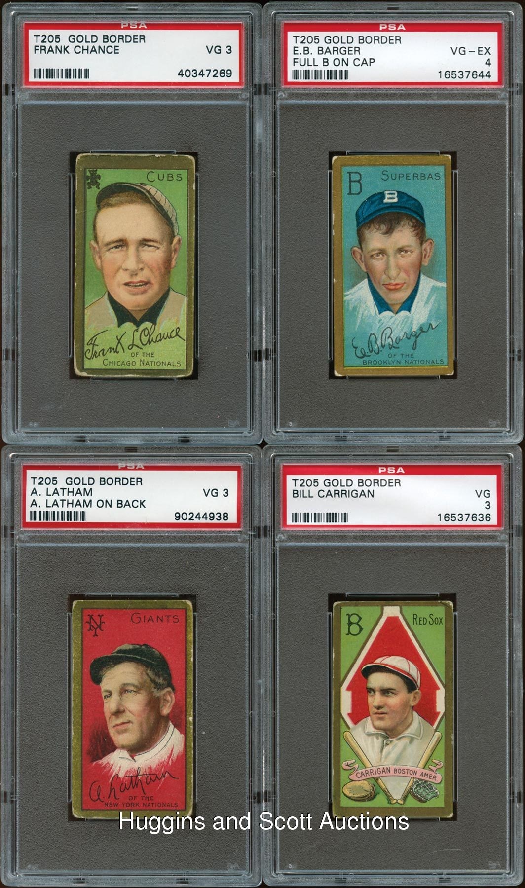 Get a jump on the acclaimed 1911 T205 Gold Border series with these (25) PSA graded singles. Included are PSA 4: (14 cards) with Barger (full “B” on cap), Blackburne, Camnitz, Daubert, Devore, Evans, Fletcher, Graham (Rustlers), Lobert, Phelps, Shean (Rustlers), Snodgrass, Stone, Stovall; PSA 3: (7 cards) with Bergen, Carrigan, Chance, Corridon, Jacklitsch, Latham (A. Latham on Back), Leach; PSA 2.5: Wilson; PSA 2: Mattern; PSA 1: (2 cards) with Scott and Sharpe. Each of these accurately graded cards displays either a Piedmont or Sweet Caporal back.
