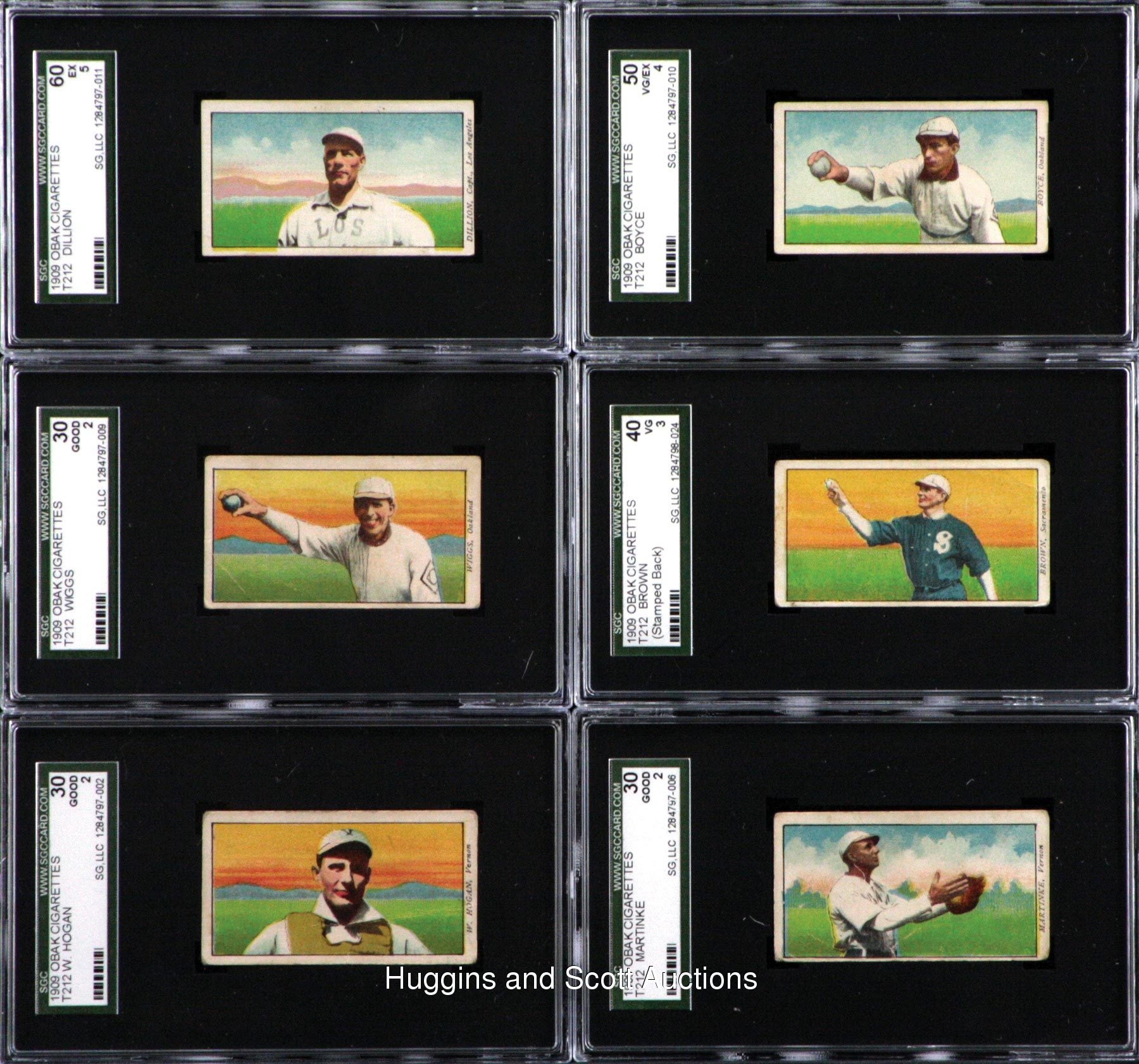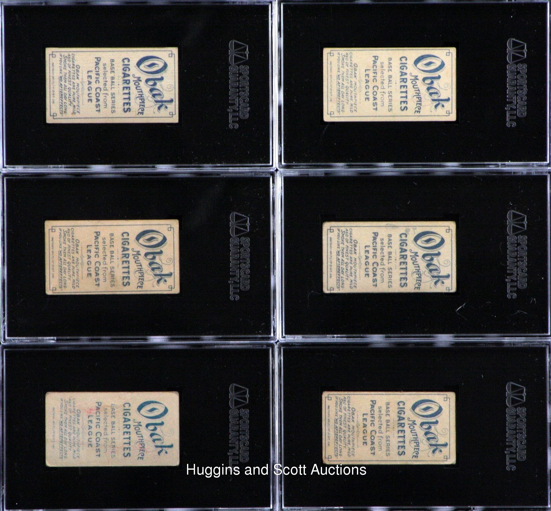View your favorite Pacific Coast League star from a different perspective with these six 1909 T212-1 Obak horizontal samples. Included are gorgeous renderings of SGC 60: Dillion; SGC 50: Boyce; SGC 40: Brown (stamped back); SGC 30: (3 cards) with W. Hogan, Martinke and Wiggs. The Old English script reverses are clean.