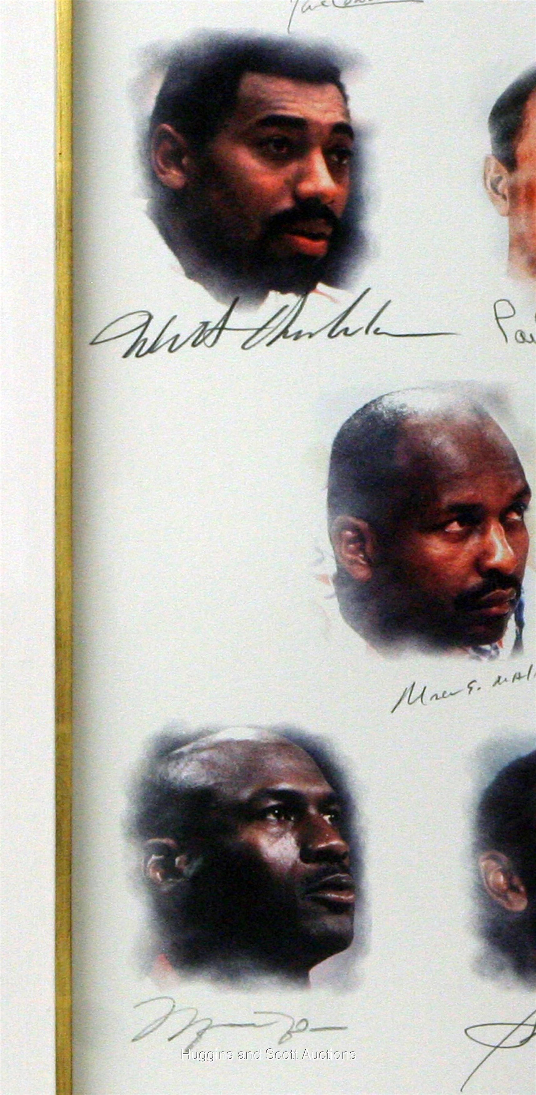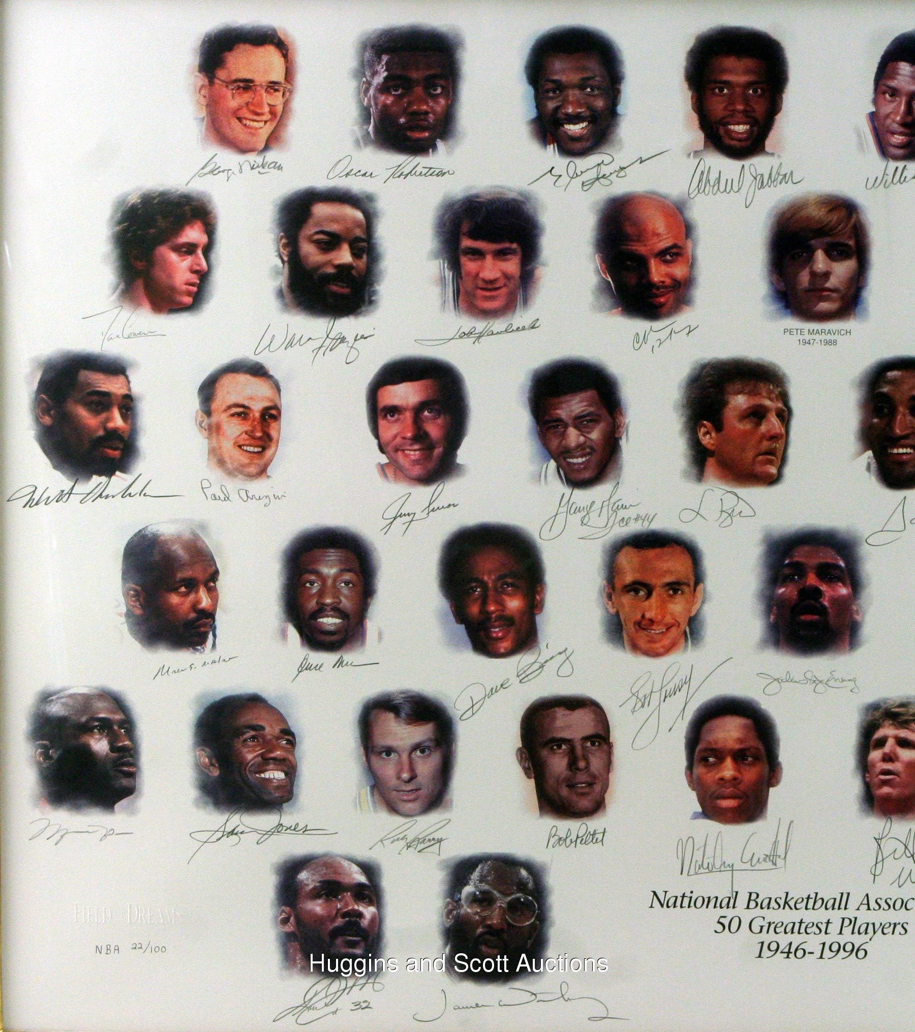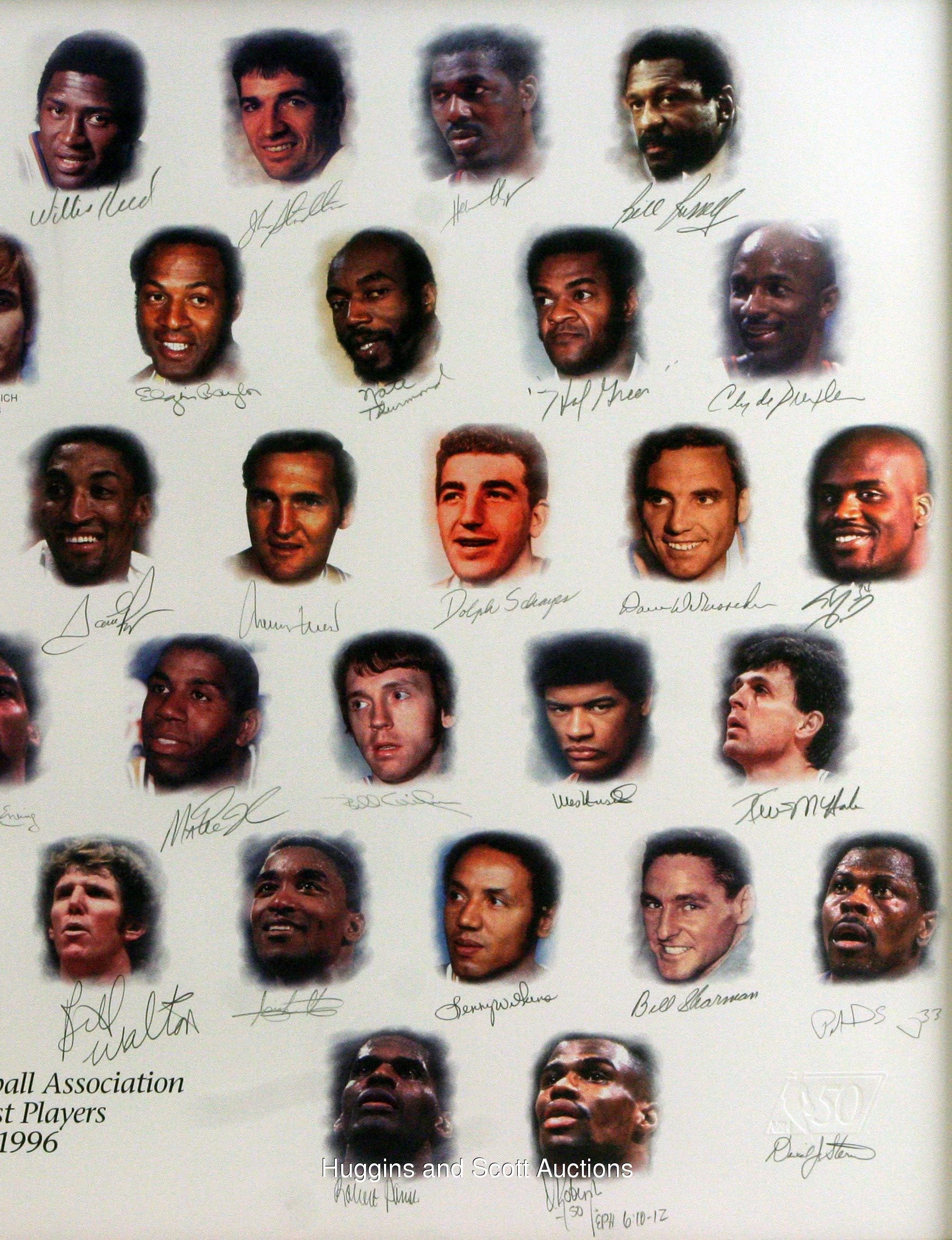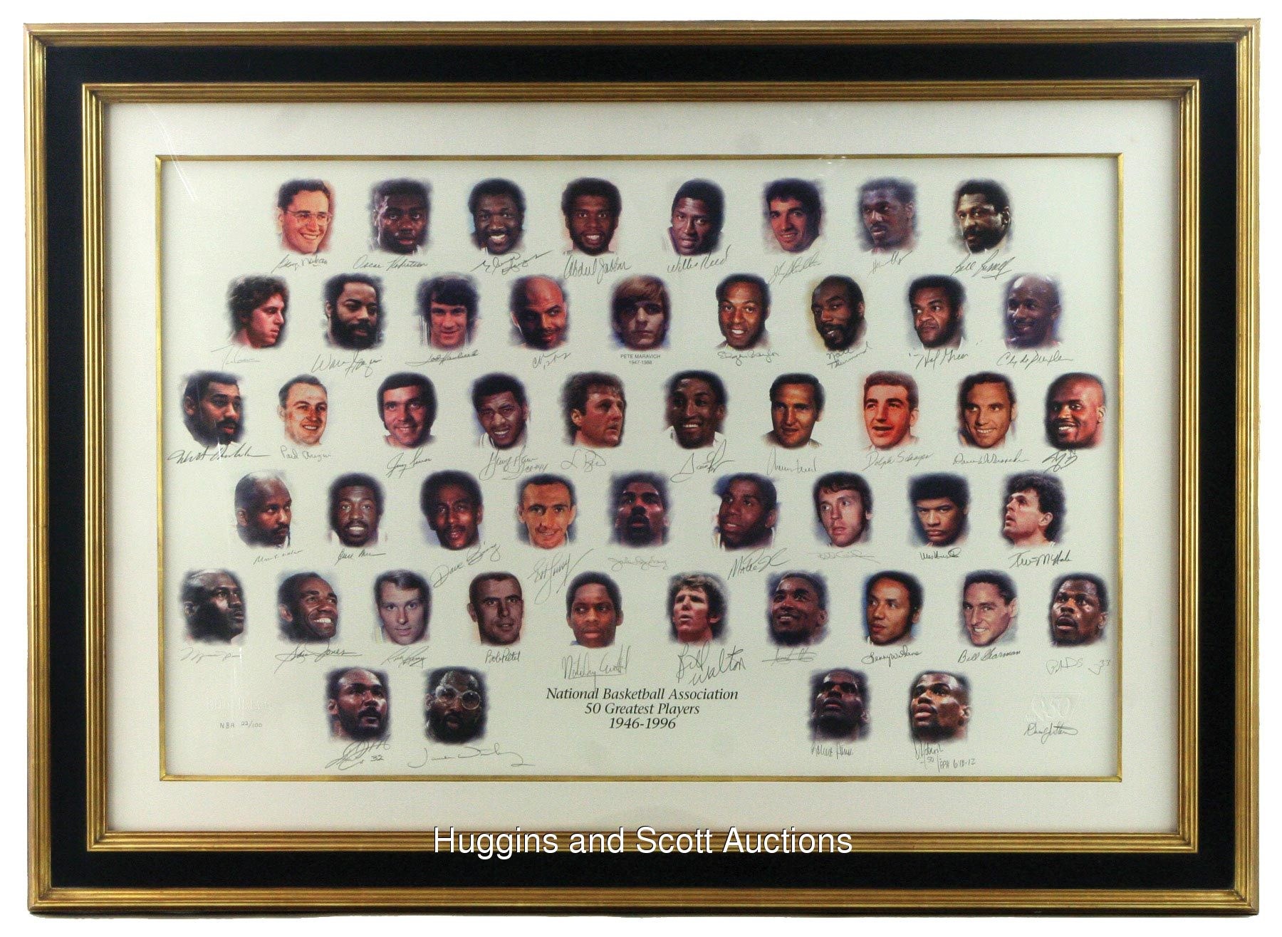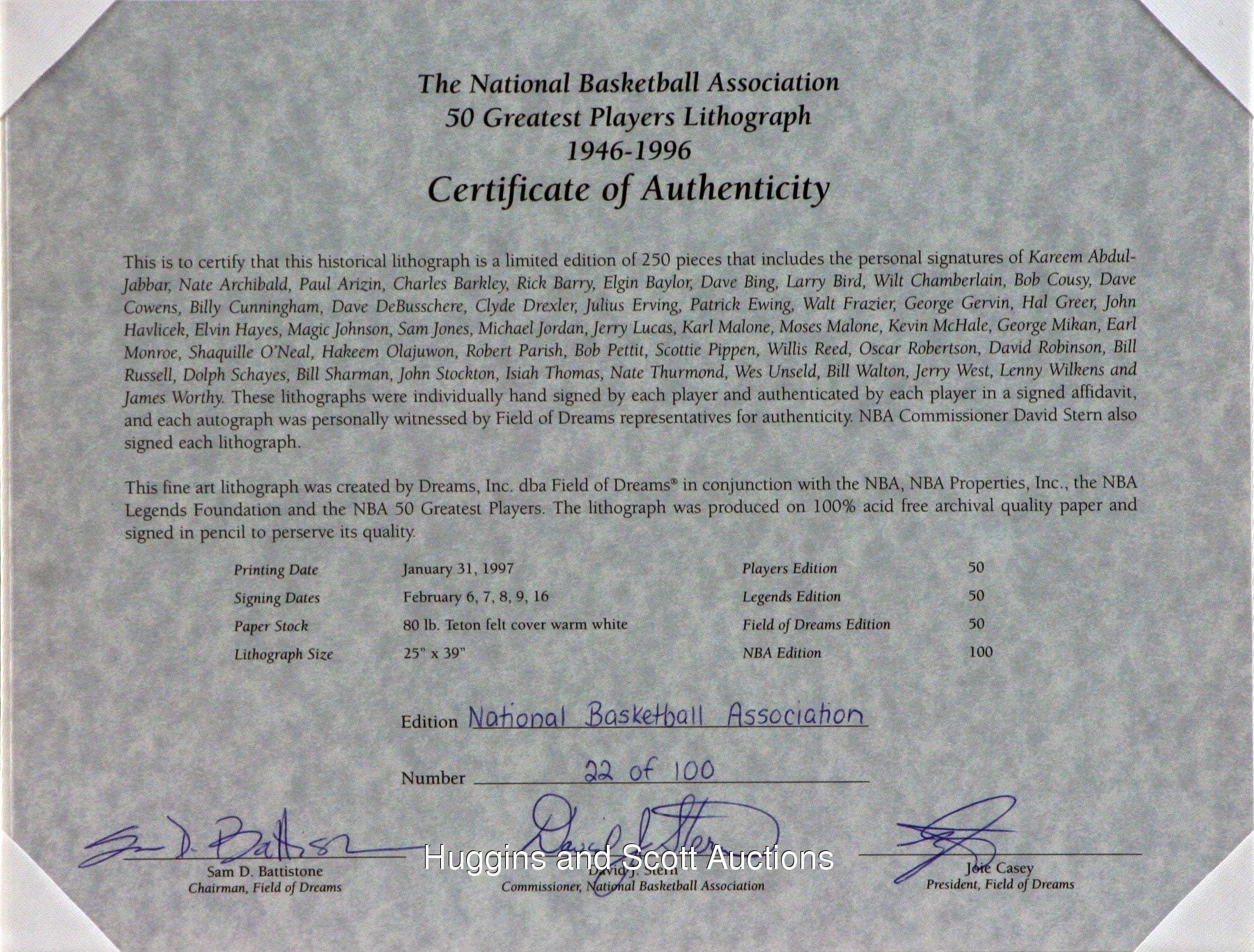 The circumstances were most appropriate. The numbers were astounding. The celebration was justified. In October 1996 at New York’s Grand Hyatt Hotel (the site of the former Commodore Hotel where the NBA’s original charter was signed 50 years earlier), Commissioner David Stern announced the league’s “50 Greatest Players” since that opening tip back in 1946. To that date, esteemed members had amassed 107 championships, 447 All-Star Game selections and 923,791 points. While we’re counting, let us behold the bold signatures of (49) of those legendary hardwood performers.Framed to dimensions of 35-1/4 x 48-1/4”, a gorgeous limited edition (22/100) NBA Edition lithograph has been composed by “Dreams, Inc.” on acid-free archival quality paper. Those 50 iconic players are portrayed in full color with graphite pencil endorsements (average “8-9” strength) serving as identifiers (with the lone exception of Pete Maravich, who passed away in 1988 and was posthumously named to the team).Autographs include: Abdul-Jabbar, Archibald, Arizin, Barkley, Barry, Baylor, Bing, Bird, Chamberlain, Cousy, Cowens, Cunningham, DeBusschere, Drexler, Erving, Ewing, Frazier, Gervin, Greer, Havlicek, Hayes, Johnson, Jones, Jordan, Lucas, K. Malone (inscribed “32”), M. Malone, McHale, Mikan, Monroe, O’Neal, Olajuwon, Parish, Pettit, Pippen, Reed, Robertson, Robinson (inscribed “EPH 6:10-12”), Russell, Schayes, Sharman, Stockton, Thomas, Thurmond, Unseld, Walton, West, Wilkens and Worthy (Stern has also signed the piece).Accompanying is a COA signed by Stern, as well as by Joie Casey (President, Field of Dreams) and Sam Battistone (Chairman, Field of Dreams). This item has a reserve (estimated value $25,000-$50,000)Note: due to the size of this lot, a shipping surcharge will apply.In all, (250) of these were produced, with a distribution breakdown as follows: Players Edition (50); Legends Edition (50); Field of Dreams Edition (50); NBA Edition (100)Frames included with lots: while we make every effort to protect the frames included in these lots during pre-auction storage and post-auction shipping, we are not responsible for any damage to the frames themselves, and no refunds will be given due to frame damage.