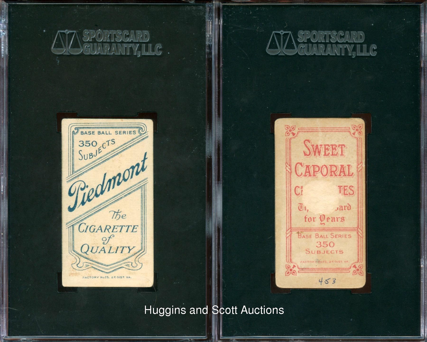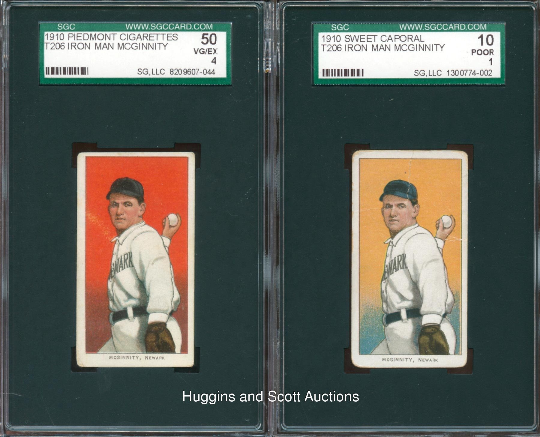T206 Master Set Collectors! The durable Joe (Iron Man) McGinnity twirls on this pair of 1909-11 T206 White Borders. Color variations of this Hall of Famer includes 1.) Red Background (SGC 50) with a Piedmont advertising back and 2.) Orange Background (SGC 10) with a Sweet Caporal advertising back. Displays reverse paper loss and writing while the obverse presents (GD) with mild creasing.