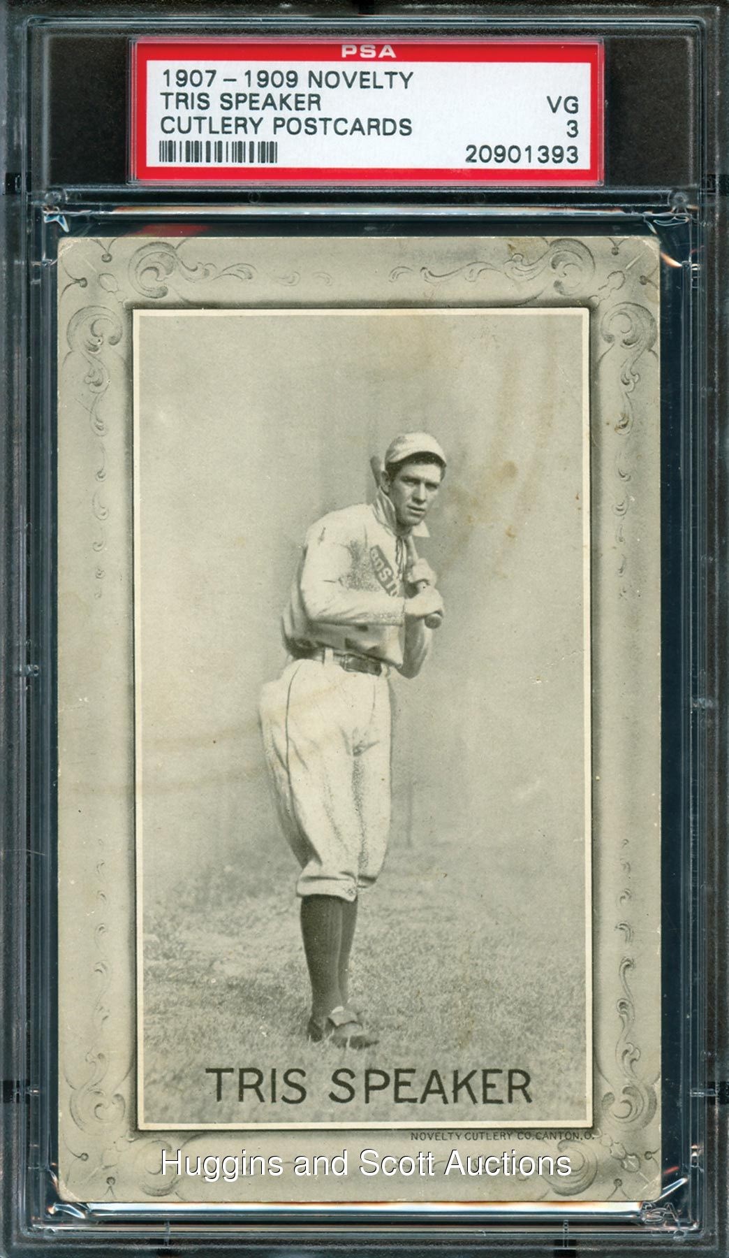 Among his many achievements Tris Speaker has held the career record for doubles for more than eight decades. Double your pleasure with this 1907-1909 Novelty Cutlery Co. Tris Speaker rookie card which combines handsome composition with true scarcity for a highly desirable collectible. Graded (PSA 3) this rare relic features Speaker in a menacing batting stance framed by an Acanthus leaf scroll design on the obverse, while the reverse is laid out in traditional postcard format. Measuring a standard 3-1/2 x 5-1/2” this unused cardboard classic merits considerable attention