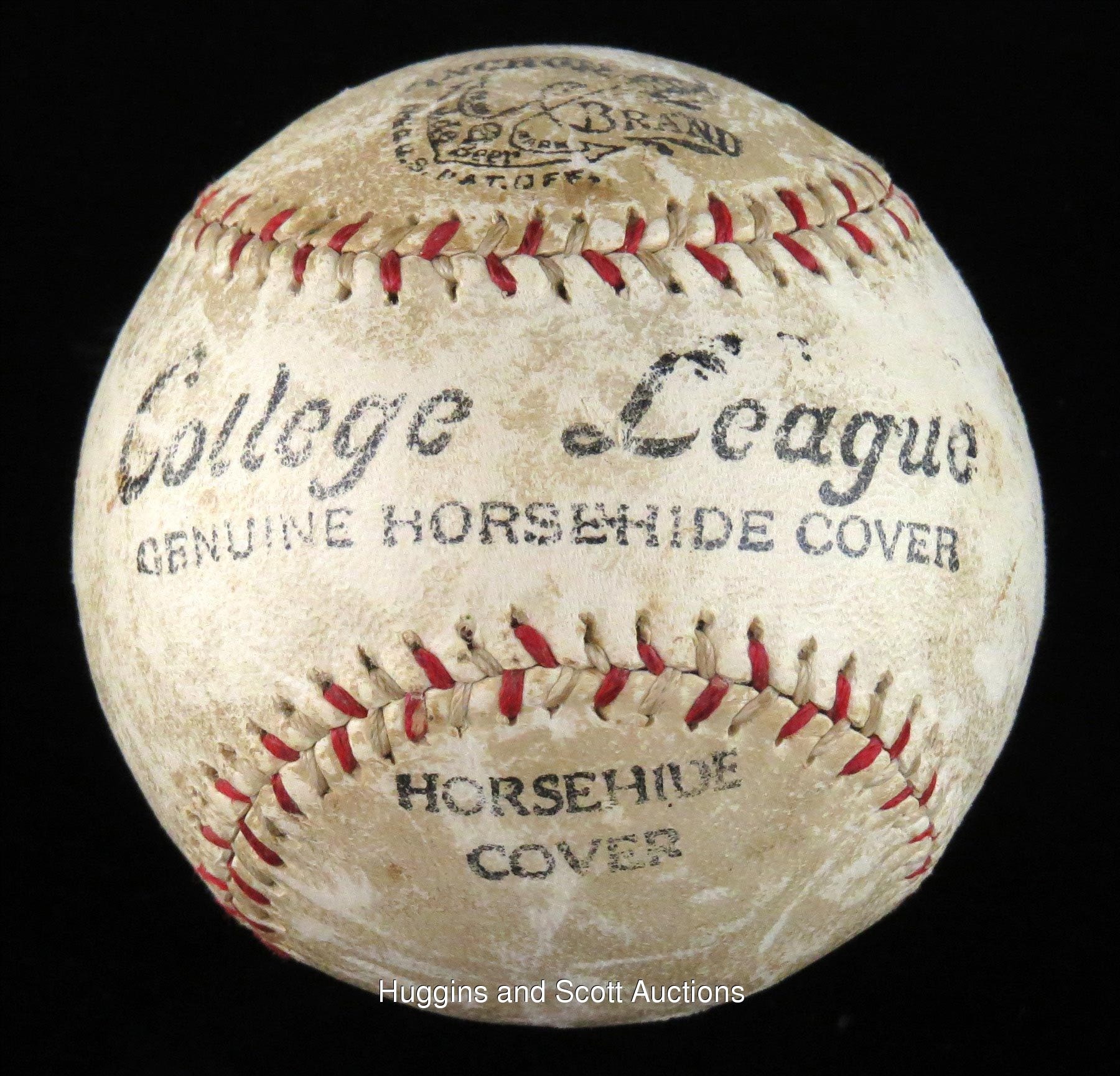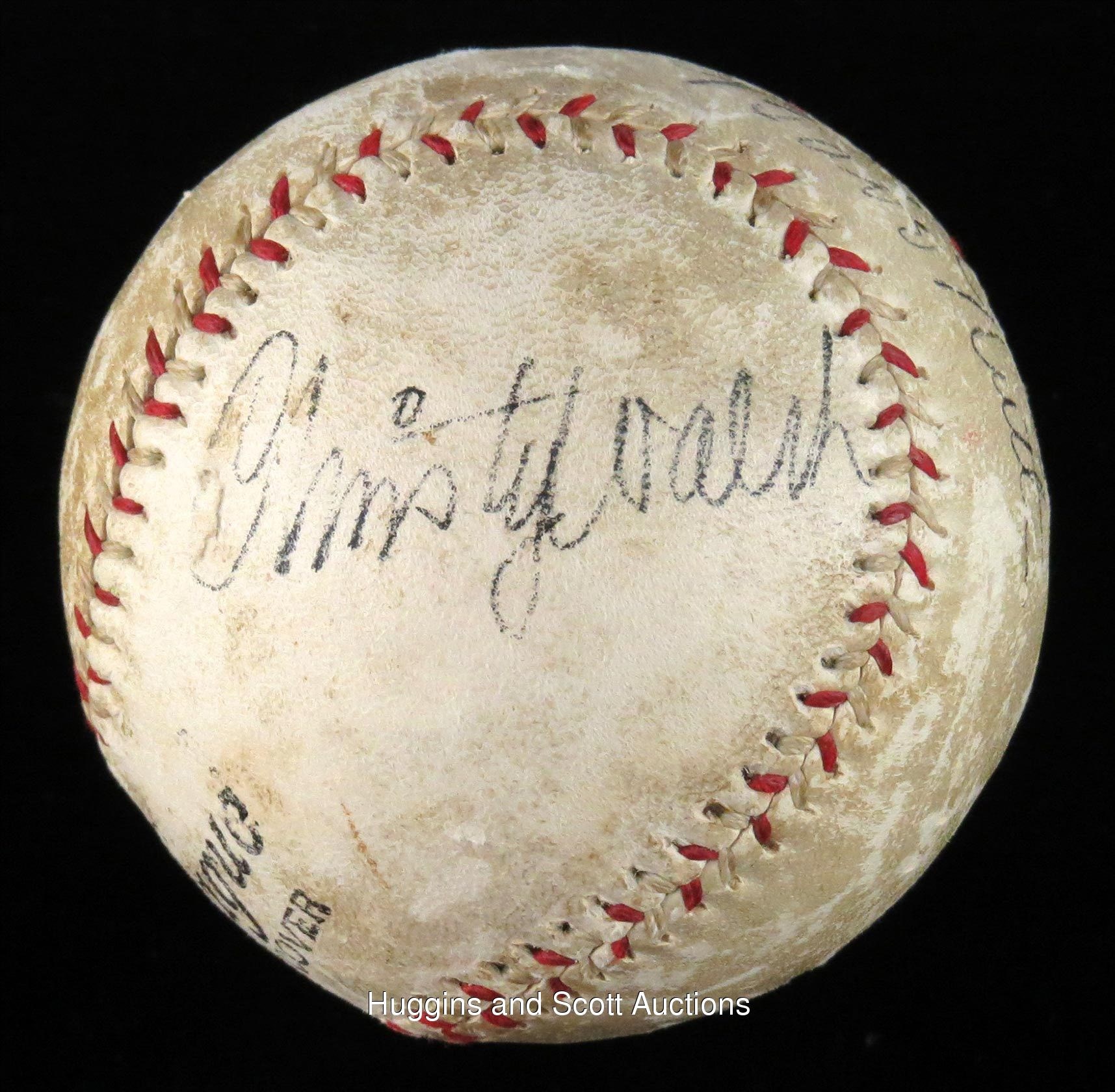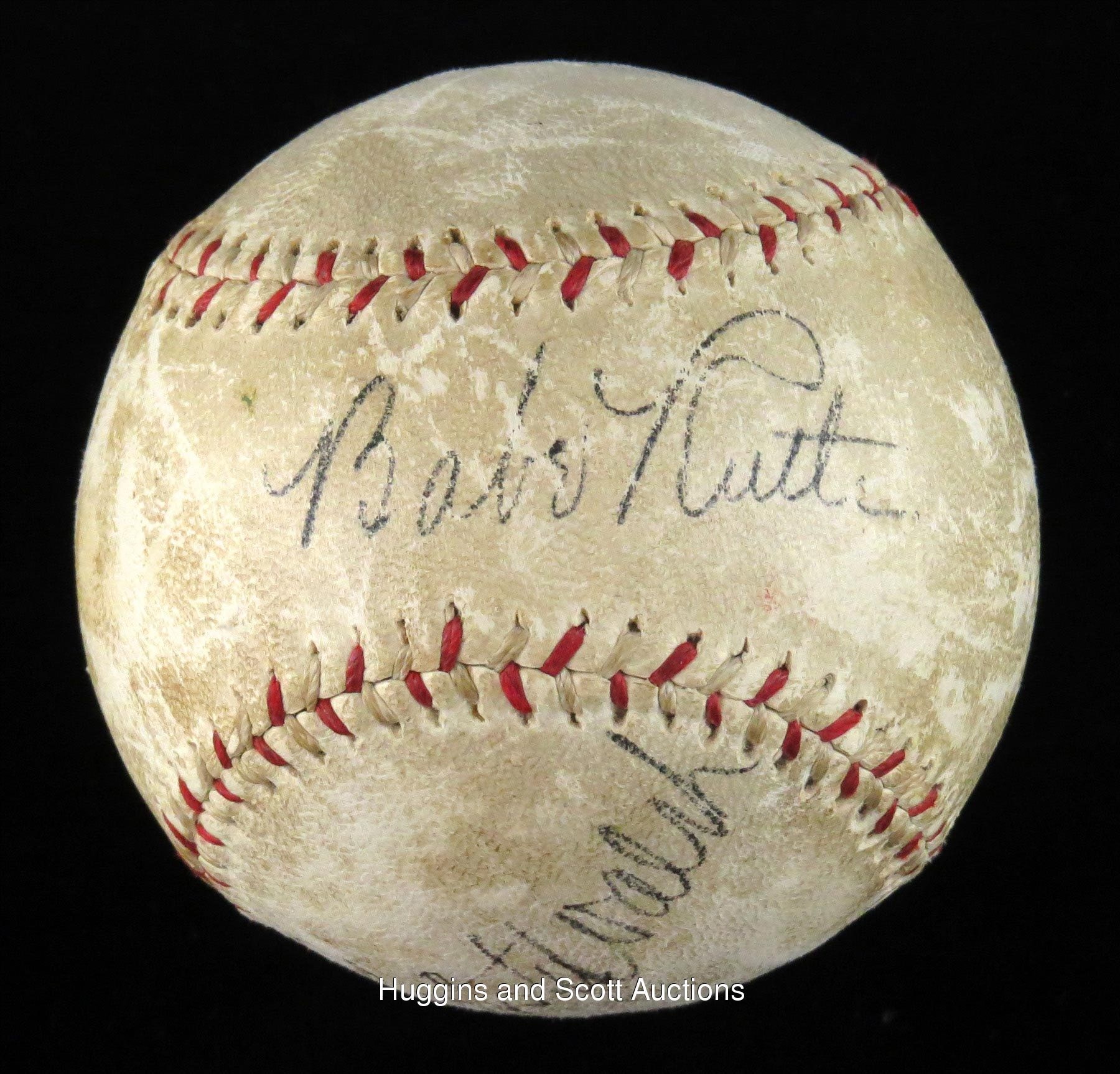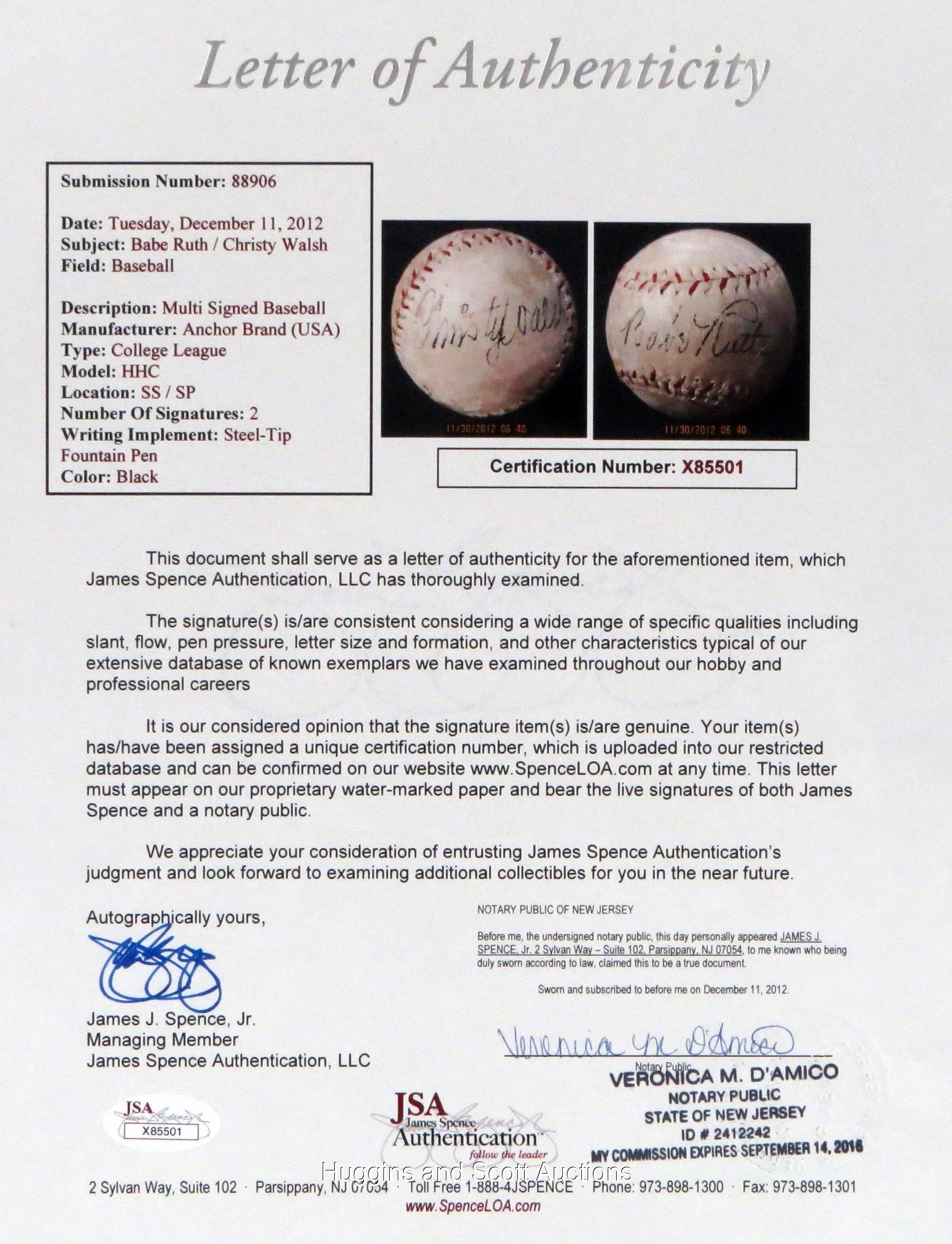 Just 103 home runs into his mythical career, before his new suitors, the New York Yankees, had ever appeared in a Fall Classic (an event they would come to define), 26 year-old Babe Ruth was the sizable and primary target for commercial and publicity opportunists. Thanks to fate and perseverance, one such agent “landed” Ruth and enjoyed a subsequent friendship to which no other partnership in the history of American sport can compare. Wondrous sentiments regarding that pairing are prompted by this rare and unusual keepsake: a baseball signed by Babe Ruth and his longtime business partner, Christy Walsh.The subject of headlines after launching a record 29 round-trippers in 1919, Ruth’s star soared to dizzying heights following his 54-homer effort in the 1920 campaign, his first in the white-hot New York spotlight. Complying with all of the publicists at first, Ruth soon felt the smothering effects and quickly shunned all requests. Enter Walsh, a former sports cartoonist and ghost writer who made his mark with syndicated accounts of World War I flying ace Eddie Rickenbacker. To Ruth, however, Walsh was just another in a long line of parasites and thus, the Baltimore-born slugger would hear none of his proposals. Only happenstance got Walsh face to face with Ruth. With Prohibition in effect before the 1921 season, Walsh found himself in the delicatessen that delivered Ruth his bootleg beer. Hearing that the normal delivery boy was absent, Walsh alertly volunteered to deliver the beer to Ruth’s lavish Ansonia Hotel quarters. Once inside (and the recipient of a generous tip), Walsh went to work, asking Ruth how much he was paid by United Press in 1920 for his personal accounts of 54 home runs. When Ruth conveyed that he had earned five dollars per story, Walsh countered with an offer of “500 dollars for anything you write.” And so began a 15-year partnership of syndicated coverage that proved quite lucrative to both.Along the way, the pair decorated this unofficial sphere with their bold endorsements. The off-white “Anchor Brand” orb (grade “6”) is affected by a series of minor abrasions. In its customary occupancy of the sweet spot, Ruth’s black-ink fountain penning projects (“6-7”) strength and clarity, with aforementioned abrasions preventing even higher assessment. On the south panel, Walsh’s scripting projects similar qualities and completes a rarely seen pairing of Ruth and his famed agent on the same medium. The occasion was, with high probability, one of the lucrative barnstorming tours at which Ruth supplemented his sizable income. According to the consignor, the original recipient was a former Marquette University student who obtained the souvenir directly from Ruth and Walsh at Milwaukee's Pfister Hotel sometime between 1931 and 1934.Accompanying is a full photo LOA from JSA. This item has a reserve (estimated value: $9000-$12,000).
