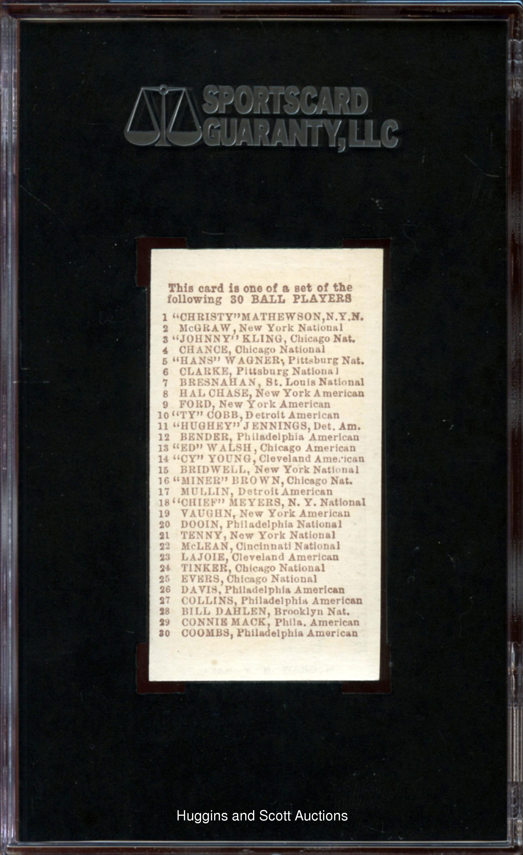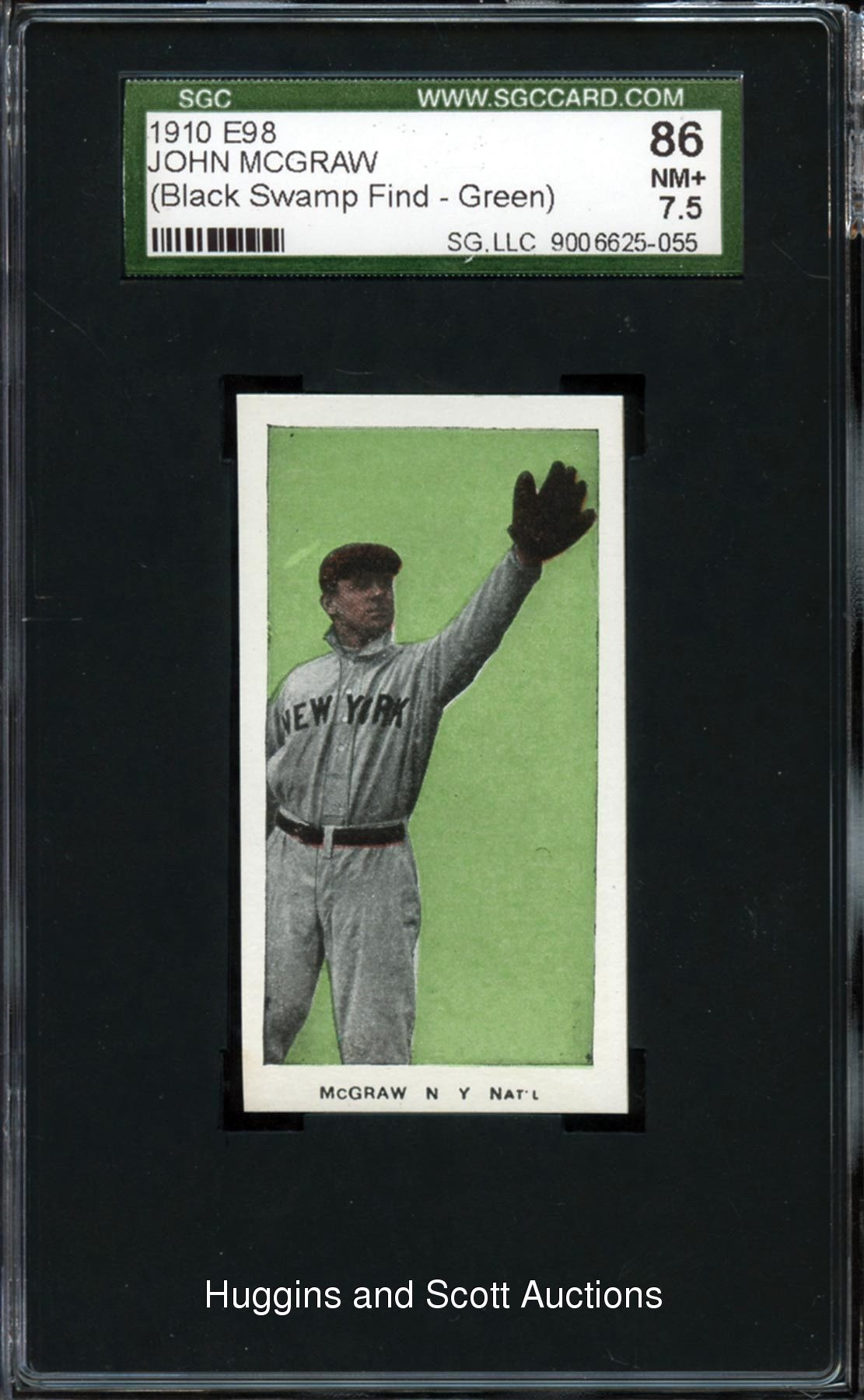 Graded 86 NM+ 7.5 by SGC. It's the stuff that hobby dreams are made of. This 1910 E98 John McGraw (green) was one of nearly 700 cards from the designation uncovered by a Defiance, Ohio family in 2012. Resting untouched for over a century, these pristine specimens were discovered in a box in an attic. Each card stack was tightly secured by antique twine and had entirely escaped the harsh elements. The Hall of Fame McGraw meets the stringent criteria for the technical assessment with razor-sharp corners, creamy edges and "dead" centering. The checklist back is clean. One of three at the grading level with only two better.