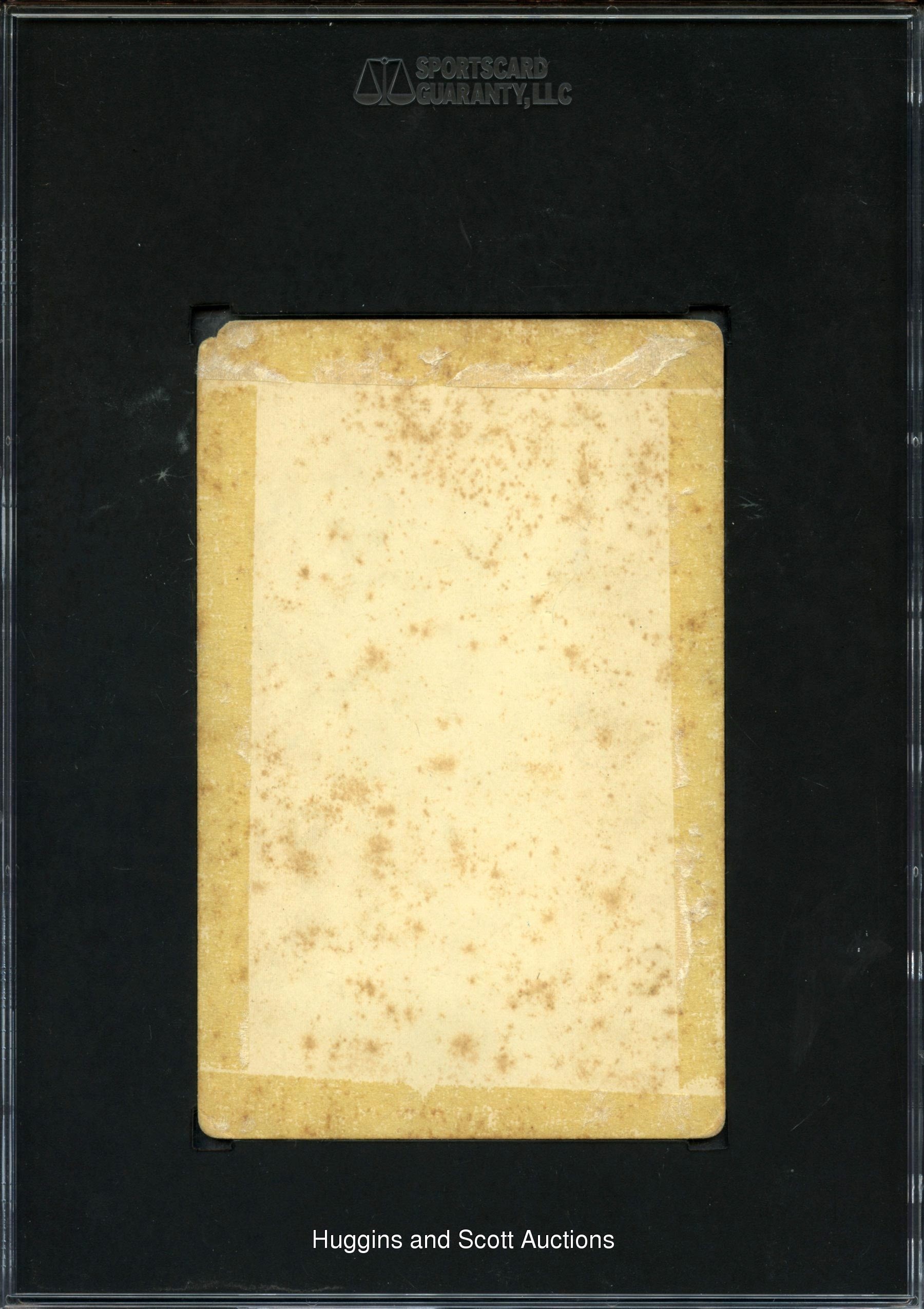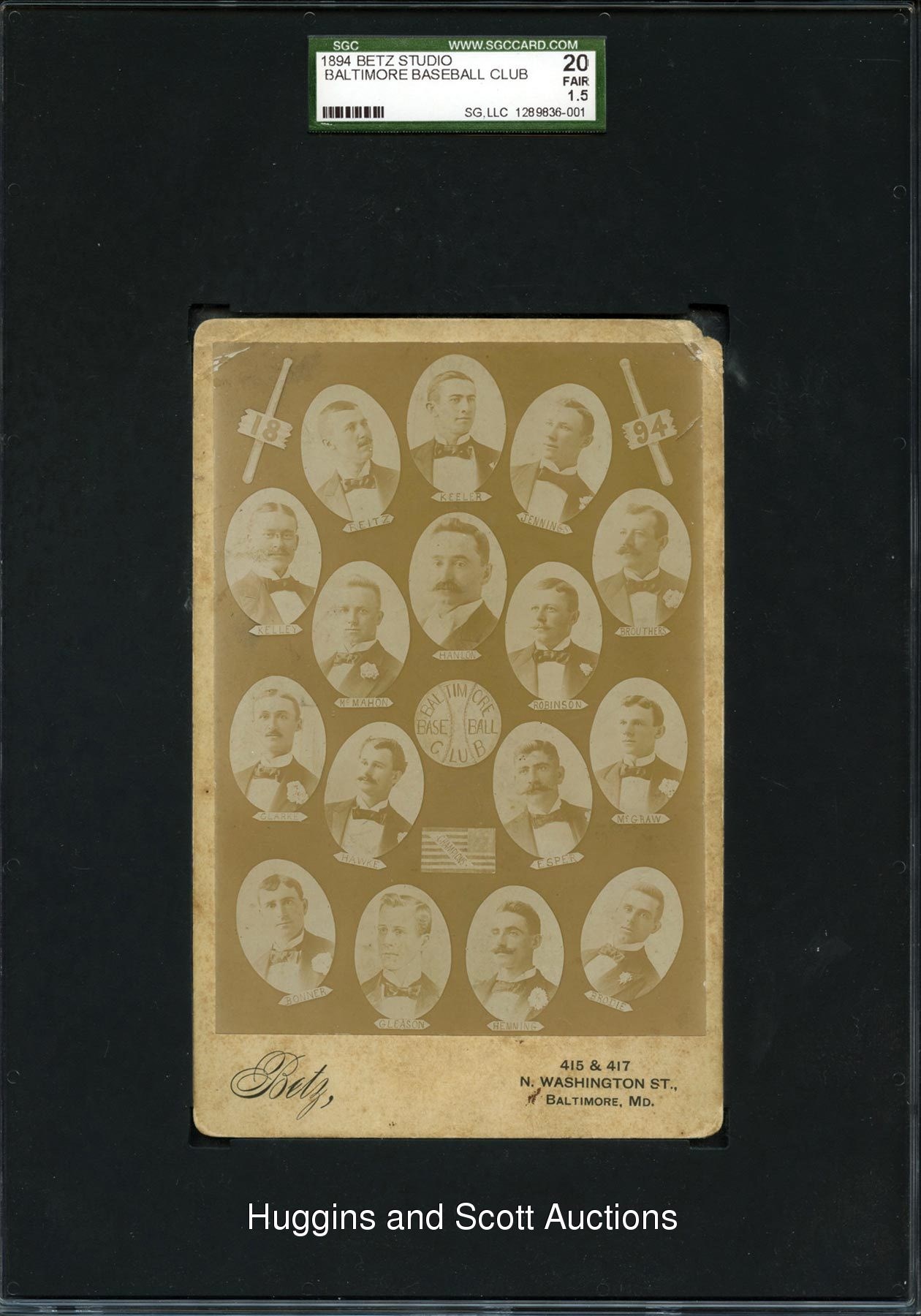 Often vilified by foes and the late nineteenth century press as a foul-mouthed group of cheats, in reality, the 1890s Baltimore Orioles were a dynasty which fielded numerous Hall of Famers and used “small ball” along with sound defensive principles to appear in four straight Temple Cup series. Graded 20 Fair 1.5 by SGC. Produced by the Betz Studio of N. Washington St. in Baltimore, the offered 1894 Baltimore Baseball Club cabinet was released during their first title appearance. One of only four total specimens judged by SGC, the 4-1/4 x 6-1/2” antiquity pictures sixteen members of the championship squad, eight of whom would later be enshrined at Cooperstown. The cameos depict the players in formal attire complete with identifiers beneath their oval images. Subjects include: Bonner, Brodie, Brouthers, Clarke, Esper, Gleason, Hanlon, Hawke, Hemning, Jennings, Keeler, Kelley, McGraw, McMahon, Reitz and W. Robinson. The perimeter displays moderate wear and limited surface abrasions with the upper right corner sustaining additional chipping and fraying. Most importantly, the ornate design scheme of the canvas is absent of any significant detractors. The blank reverse exhibits superficial and uniform foxing due to prolonged storage. Interestingly, the poses are exact replicas of the decidedly scarce 1894 Alpha Engraving issue. An impressive nineteenth century “Charm City” diamond artifact from a season in which the Orioles first captured the hearts of their home city.