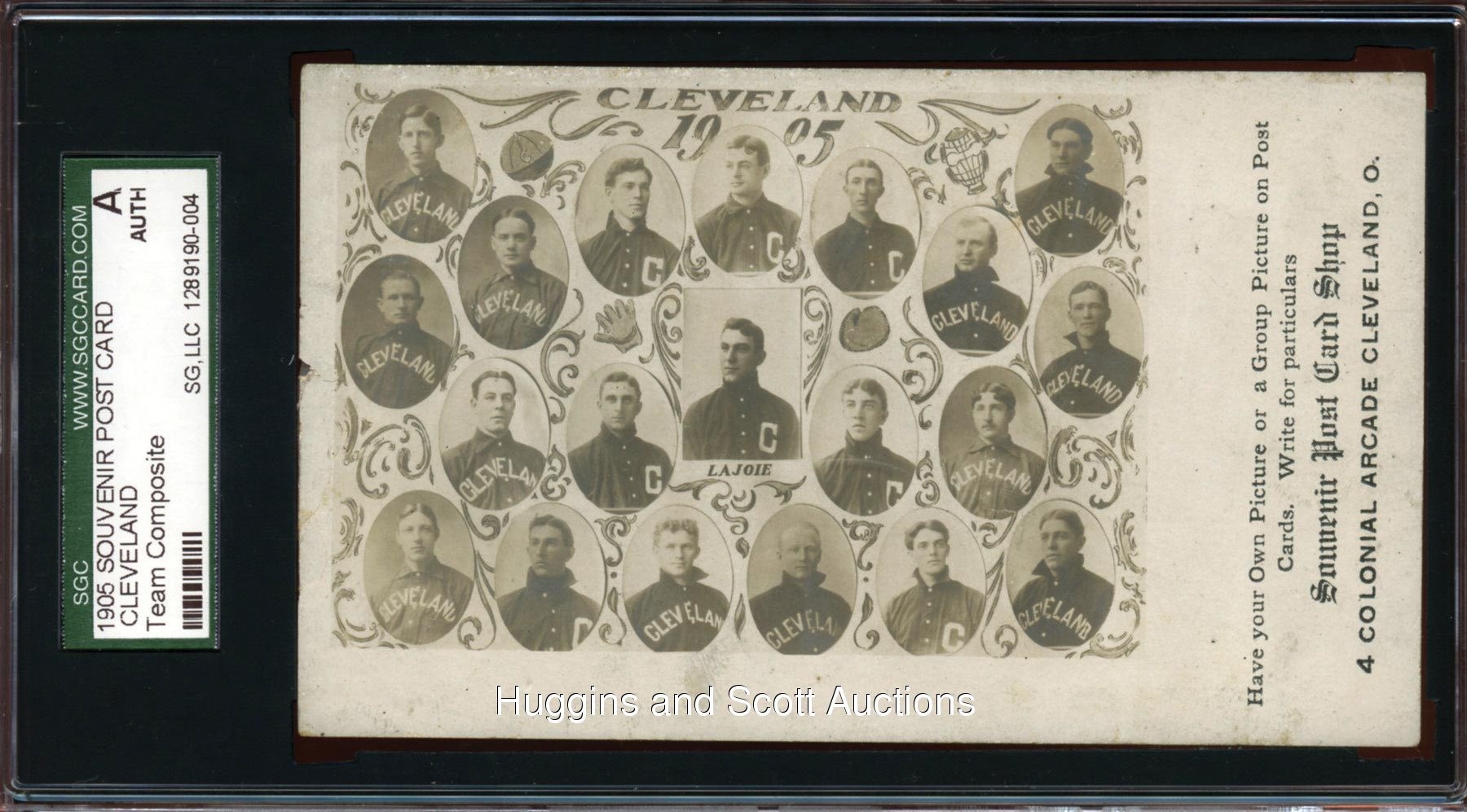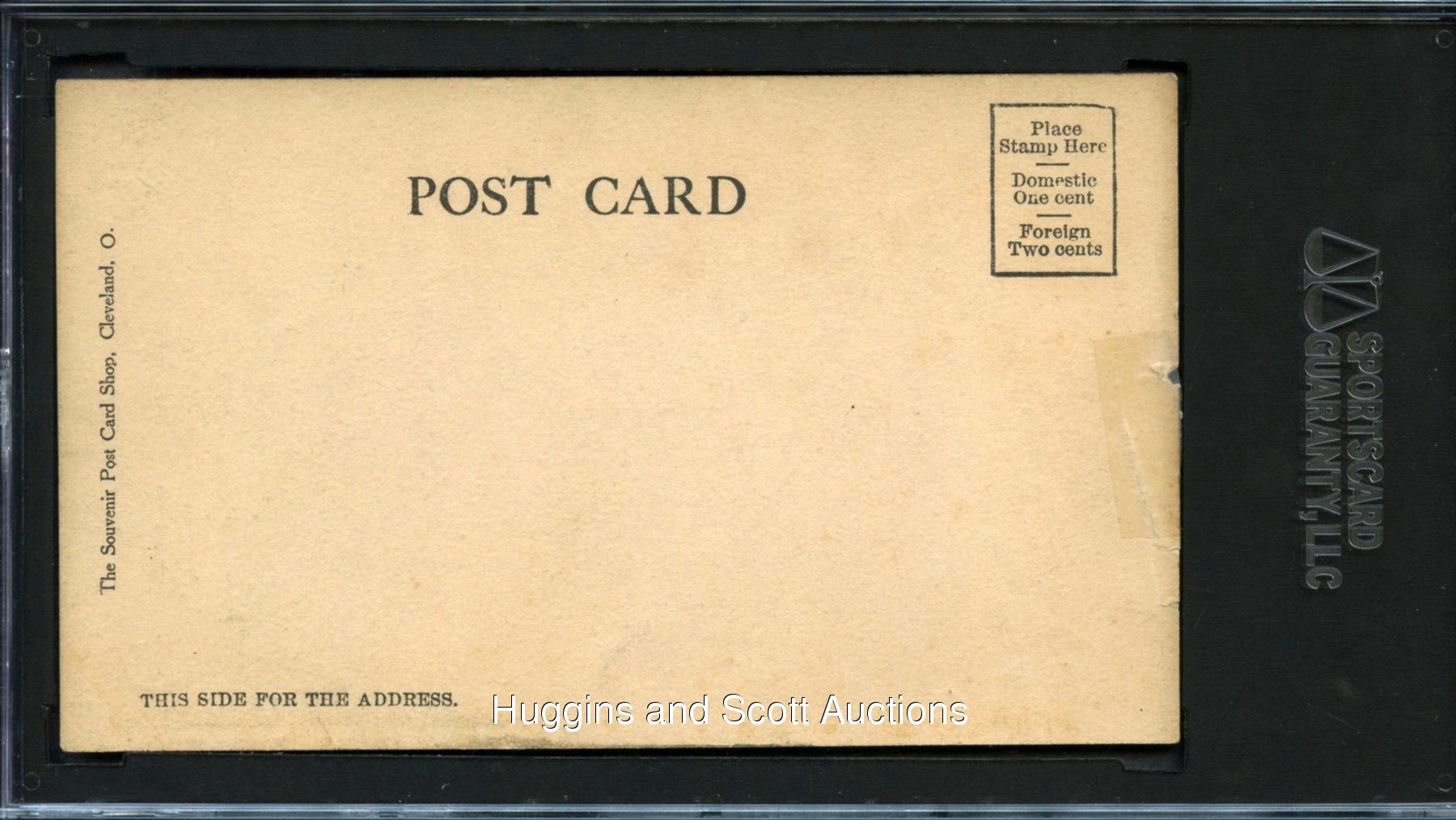 In the six years between releases of the 1903 E107 Breisch-Williams and 1909-11 T206 White Borders editions, the best pre-war hobbyists could hope for are postcards such as the offered 1905 Souvenir Postcard Cleveland team composite. Graded Authentic by SGC due to barely perceptible trimming, this ornate rendition pictures twenty members of the squad with the legendary Nap Lajoie being the lone ballplayer profiled. With deference to a piece of tape along the right edge, the correspondence section is clean. One of only seven total copies judged by the third-party service.