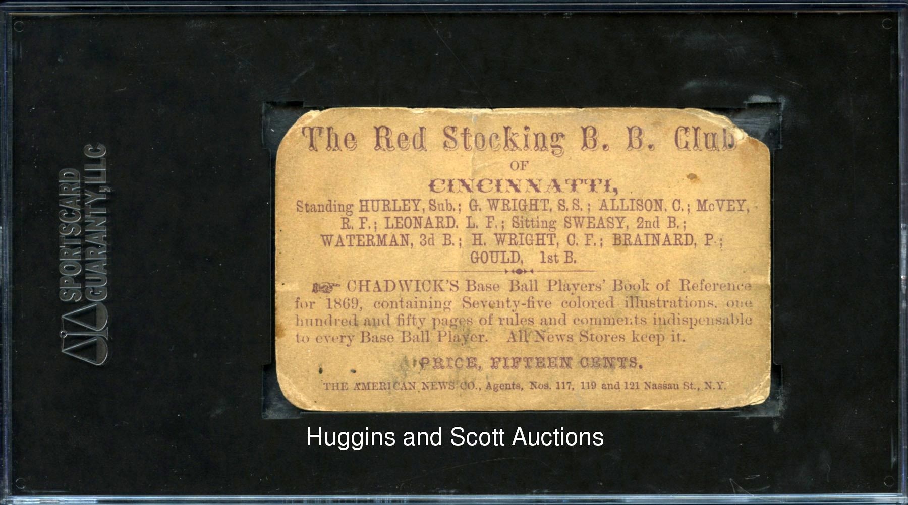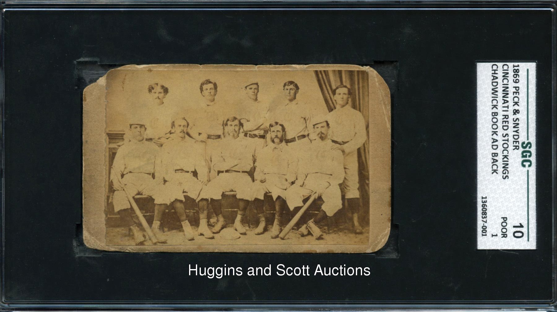 Our national pastime is a game of famous firsts. Whether it is Roscoe Barnes’ home run in 1876, the formation of the leagues, the 1903 World Series, advent of the Midsummers’ Classic or the breaking of the color barrier, baseball is a sport where history can be documented as a point-in-time by century. Four years following the conclusion of America’s bloodiest internal conflict, ten members of the 1869 Cincinnati Red Stockings Base Ball Club became the first professional squad. Fueled by the business acumen of Harry Wright, the barnstorming Red Stockings scorched their outgunned competition by posting a perfect 57-0 record. The team was celebrated in both literature and song and paved the way for the future viability of professional baseball. During the same period, the newly invented carte de viste (or visiting card) gained significant popularity. The thick photographs of prominent citizens were widely distributed and collected and used by various sponsors to promote their products. The New York-area sporting goods company Peck & Snyder capitalized on both the CDV and the immensely popular American sport by distributing a team composite of what is now considered the first baseball card. Graded Poor 1 by SGC. The offered 1869 Peck & Snyder Cincinnati Red Stockings (Small) team card is a significant early baseball artifact and is one of only five total judged by the grading service. After 140 years in hiding, this artifact was recently unearthed by our Ohio based consignor. A total census of both the PSA and SGC population reports confirm a total of eight small versions. Despite a combination of obverse wear consistent with the technical assessment, the sepia images of the Red Stockings have survived the century with perfectly contrasted imagery. Each player is confirmed as a member of the team with a “C” that is factory printed onto their jerseys. Subjects include Top Row: Hurley, G. Wright, Allison, McVey, Leonard; Bottom Row: Sweasy, Waterman, H. Wright, Brainard and Gould. The boldly stamped reverse confirms the identities of the subjects and includes an advertisement for Chadwick’s Base Ball Player’s Book of References for 1869 authored by Henry Chadwick, the “Father of Baseball”. Huggins & Scott is proud to offer this significant piece of both American and sports history and will be exhibiting it at the 2014 National Sports Collectors Convention in Cleveland, Ohio.