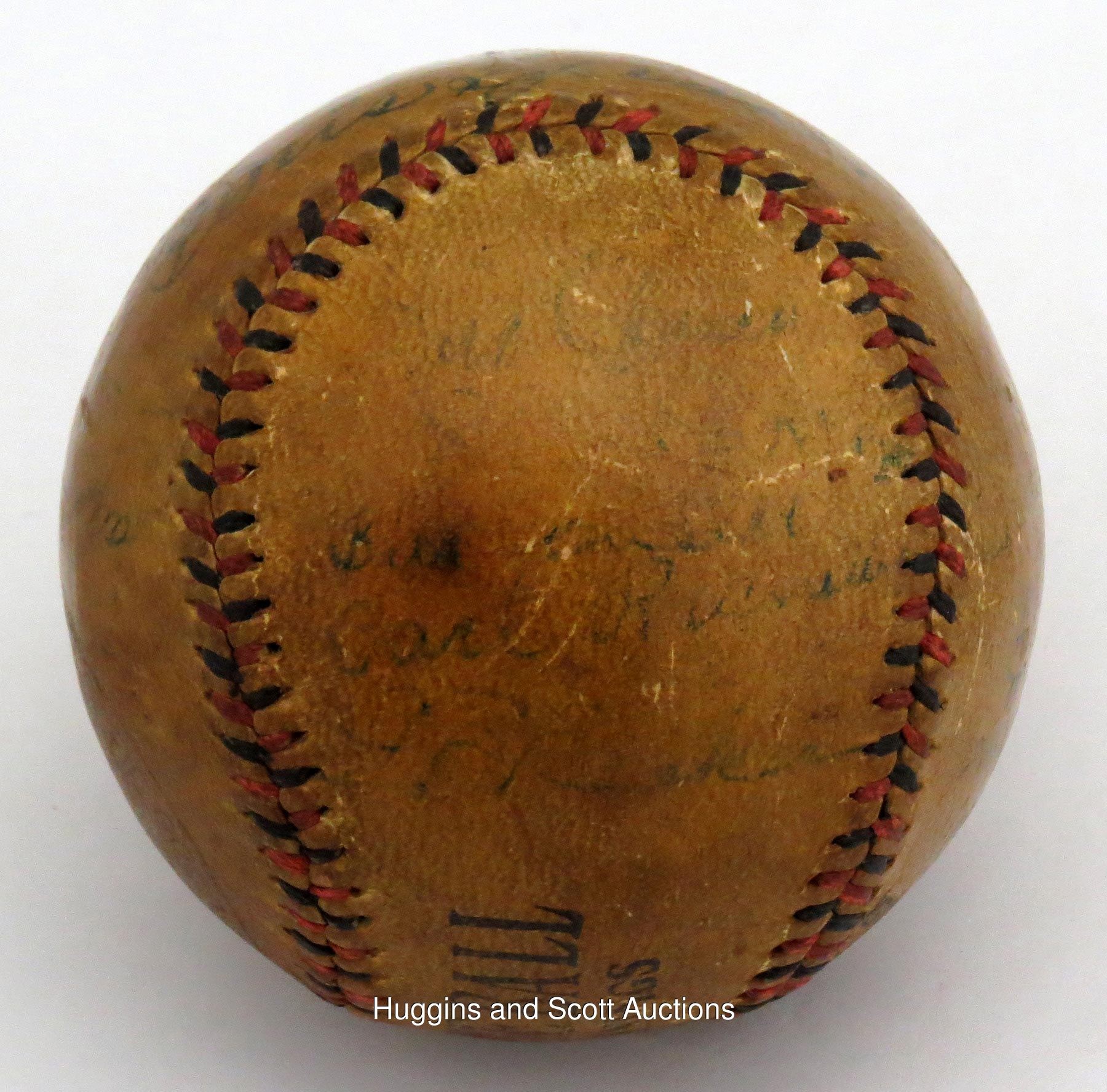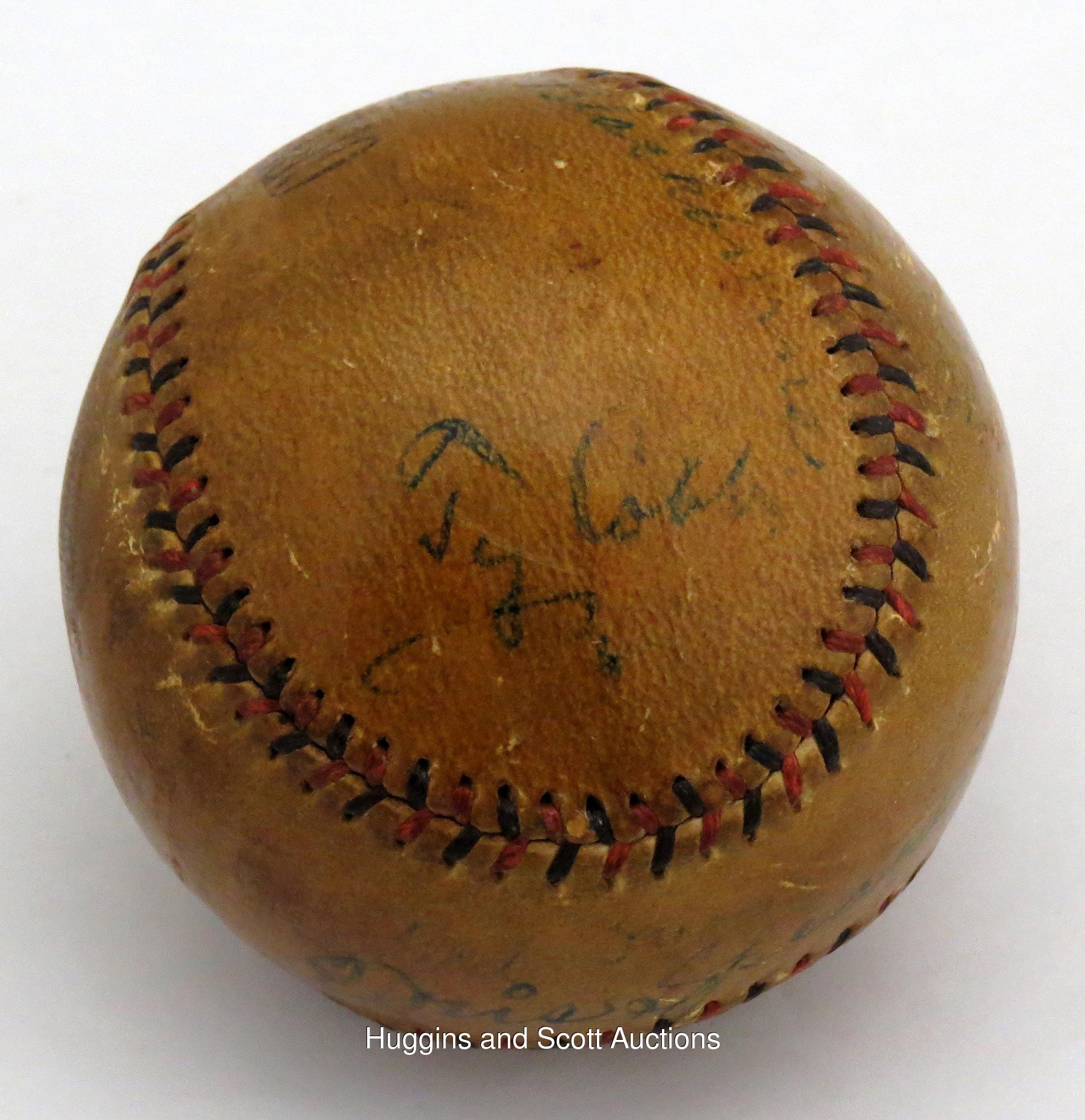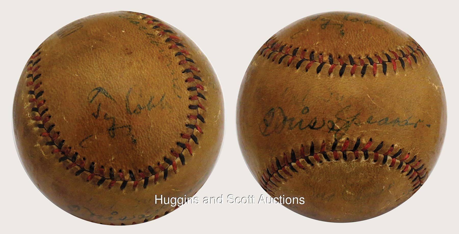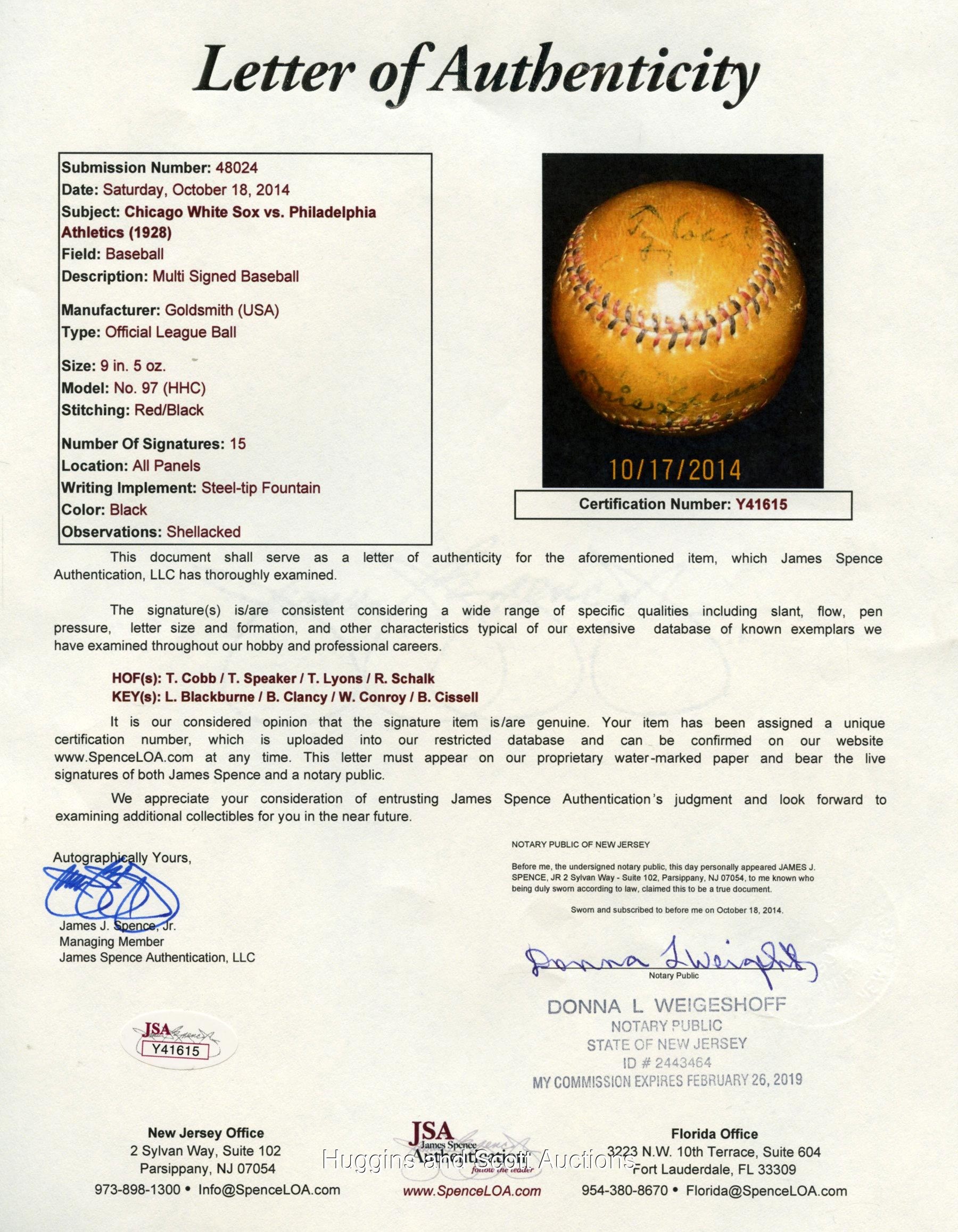 The ebb and flow of diamond fortunes simultaneously saw the Philadelphia Athletics on the ascent and the Chicago White Sox in the throes of decline as both tried (in vain) to unseat the almighty Yankees in 1928. Likely gathered during one of the 22 meetings between the A’s and ChiSox that year, (15) autographs decorate this vintage baseball. The darkly toned unofficial orb has a uniform coat of period shellac and features black-ink fountain pen scriptings that range between (“7”) and (“2-3”) in terms of strength and clarity. Highlights include: Cobb (“7” strength), Lyons (“3” strength), Schalk (“3” strength) and Speaker (“7” strength). Full photo LOA from JSA. More on our website.As for the clubs’ respective fortunes, the Athletics were quickly rising and one year away from the start of one of the most formidable dynasties in baseball history. Following the introduction of the upstart Federal League and Connie Mack’s resultant fire sale following the 1914 season, the Athletics endured seven successive last-place finishes and 10 straight losing seasons. Armed with veteran legends such as Cobb and Speaker, however, the A’s rallied furiously in 1928. Though they trailed the front-running Yankees by 12-1/2 games as late as July 17, the A’s went on a 40-12 tear to catch and pass the Bronx Bombers on September 8, only to succumb to New York in the end.Speeding in the opposite direction, the White Sox had been stripped of eight star players (and their collective dignity) after Commissioner Landis’ 1920 ruling. The 1928 season marked the club’s second of a franchise-long nine straight losing seasons.Assembled for one of 22 meeting that year, (15) A’s or Pale Hose principals saw fit to sign this souvenir. Includes:Sweet Spot: Ted Lyons (“3” strength) and Tris Speaker (“7” strength); North Panel: Lena Blackburne (coach, “5” strength) and Ty Cobb (“7” strength); South Panel: Bud Clancy (“2-3” strength), unidentified, Bill Cissell (“3” strength), Carl Reynolds (“3-4” strength) and unidentified; West Panel: Ray Schalk (“3” strength); East Panel: Tommy Thomas (“3-4” strength), Buck Crouse (“3” strength), Bill Barrett (“2-3” strength) and unidentified