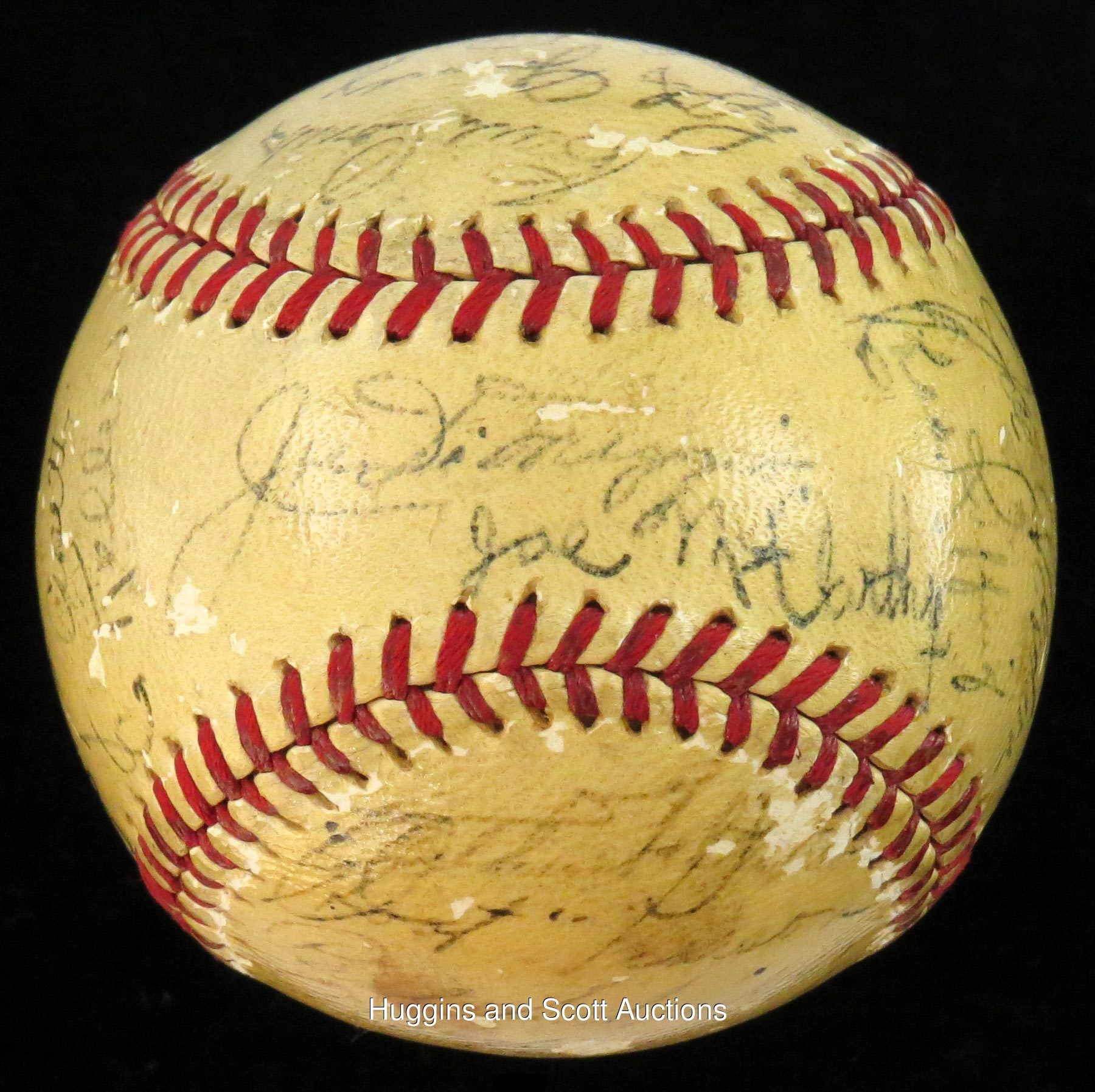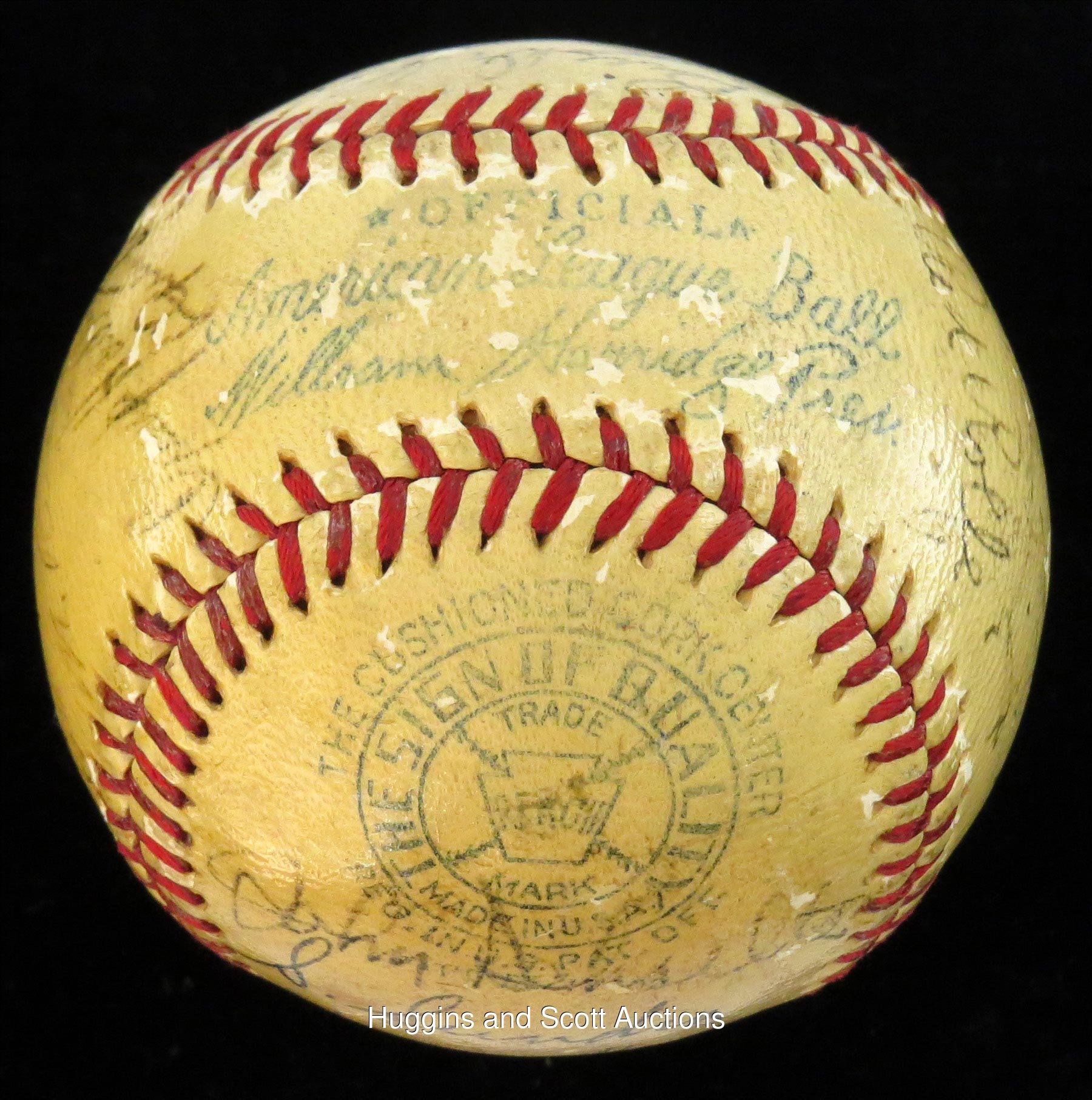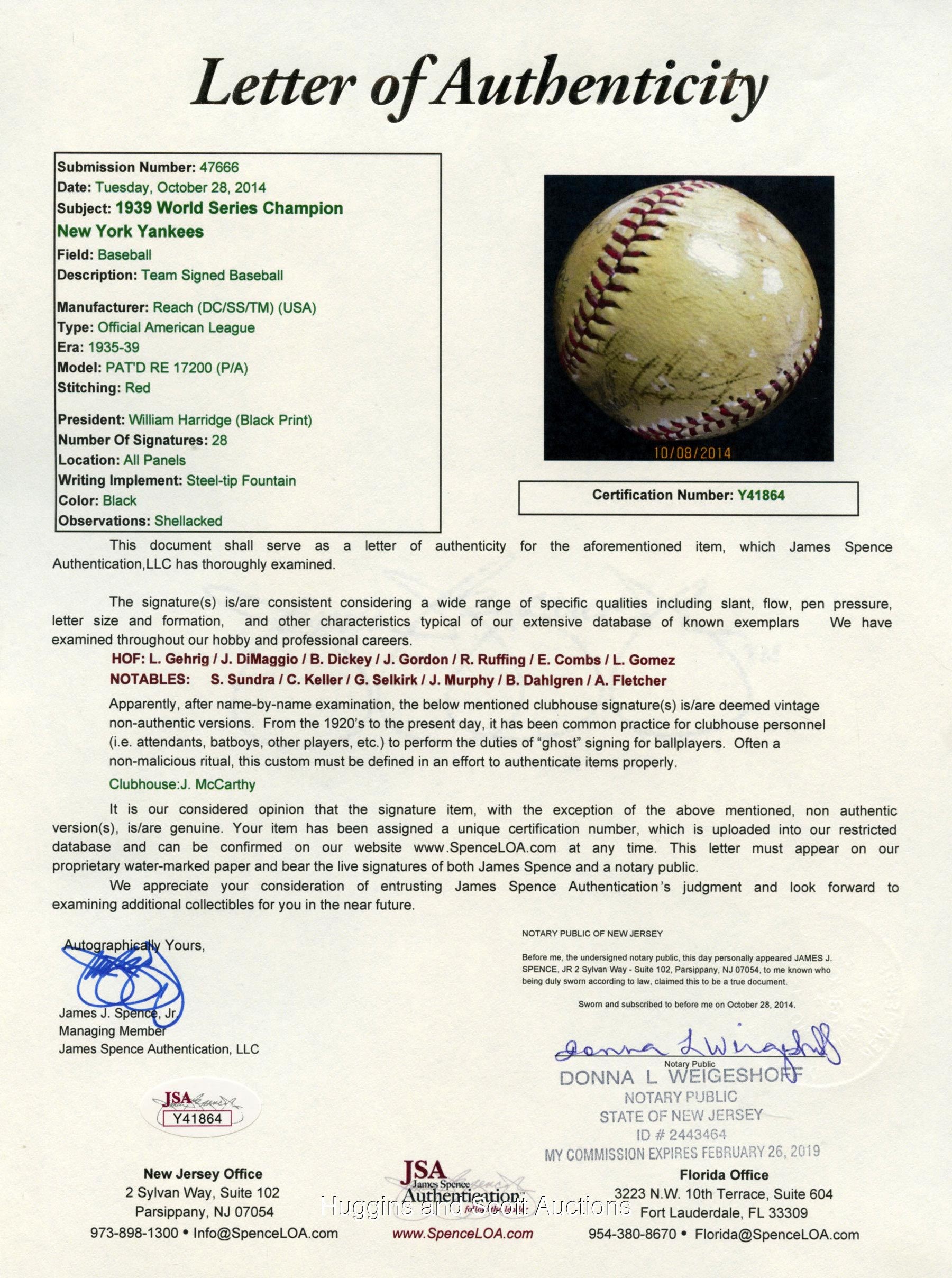 Towering over their opponents as three-time defending World Series champions, the 1939 New York Yankees were devastated with the felling of their soft-spoken leader, Lou Gehrig, who benched himself on May 2 with an uncharacteristic .143 average. Inspired by Gehrig’s selfless heroics, the Bronx Bombers went on a 40-8 tear to distance themselves on their way to a (then) record fourth straight title. This OAL Harridge baseball is autographed by (28) members of that pinstriper roster. The lightly toned orb is minimally affected by scattered surface abrasions and showcases black-ink fountain pen scriptings that range from (“7”) to (“4”) in terms of potency. Includes: Sweet Spot: DiMaggio (“5” strength), and McCarthy (clubhouse); North Panel: Combs (coach, “5”), Gomez (“5-6”), Powell (d.1948, “5-6”), Donald, Jorgens, Henrich and Rolfe; South Panel: unidentified, Pearson, Schreiber, Hildebrand, Knickerbocker, Russo, Hadley and Gehrig (“5”); West Panel: Schulte (coach), Sundra, Crosetti and Keller; East Panel: Dickey (“5”), Selkirk, Rosar, Murphy, Dahlgren, Gordon (“5”) and Ruffing (“5-6”). Full photo LOA from JSA.Note: the appearance of Schrieiber (coupled with the appearance of Gehrig) suggests that this ball was signed during the club's spring training session.