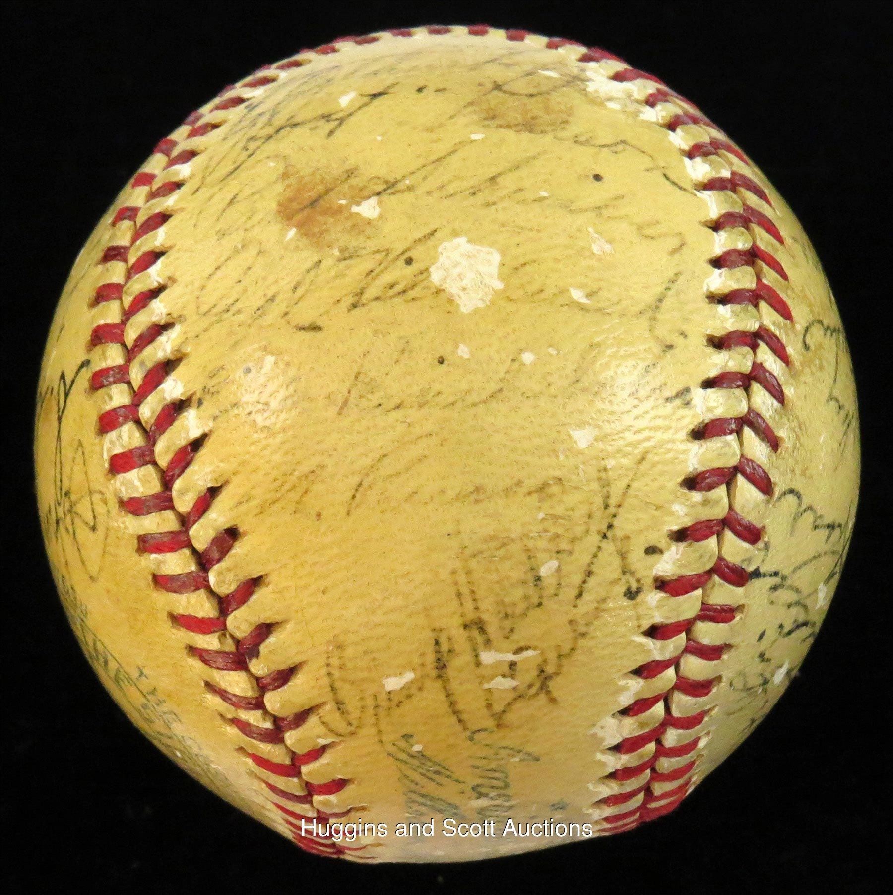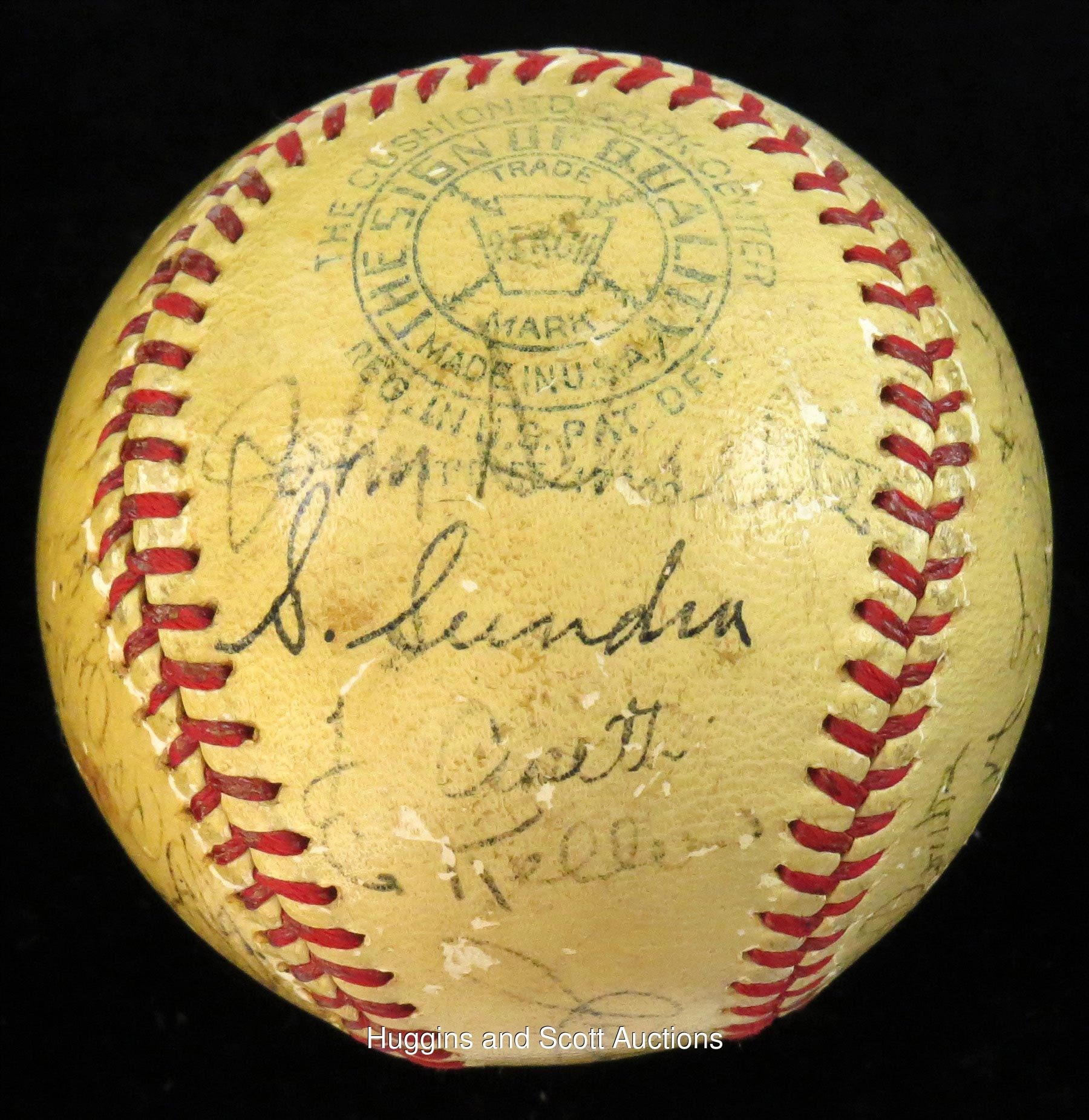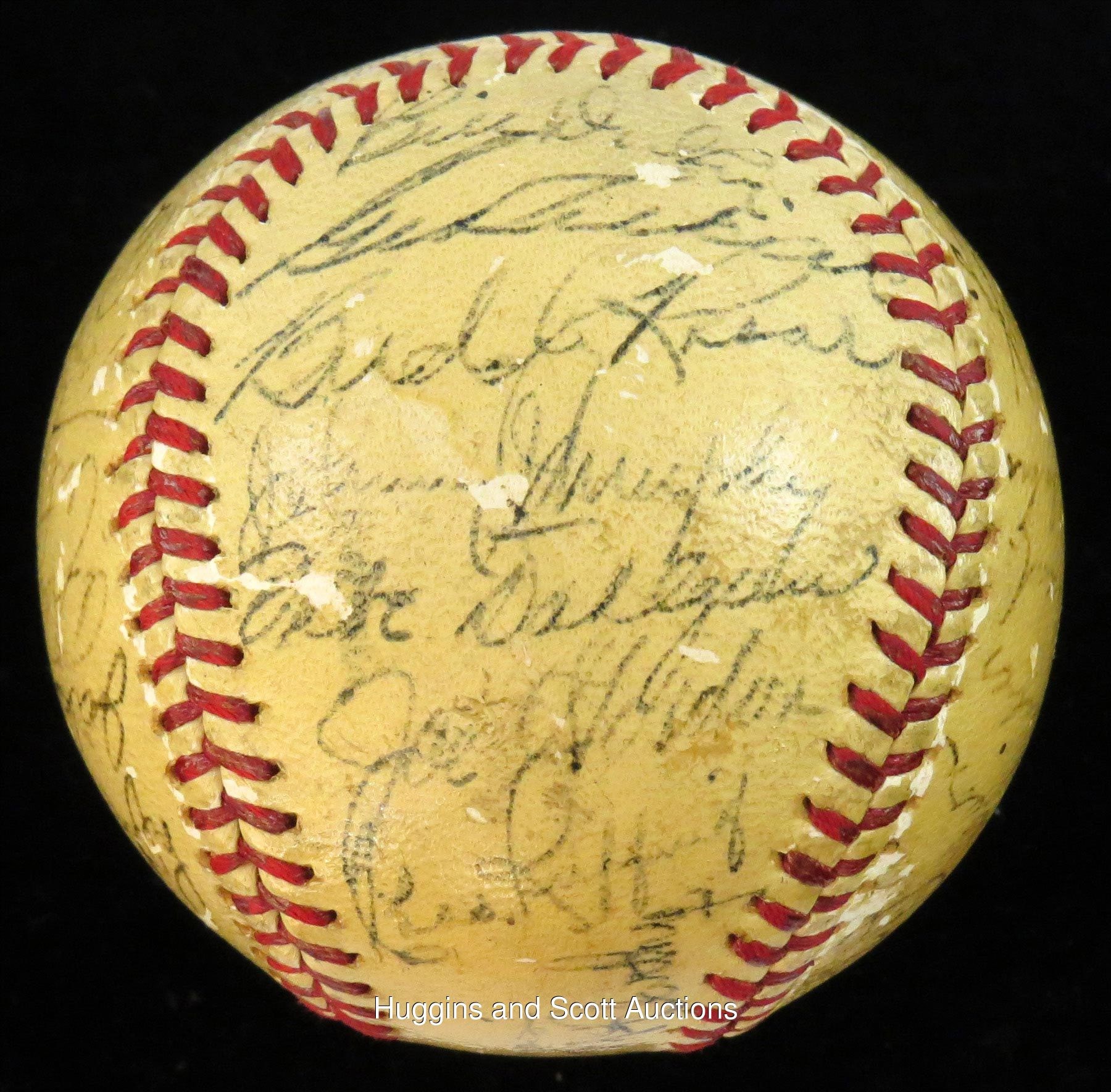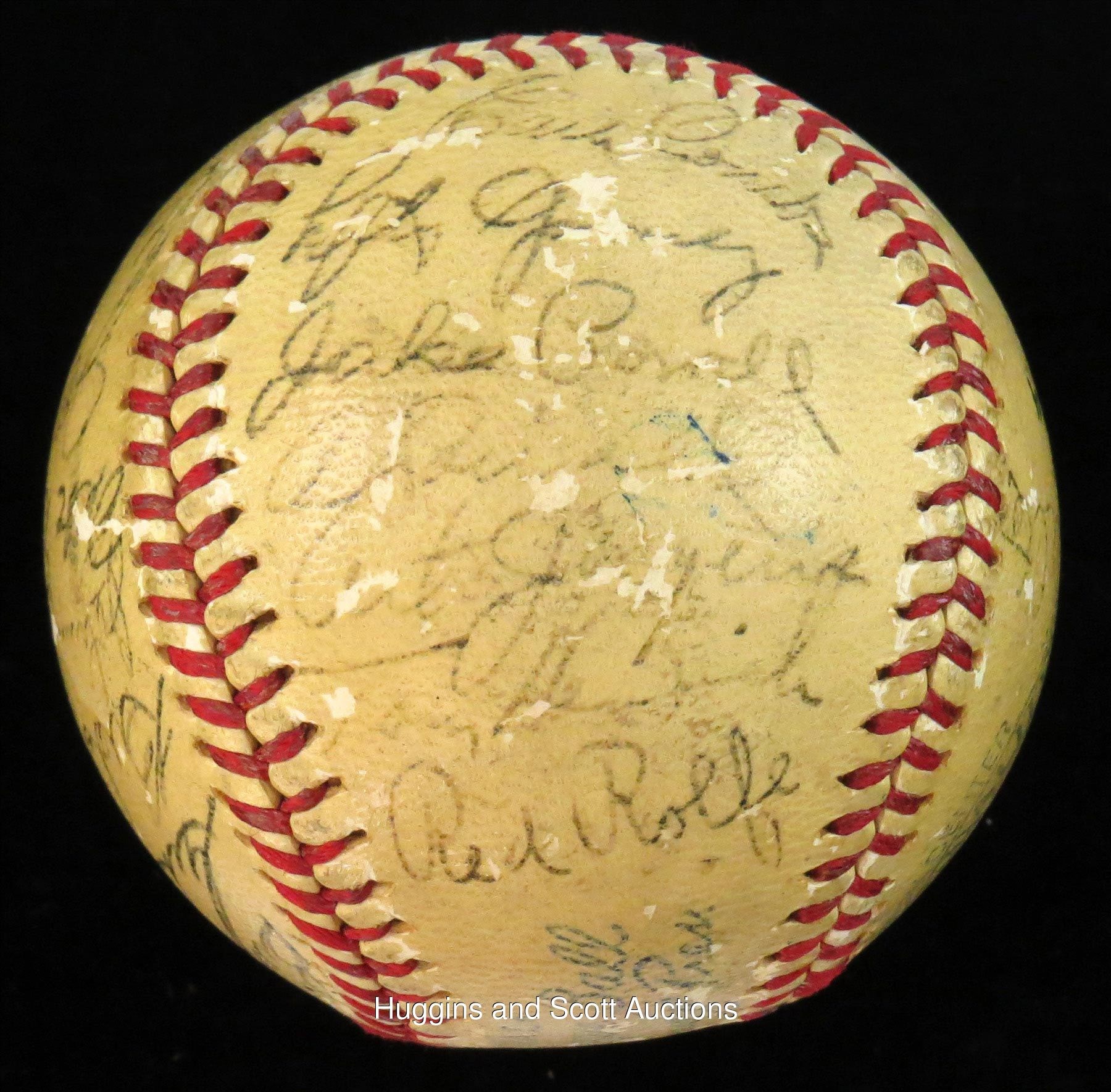 Towering over their opponents as three-time defending World Series champions, the 1939 New York Yankees were devastated with the felling of their soft-spoken leader, Lou Gehrig, who benched himself on May 2 with an uncharacteristic .143 average. Inspired by Gehrig’s selfless heroics, the Bronx Bombers went on a 40-8 tear to distance themselves on their way to a (then) record fourth straight title. This OAL Harridge baseball is autographed by (28) members of that pinstriper roster. The lightly toned orb is minimally affected by scattered surface abrasions and showcases black-ink fountain pen scriptings that range from (“7”) to (“4”) in terms of potency. Includes: Sweet Spot: DiMaggio (“5” strength), and McCarthy (clubhouse); North Panel: Combs (coach, “5”), Gomez (“5-6”), Powell (d.1948, “5-6”), Donald, Jorgens, Henrich and Rolfe; South Panel: unidentified, Pearson, Schreiber, Hildebrand, Knickerbocker, Russo, Hadley and Gehrig (“5”); West Panel: Schulte (coach), Sundra, Crosetti and Keller; East Panel: Dickey (“5”), Selkirk, Rosar, Murphy, Dahlgren, Gordon (“5”) and Ruffing (“5-6”). Full photo LOA from JSA.Note: the appearance of Schrieiber (coupled with the appearance of Gehrig) suggests that this ball was signed during the club's spring training session.