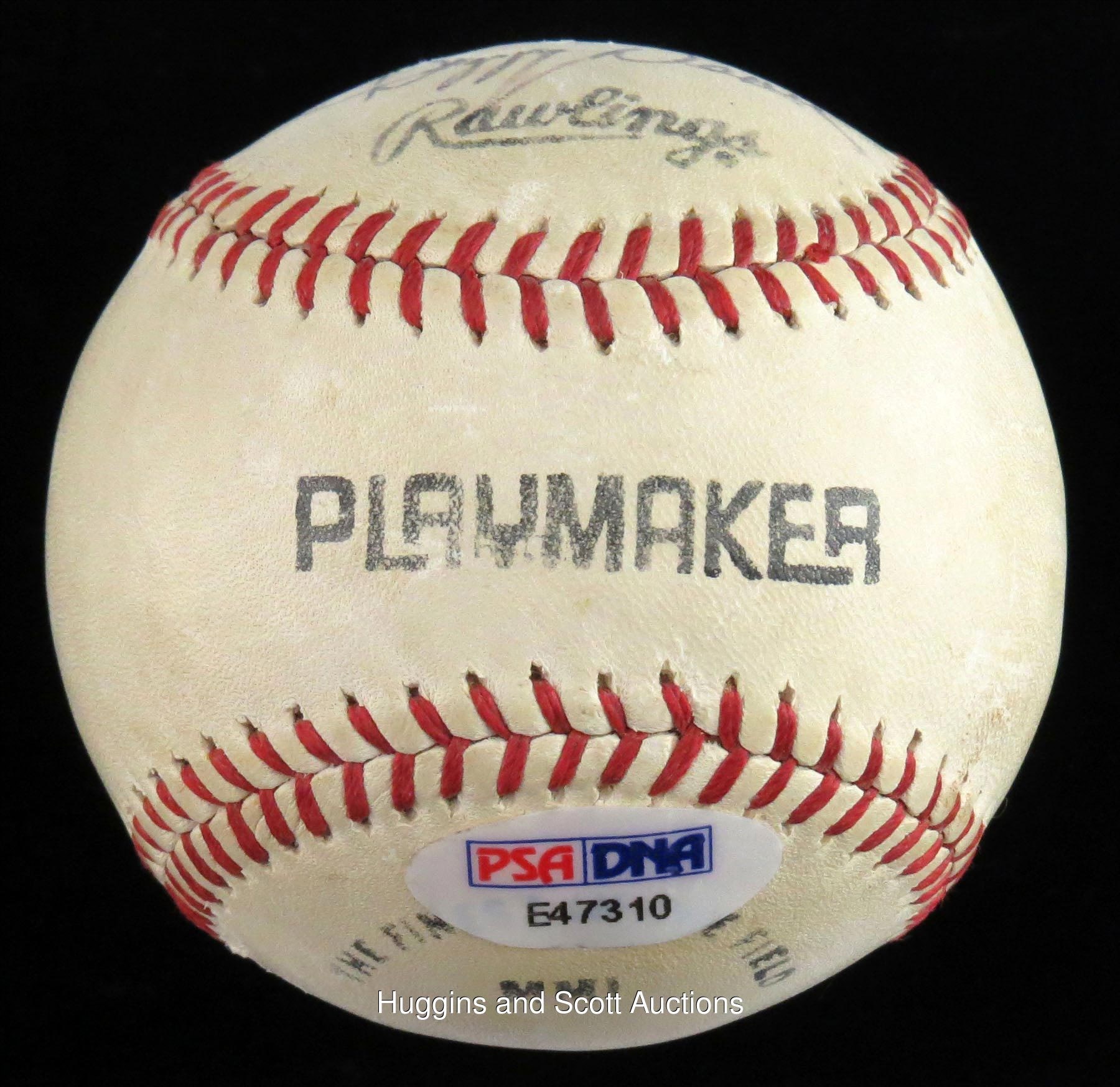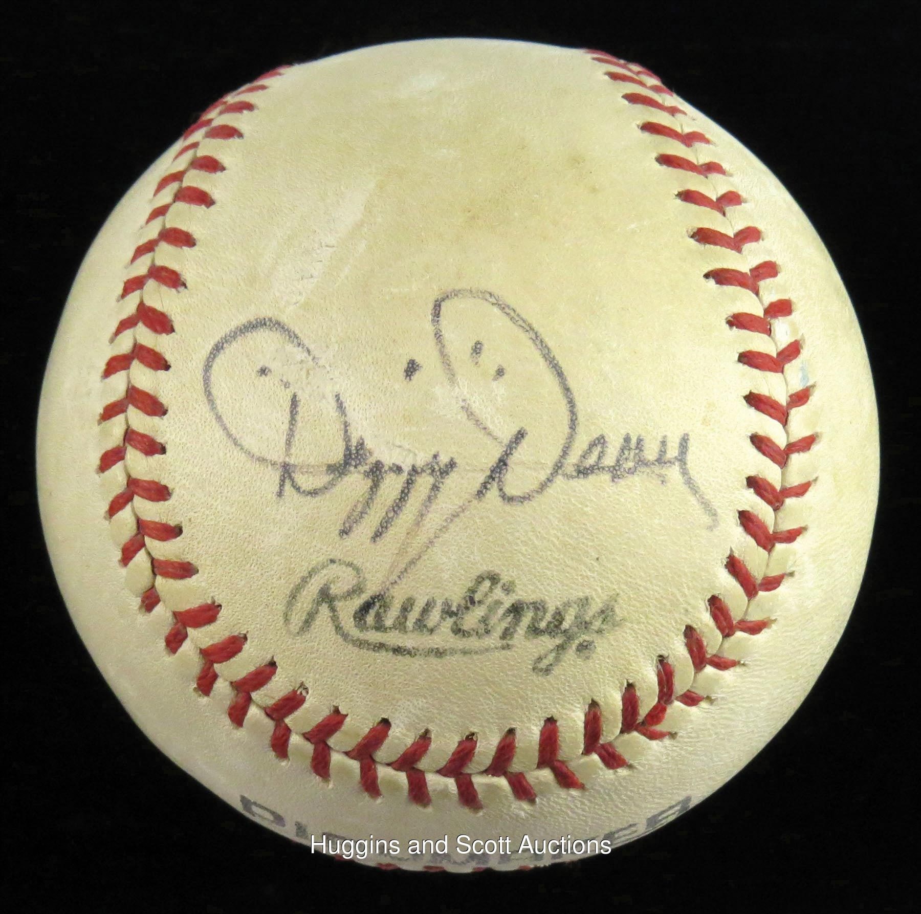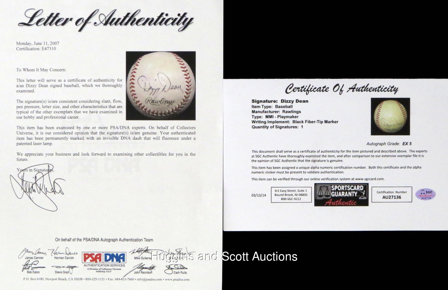 Distinctive in his abilities and personality, Hall of Famer Dizzy Dean enjoyed pitching and talking equally and was embraced by America throughout and well after his playing career. Dean’s autograph, too, had traits all its own. And here’s a stellar example! The medium is a creamy unofficial “Rawlings” sphere and Dean’s black-ink penning is unmistakable with quotation marks (a post-career trait on Dean signatures) within the upper-case “D’s.” As his autograph gradually grew in height, Dean resorted to a side panel rather than compromise his flamboyant compositions in the limited space allowed on the sweet spot. This signature and its location are true to form, showing (“7”) potency just above the trademark stampings, with surface abrasions minimally affecting the first name. Full photo LOA from PSA/DNA.