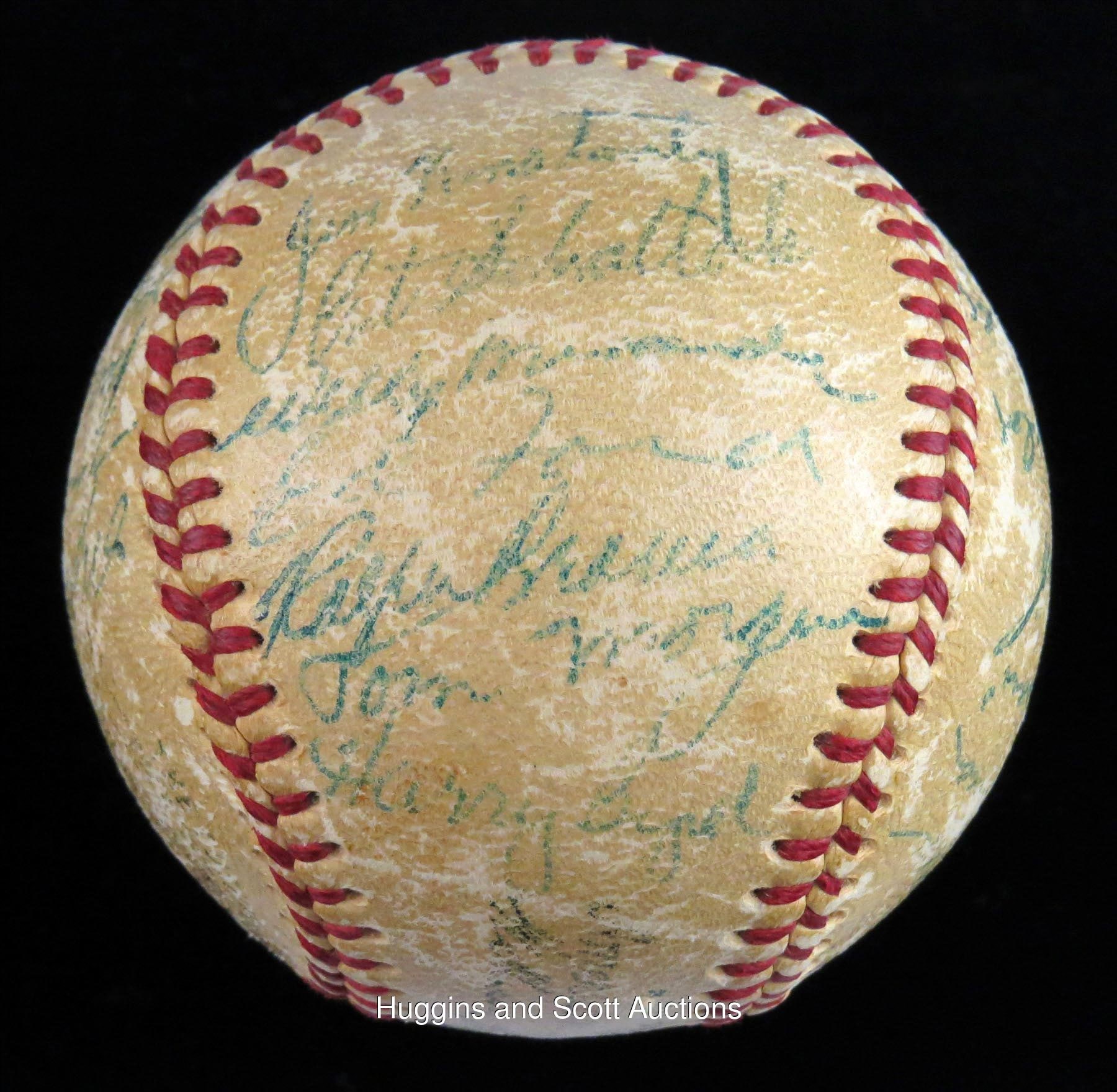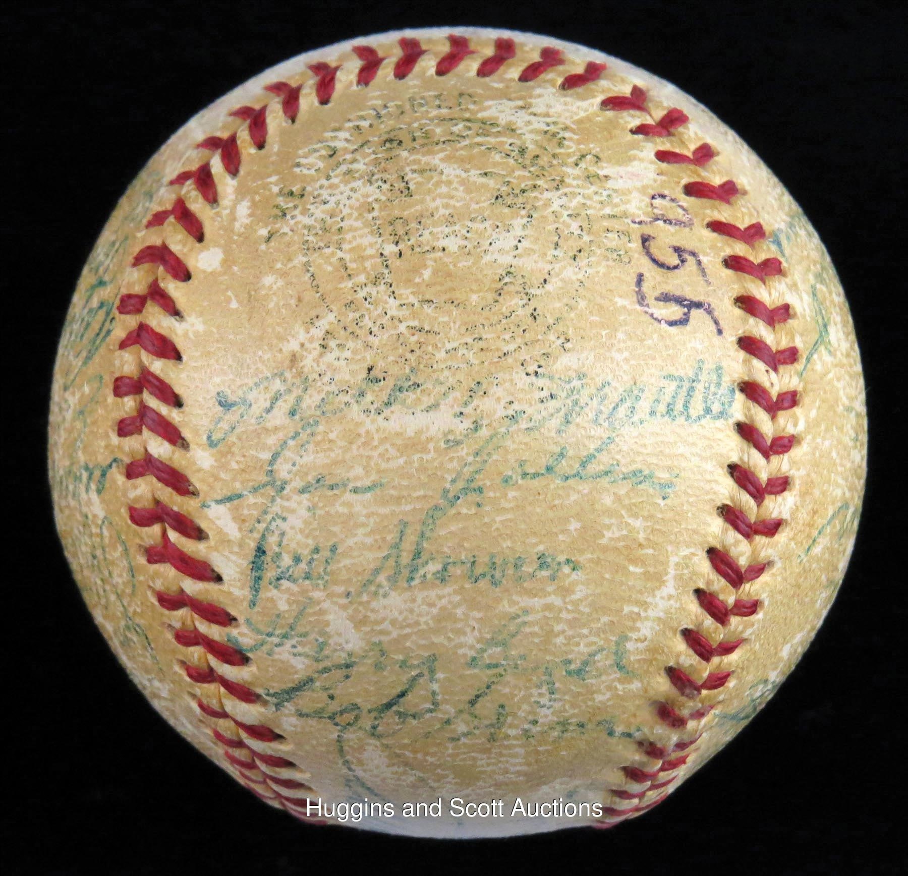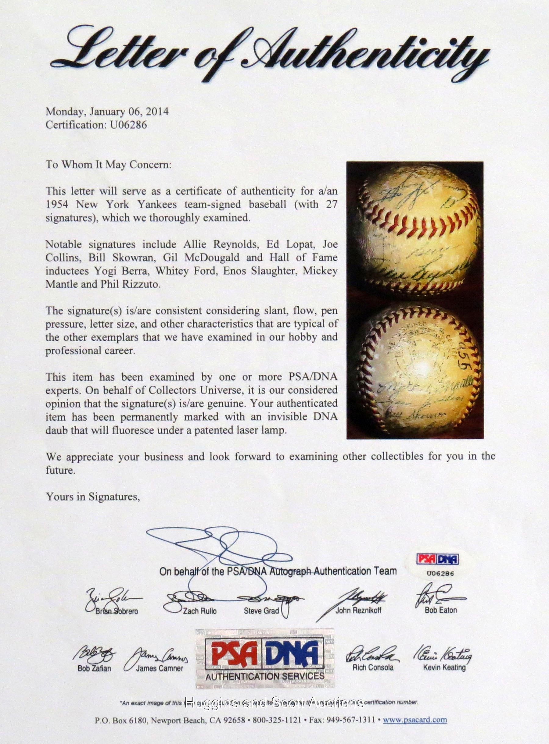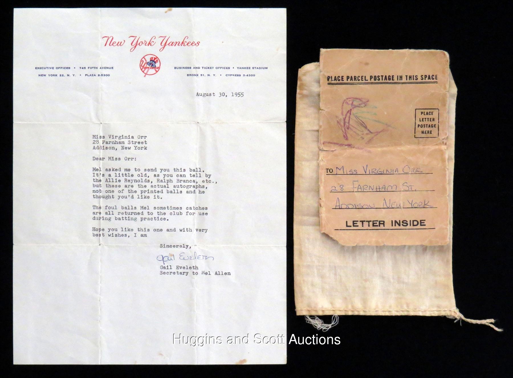 So dominant were the New York Yankees during their remarkable 1949-1964 run of 14 pennants in 16 seasons, that even when they did not advance to the Fall Classic, they remained a well-oiled machine to which also-rans aspired to imitate. The 1954 campaign marked a brief interruption in the pinstripers’ championship run, despite the club’s impressive win total of 103. This baseball is autographed by (26) members of that vaunted runner-up roster. The medium-toned OAL Harridge orb has scattered surface abrasions and ballpoint pennings averaging (“5-6”) quality. Keys include: Bauer, Berra, Ford, Mantle, Reynolds, Rizzuto, Skowron and Slaughter. Full photo LOA from PSA/DNA. More on our website.Sweet Spot: Berra (“4-5” strength) and Reynolds; North Panel: Slaughter (“6” strength), Cerv, Bauer, Sain, Lopat and Silvera; South Panel: Konstanty, Shallock, Miranda, Ford (“4” strength), Branca, Morgan and Byrd; West Panel: Mantle (“4” strength), Collins, Skowron, Byrd (repeat signature) and Grim; East Panel: Noren, Coleman, E. Robinson, Rizzuto (“5-6” strength), McDougald, McDonald and Carey.Note: a ballpoint notation of “1955” (in an unknown hand) resides atop the east panel. This was errantly rendered likely at the time the ball was presented. The roster dates to 1954, although the ball was given to a fan by Hall of Fame announcer Mel Allen in 1955. The original typewritten letter accompanies (along with the cloth pouch and mailing envelope). Typewritten on an 8-1/2 x 11” sheet of New York Yankees letterhead, the correspondence is dated “August 30, 1955” and is addressed to an Addison, New York resident. It reads (in full):”Mel asked me to send you this ball. It’s a little old, as you can tell by the Allie Reynolds, Ralph Branca, etc., but these are the actual autographs, not one of the printed balls and he thought you’d like it.The foul balls Mel sometimes catches are all returned to the club for use during batting practice.Hope you like this one and with very best wishes, I amSincerely,(signed) Gail EvelethSecretary to Mel Allen”