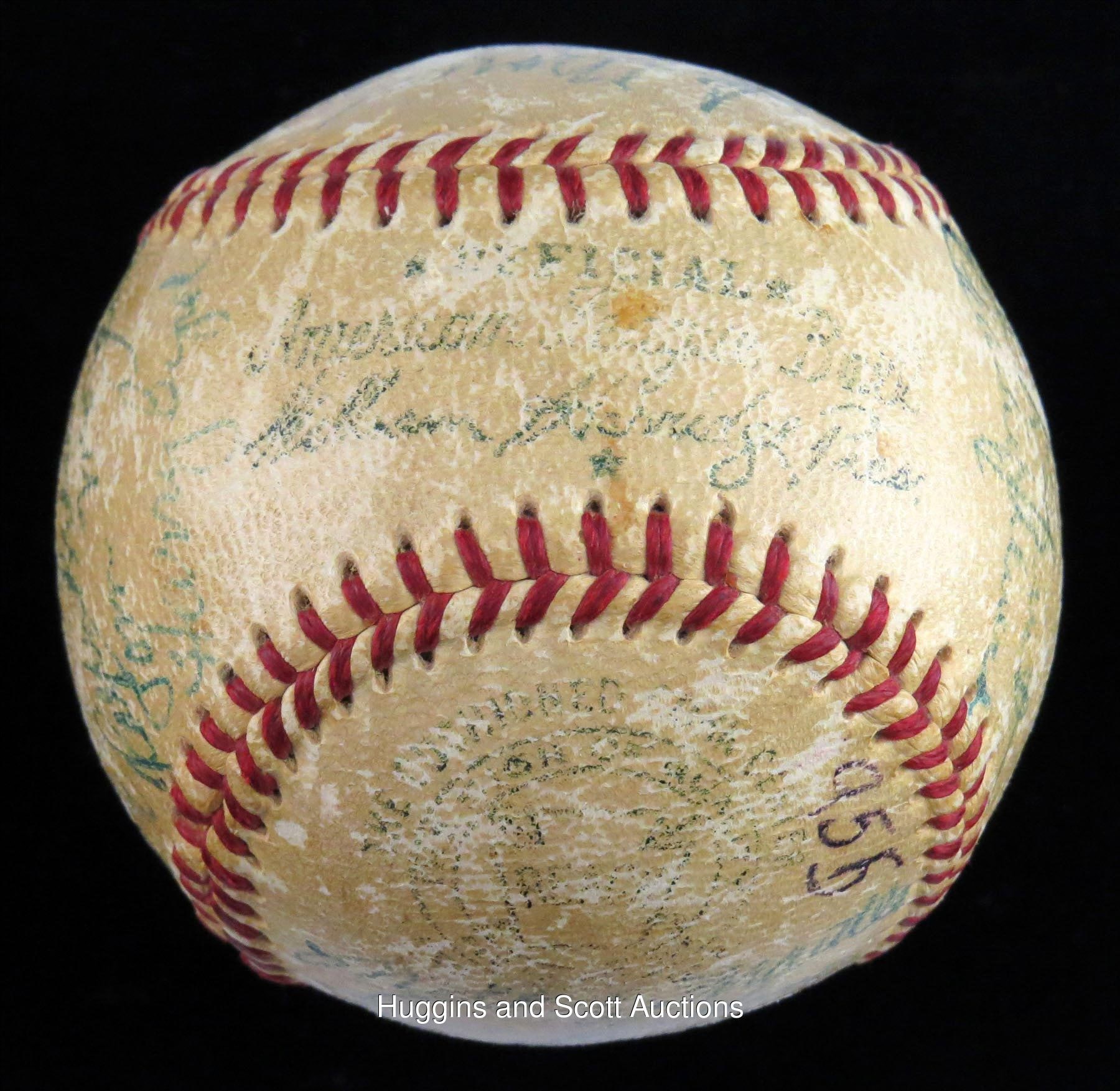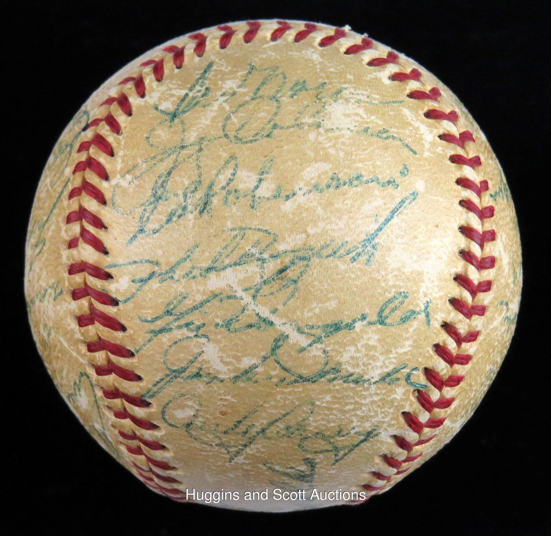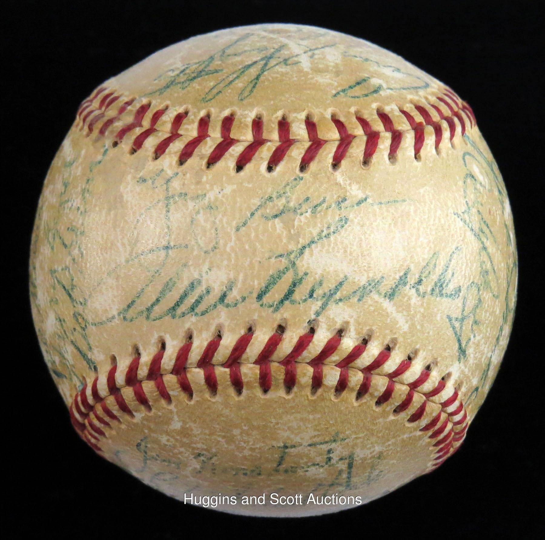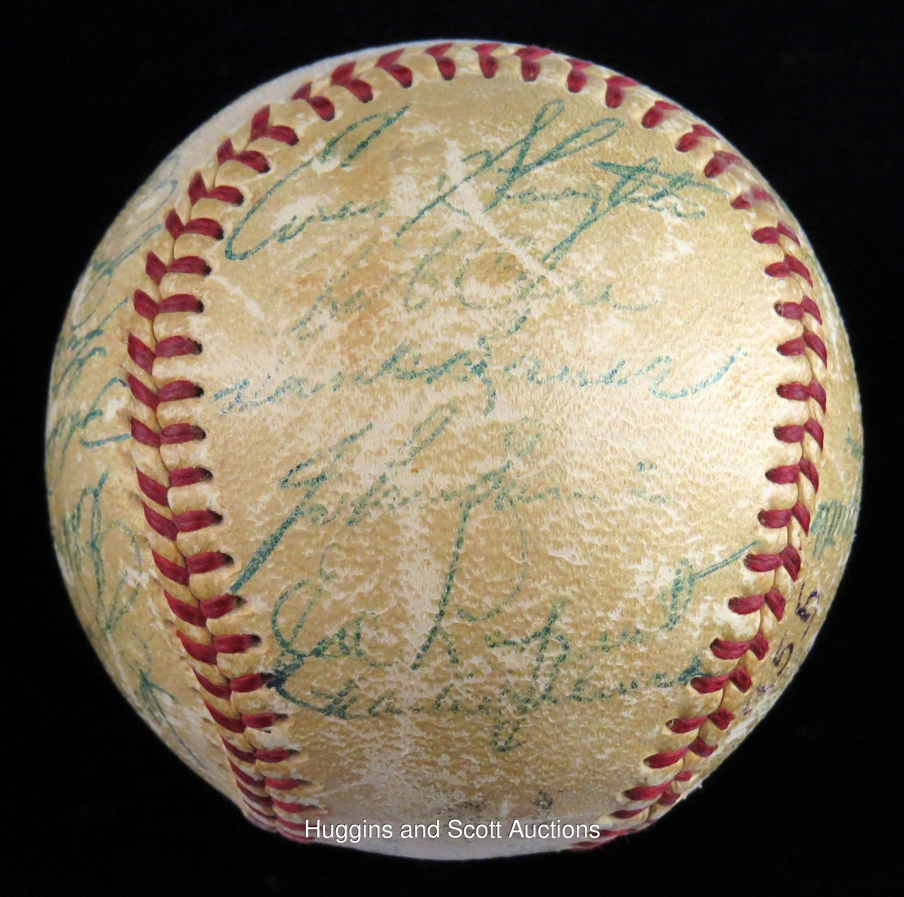 So dominant were the New York Yankees during their remarkable 1949-1964 run of 14 pennants in 16 seasons, that even when they did not advance to the Fall Classic, they remained a well-oiled machine to which also-rans aspired to imitate. The 1954 campaign marked a brief interruption in the pinstripers’ championship run, despite the club’s impressive win total of 103. This baseball is autographed by (26) members of that vaunted runner-up roster. The medium-toned OAL Harridge orb has scattered surface abrasions and ballpoint pennings averaging (“5-6”) quality. Keys include: Bauer, Berra, Ford, Mantle, Reynolds, Rizzuto, Skowron and Slaughter. Full photo LOA from PSA/DNA. More on our website.Sweet Spot: Berra (“4-5” strength) and Reynolds; North Panel: Slaughter (“6” strength), Cerv, Bauer, Sain, Lopat and Silvera; South Panel: Konstanty, Shallock, Miranda, Ford (“4” strength), Branca, Morgan and Byrd; West Panel: Mantle (“4” strength), Collins, Skowron, Byrd (repeat signature) and Grim; East Panel: Noren, Coleman, E. Robinson, Rizzuto (“5-6” strength), McDougald, McDonald and Carey.Note: a ballpoint notation of “1955” (in an unknown hand) resides atop the east panel. This was errantly rendered likely at the time the ball was presented. The roster dates to 1954, although the ball was given to a fan by Hall of Fame announcer Mel Allen in 1955. The original typewritten letter accompanies (along with the cloth pouch and mailing envelope). Typewritten on an 8-1/2 x 11” sheet of New York Yankees letterhead, the correspondence is dated “August 30, 1955” and is addressed to an Addison, New York resident. It reads (in full):”Mel asked me to send you this ball. It’s a little old, as you can tell by the Allie Reynolds, Ralph Branca, etc., but these are the actual autographs, not one of the printed balls and he thought you’d like it.The foul balls Mel sometimes catches are all returned to the club for use during batting practice.Hope you like this one and with very best wishes, I amSincerely,(signed) Gail EvelethSecretary to Mel Allen”