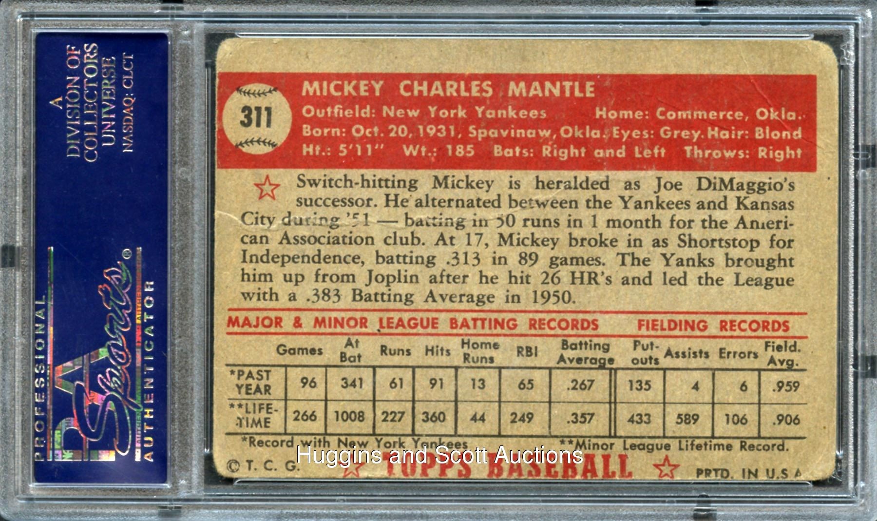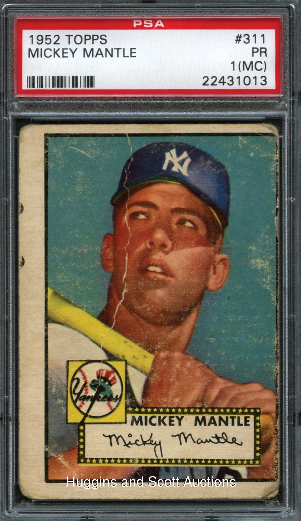 The offered 1952 Topps Baseball #311 Mickey Mantle rookie card is one of the few cases in which a low-grade example will still garner considerable interest. Graded Poor 1 with a (mc) qualifier by PSA. This particular copy was obviously well admired by its original owner as the obverse displays a combination of acute wear. With Mantle earning the status as boyhood hero to millions, it is not difficult to conjure the wide-eyed amazement the youth had while handling his cardboard treasure. Despite the obvious lower grade, the prominent subject and set transcends all condition factors.