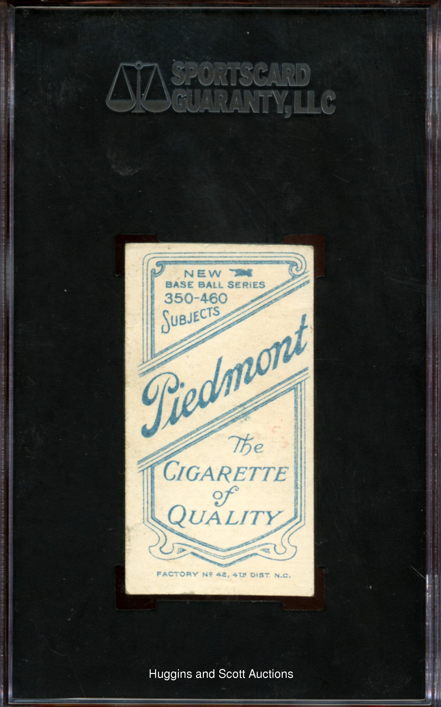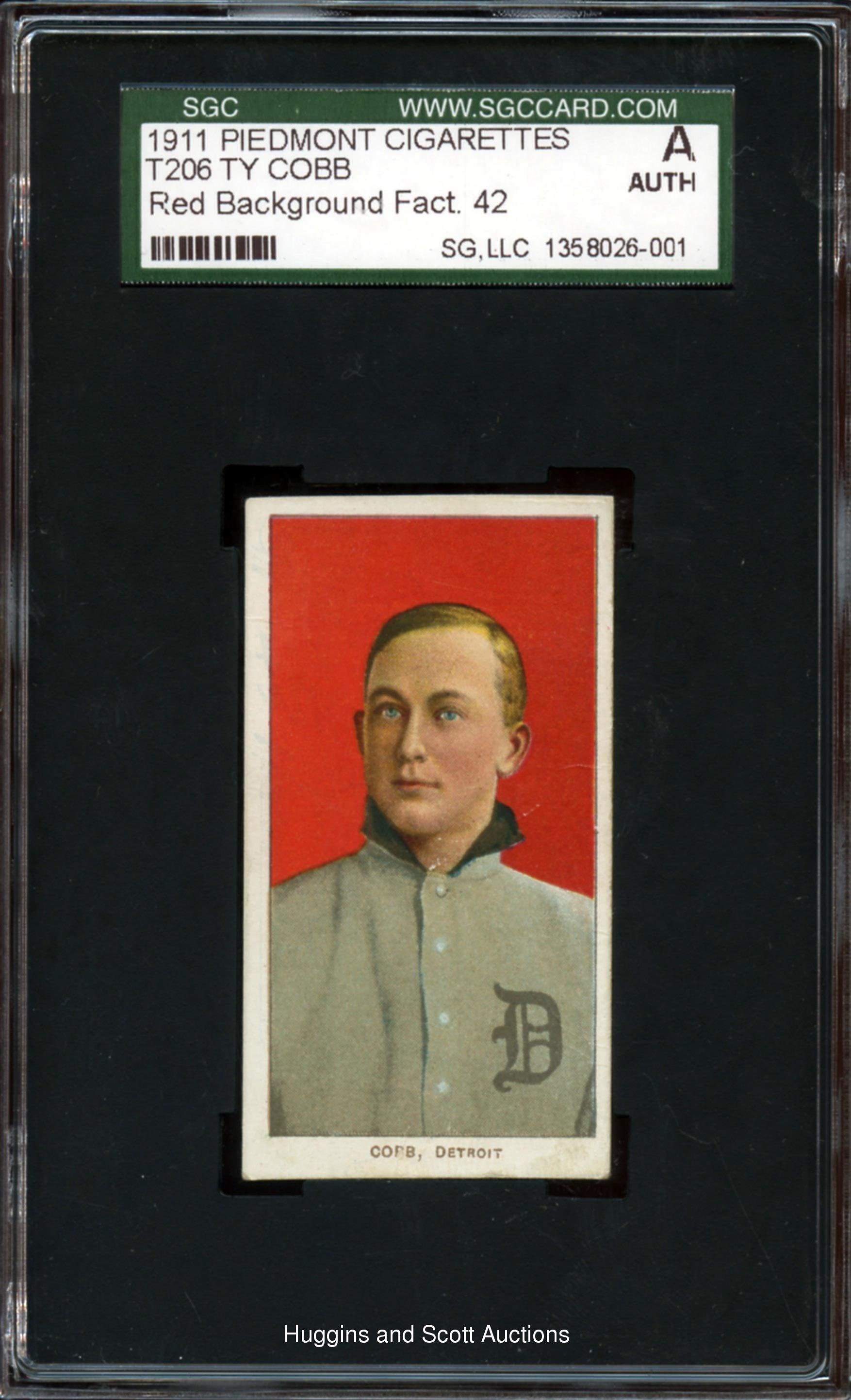 Blazing 1911 T206 White Borders Ty Cobb (Red Portrait) pose with a decidedly scarce Piedmont Factory 42 advertising back. Graded Authentic by SGC. With deference to a somewhat jagged perimeter, the obverse presents (VG) with very minor edge wrinkling. The contrast of the century-old portrait is remarkably bright with dazzling surface hues. The all-important reverse is clean with pronounced advertising typeface. Presides as a key component to any 1909-11 T206 White Borders project.