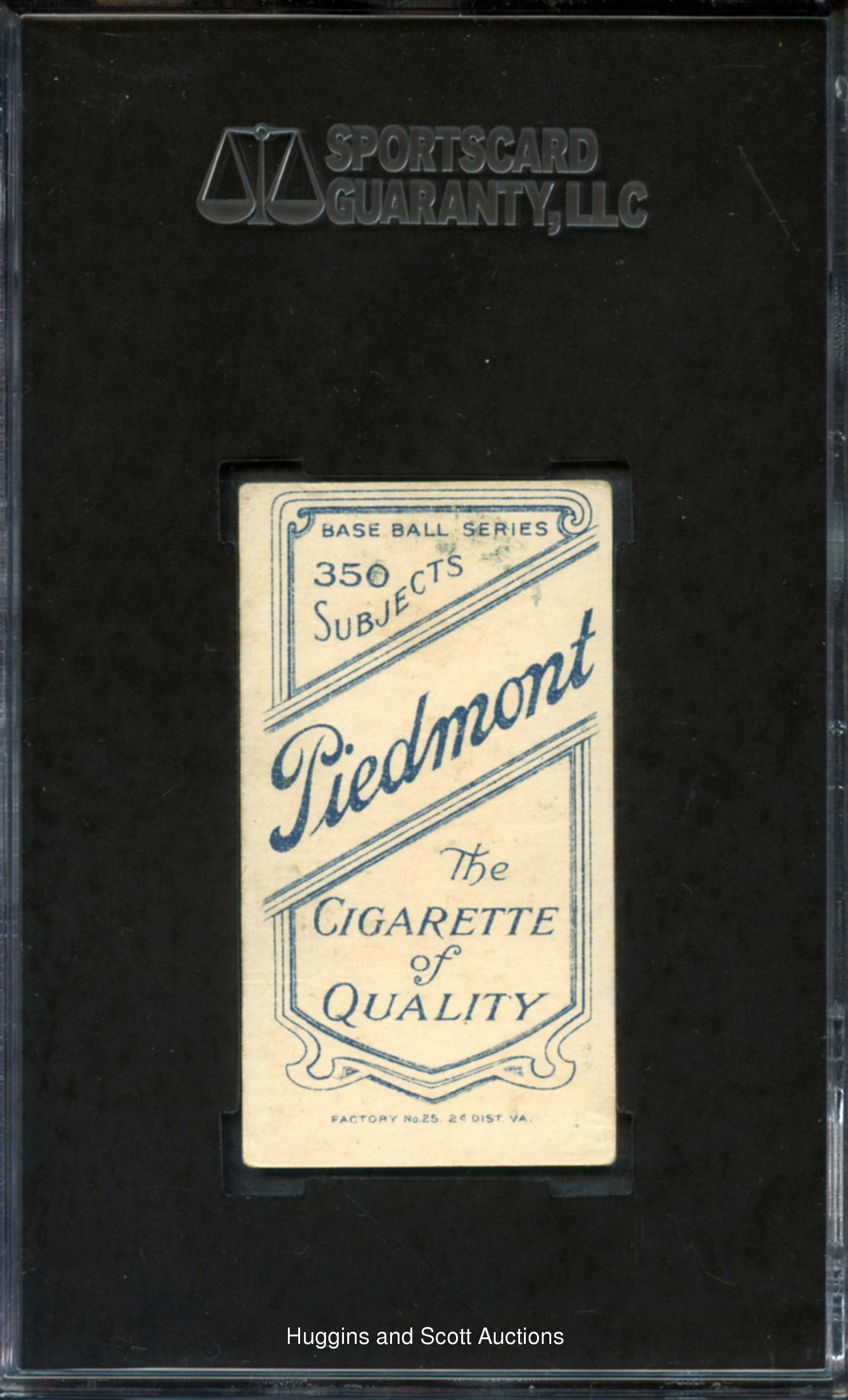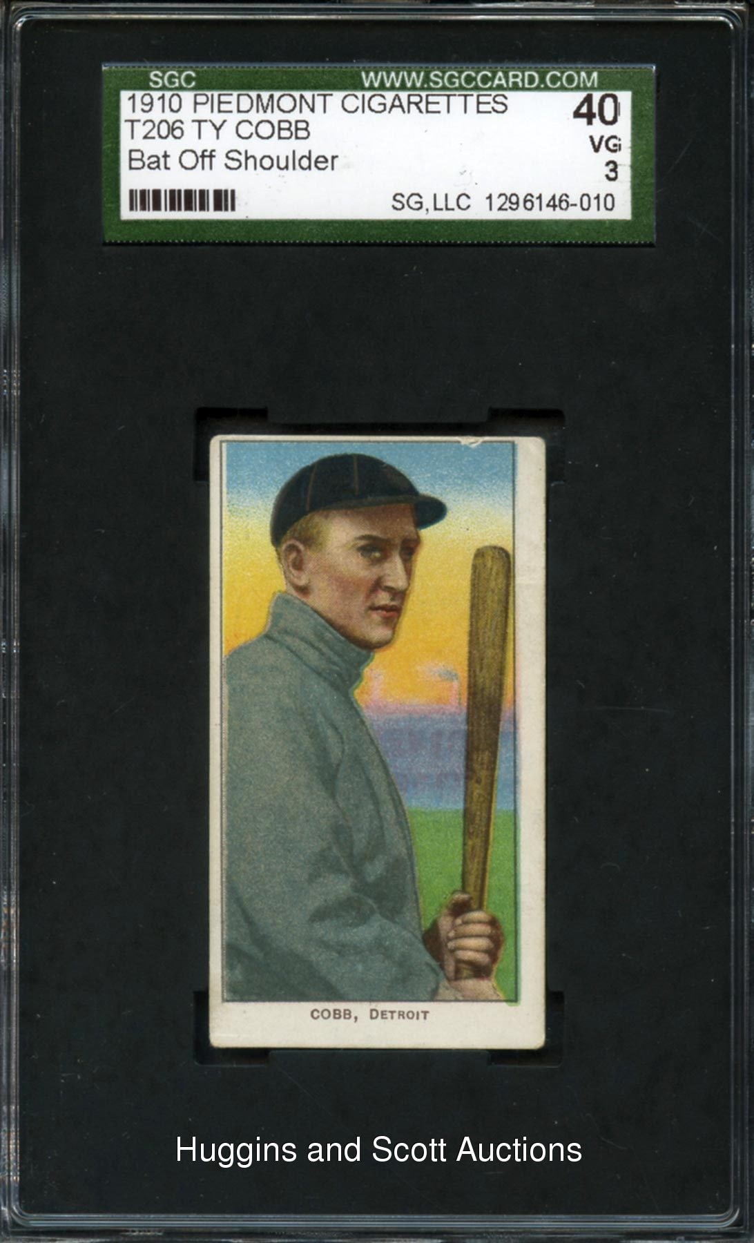 Graded 40 VG 3 by SGC. This 1909-11 T206 White Border Ty Cobb (Bat Off Shoulder) pose will deservedly garner considerable interest from tobacco card enthusiasts. The crease-free artifact is flanked by a clean Piedmont 350 Subjects advertising back. Despite errant top-to-bottom centering, the radiant illustration and relatively clean perimeter proves this "Georgia Peach" to be a worthy proposition.
