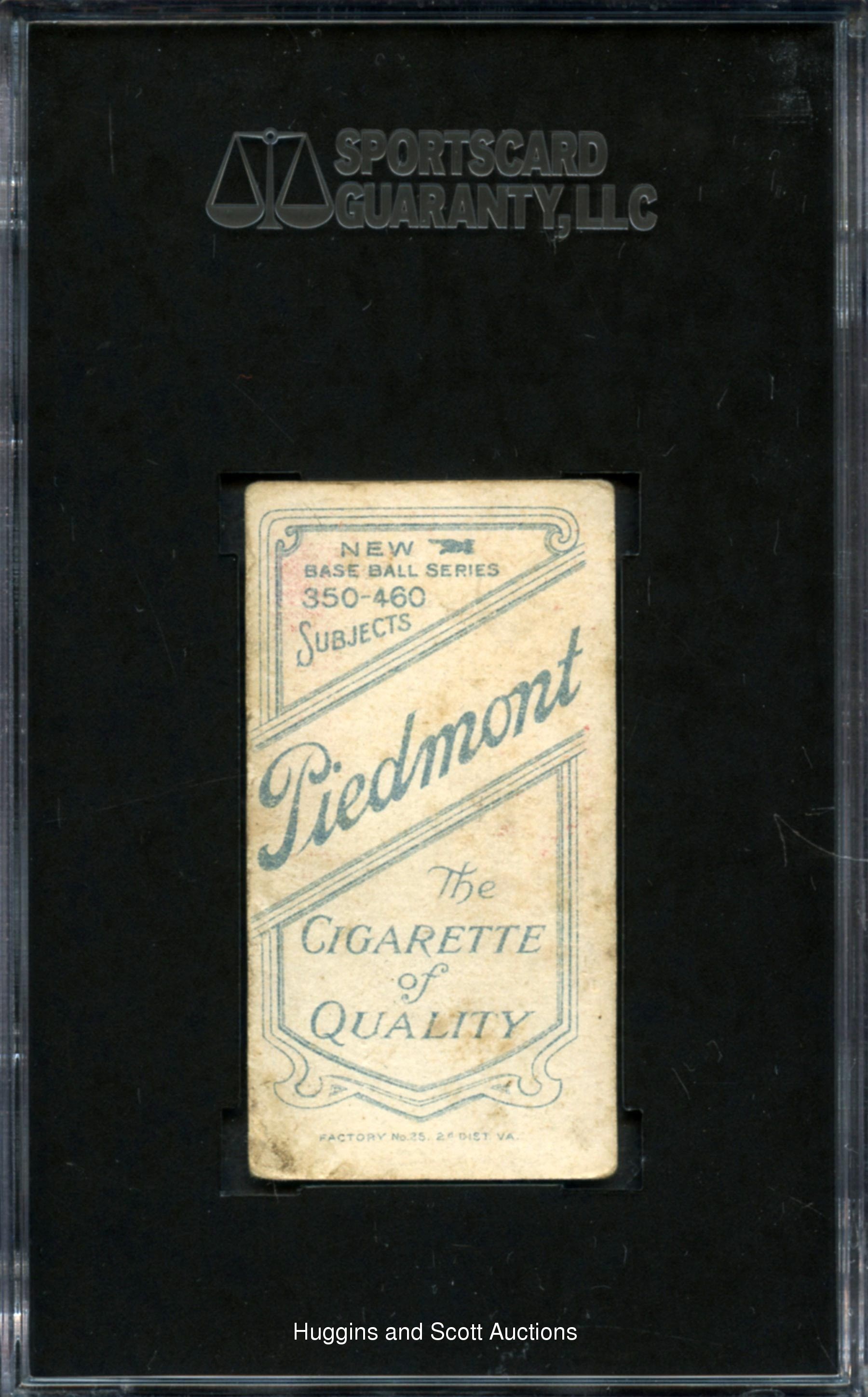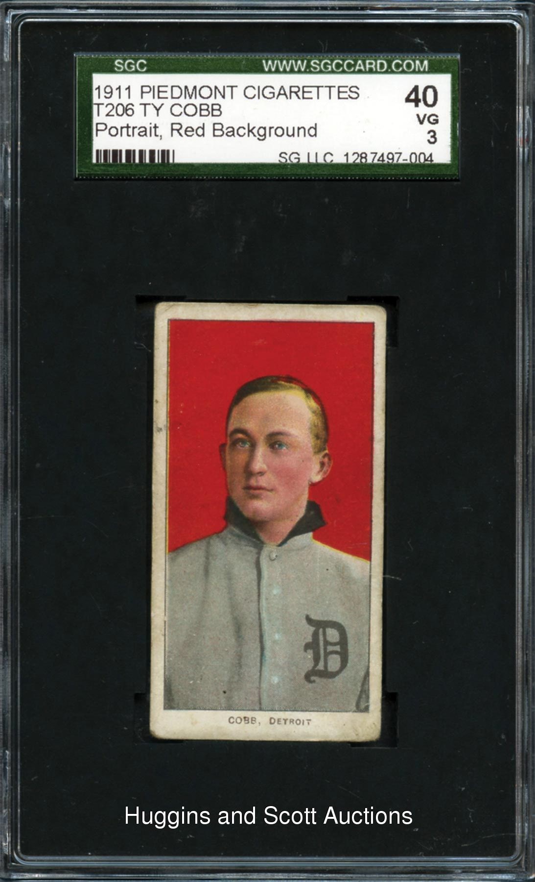 Graded 40 VG 3 by SGC. Tyrus Raymond (Ty) Cobb casts his familiar deadpan on the offered 1909-11 T206 White Borders (Red Portrait) pose. The Piedmont 350-460 Subjects advertising back is lightly struck while superficial obverse wrinkling is relegated toward the corners. Exceptionally vibrant background setting bolstered by lovely uniform and facial accents to the acclaimed subject. Those seeking a mid-grade Cobb for their T206 sets need to look no further than this example!