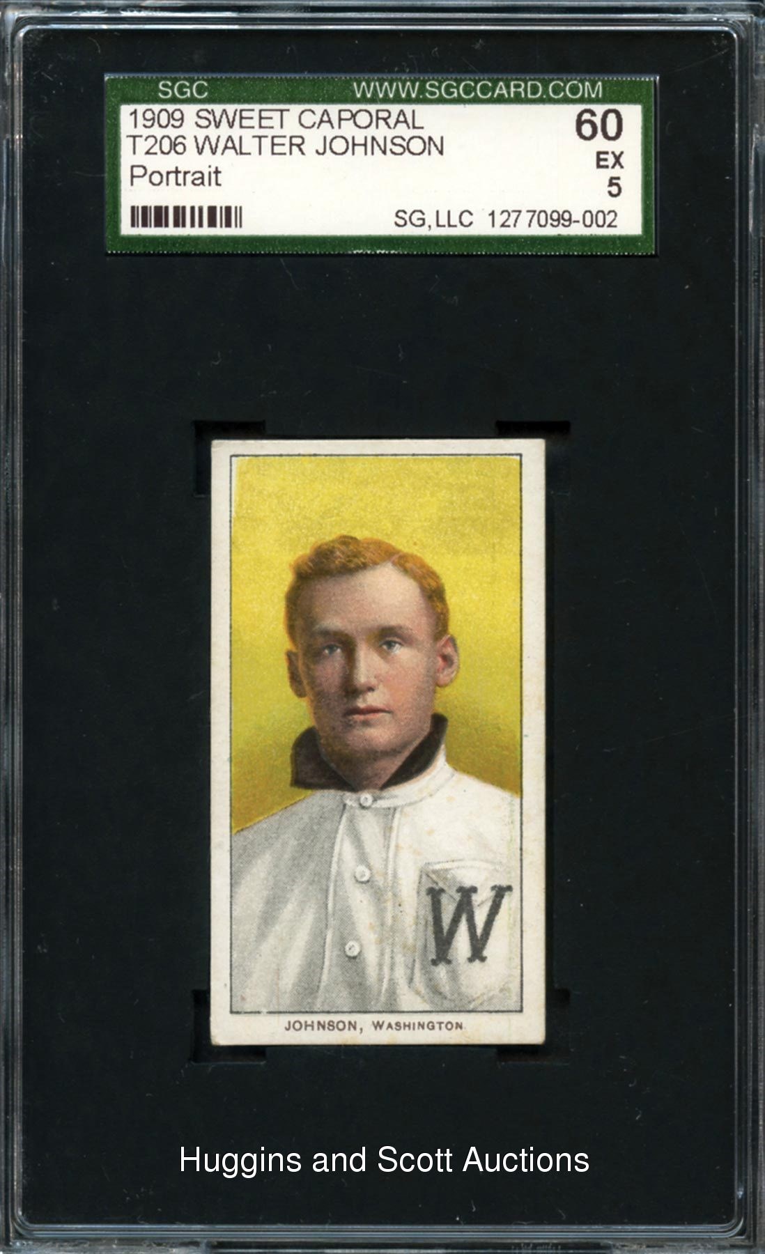 Graded 60 EX 5 by SGC. Simply breathtaking 1909-11 T206 White Borders Walter Johnson portrait. The dominating "Big Train" displays a more genteel disposition on this pint-sized tobacco relic crowned by an exceedingly bright Sweet Caporal advertising back. The properly centered pose of the "Class of 1936" inductee is framed by creamy edges and well-constructed corners. Meets or exceeds over 84% of all similar copies submitted to the third-party grading service.