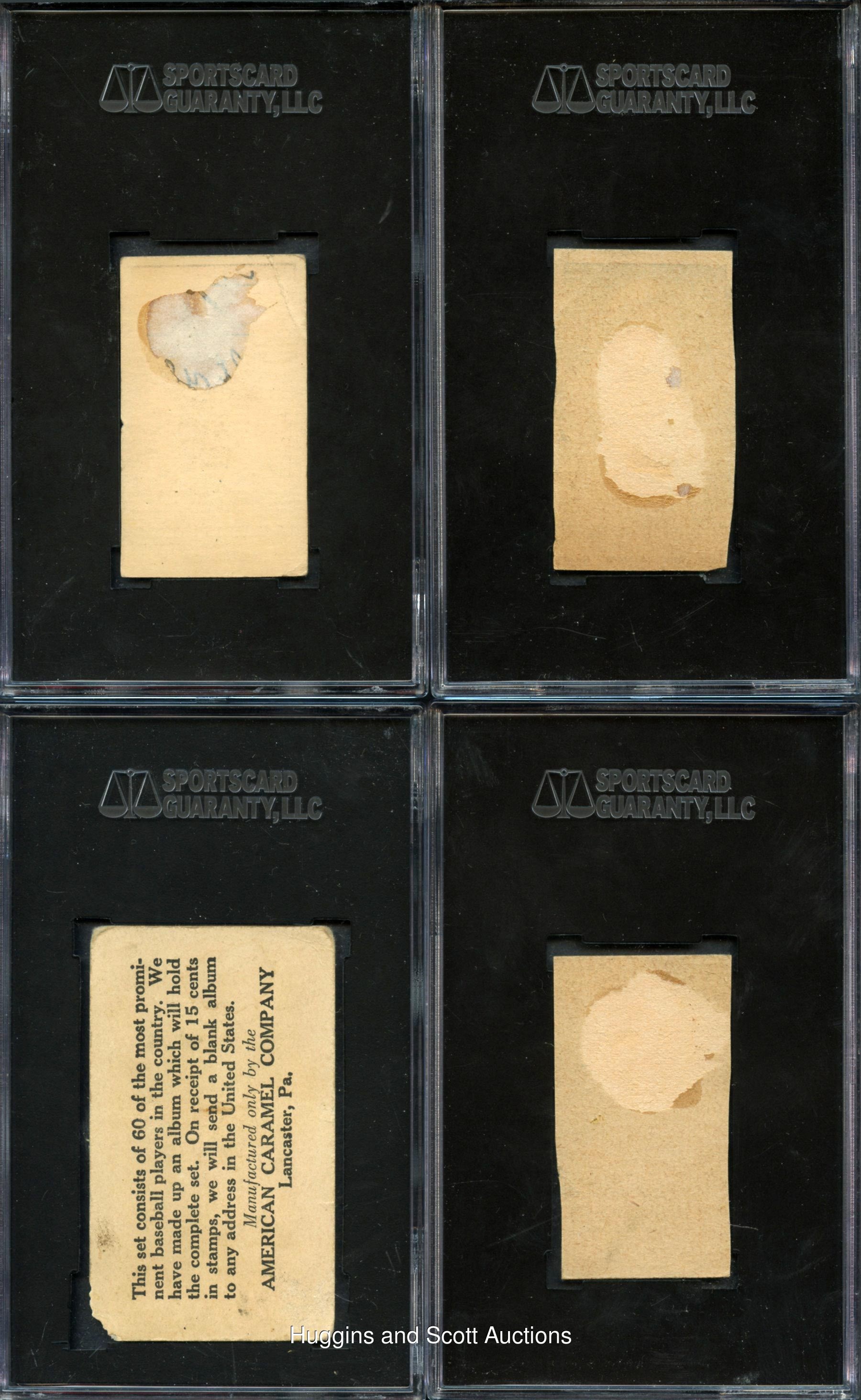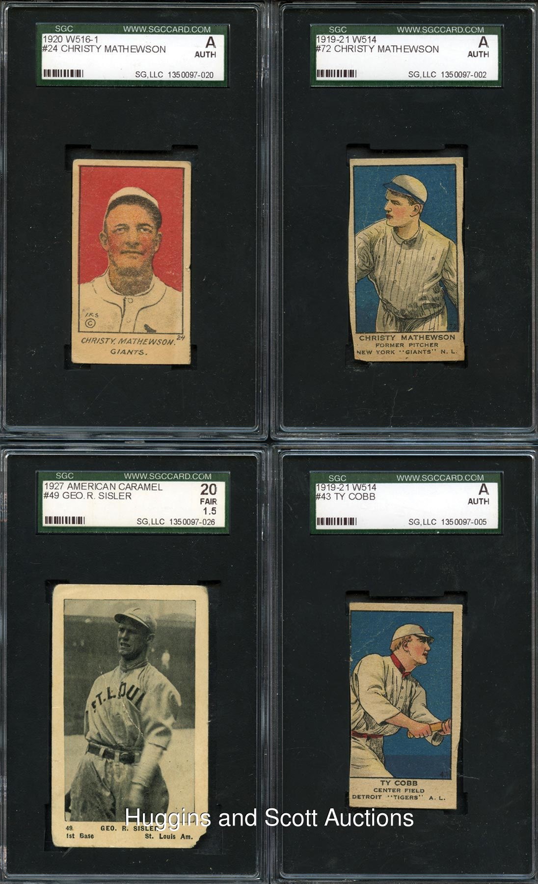 Each graded by SGC. Formidable quartet of 1919-1927 Baseball Hall of Fame samples depicting the monikers of "The Christian Gentleman", "Gentleman George" and "Georgia Peach". Includes: 1919-21 W514: (2 cards, both SGC Authentic) with #43 Cobb, #72 Mathewson; 1920 W516-1: #24 Mathewson (SGC Authentic) and 1927 American Caramel Series of 60: #49 Sisler (SGC 20).