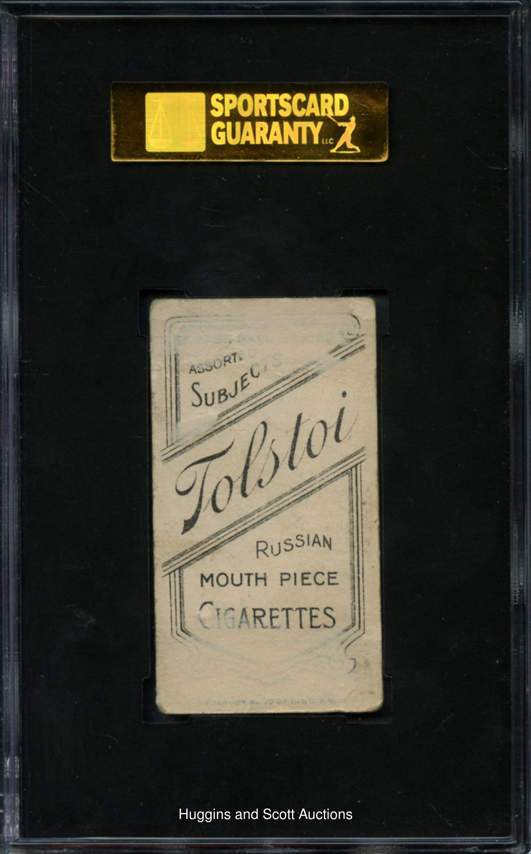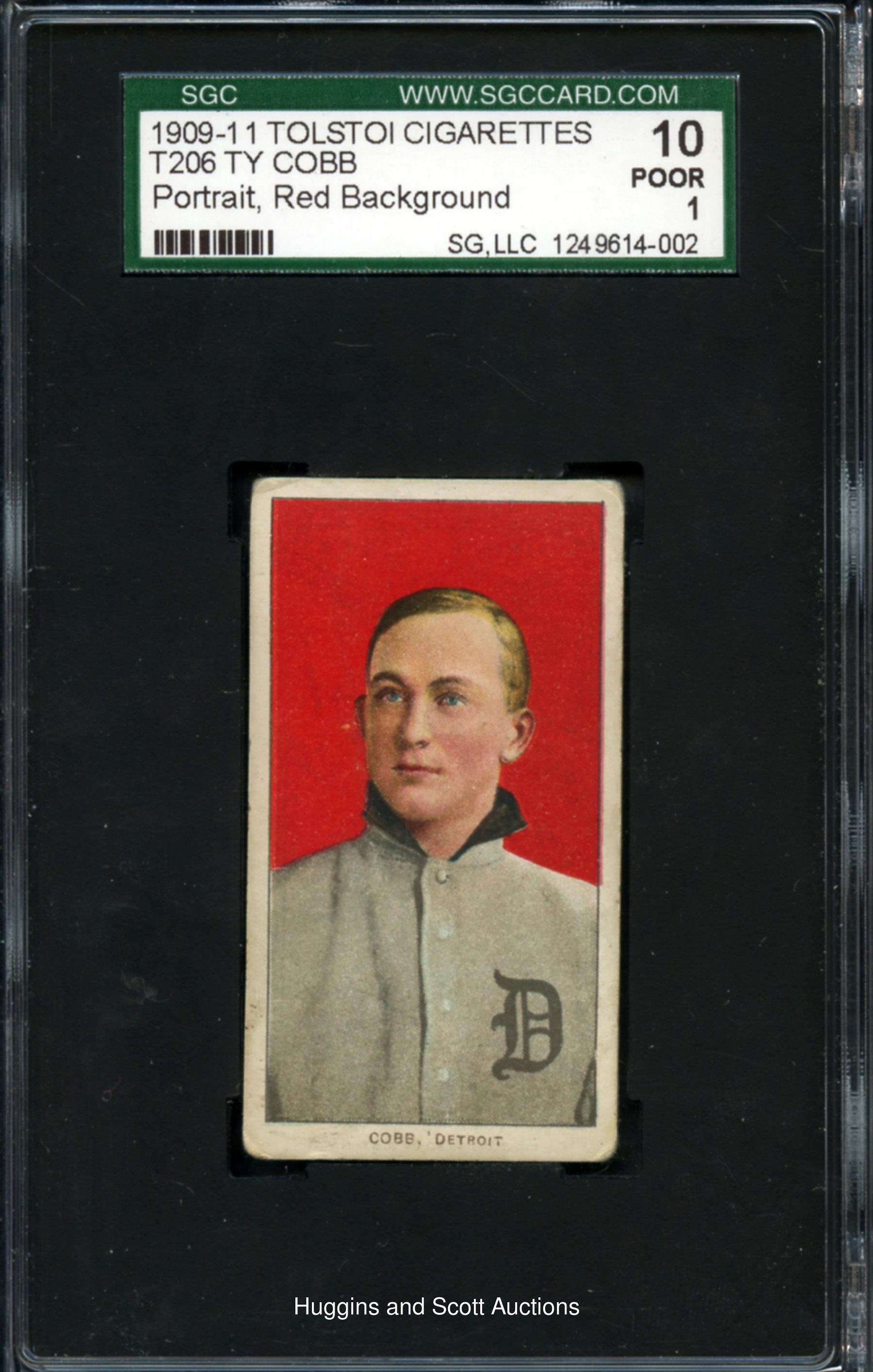 Graded 10 Poor 1 by SGC. Captivating 1909-11 T206 White Borders Ty Cobb (Red Portrait) with a tougher Tolstoi advertising back. The haunting image of the Hall of Fame icon is crease-free and framed by four evenly worn corners, relatively crisp edges and a perfectly contrasted central image. Aside from reverse paper residue due to extraction from a period scrapbook, this card otherwise presents as a mid-grade specimen. A total of 21 copies of this pose have been judged by the third-party service.