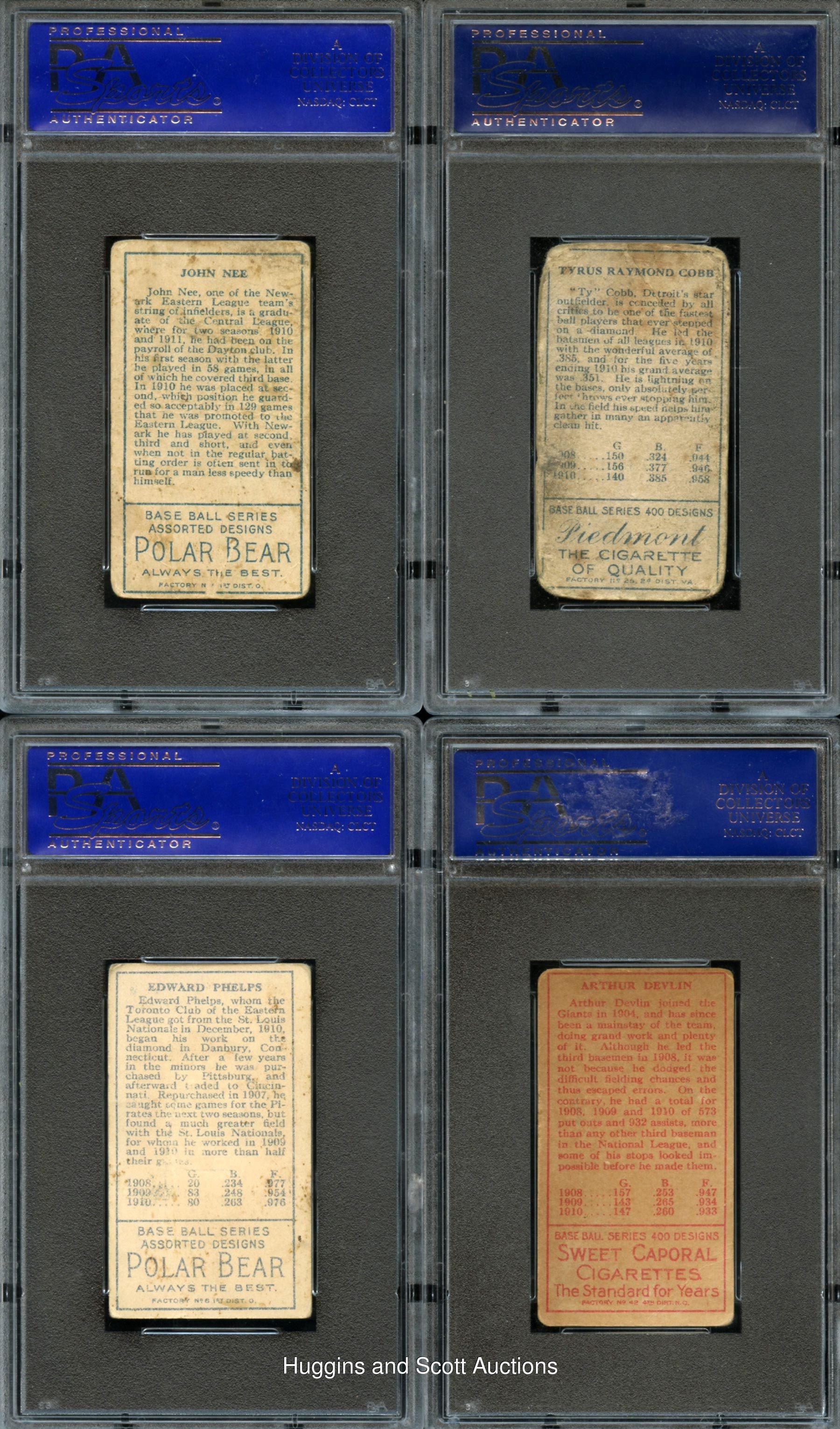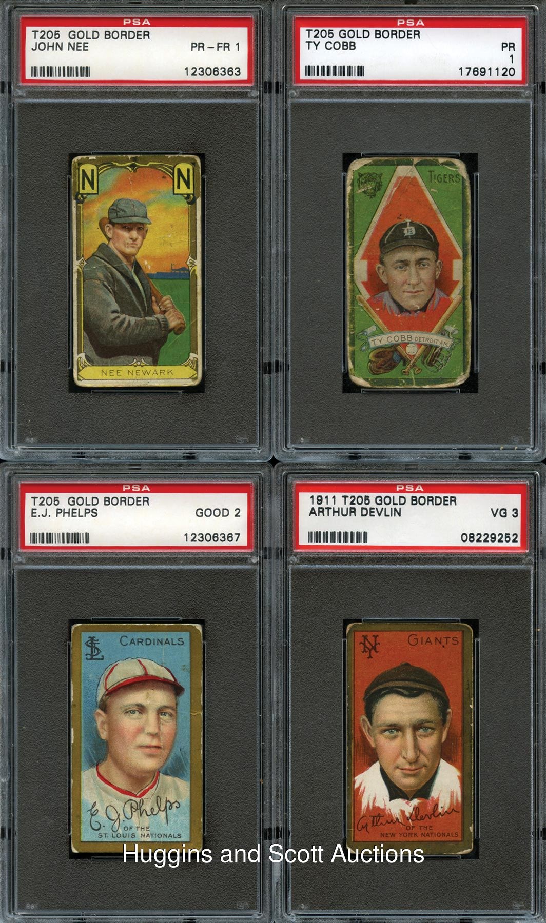 Each graded by PSA. Formidable foursome of 1911 T205 Gold Border tobacco cards. Includes: PSA 3: Devlin (Sweet Caporal); PSA 2: Phelps (Polar Bear); PSA 1: (2 cards) with Cobb (Piedmont) and Nee (Polar Bear).
