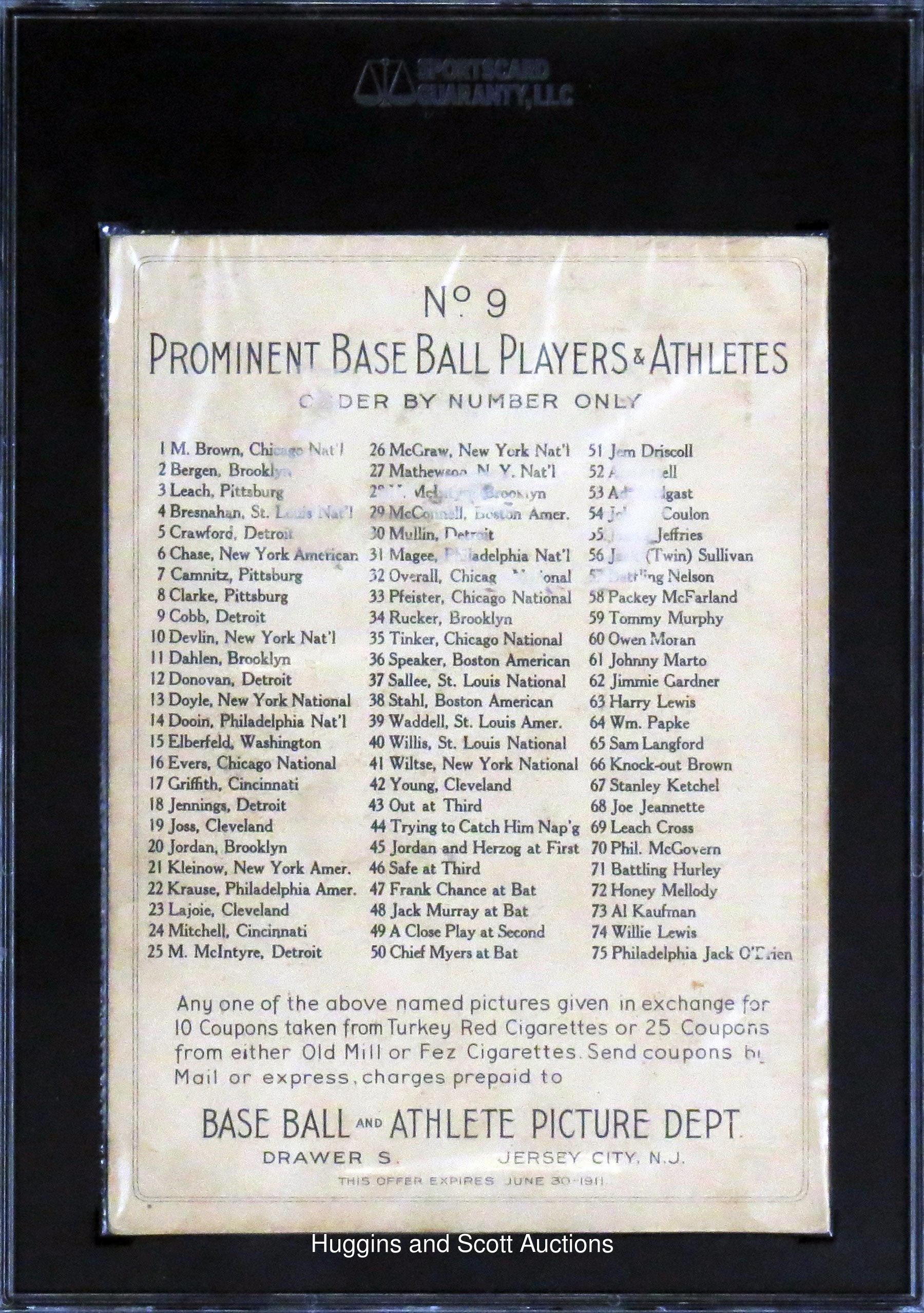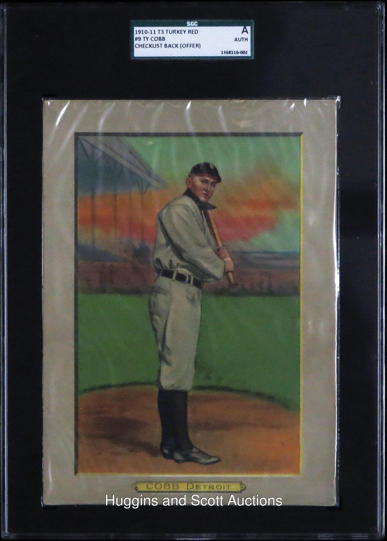 Graded Authentic by SGC. Stunning 1910-11 T3 Turkey Red Cabinets #9 Ty Cobb with a checklist offer reverse. This antiquity presents beautifully with moderate, but even perimeter wear along with a gorgeous multi-color ballpark setting. A minor corner crease traces toward the upper left corner, far apart from the prominent central image. A combination of back glue residue and paper loss along with faint period writing does not disrupt the overall qualities of this century-old treasure.