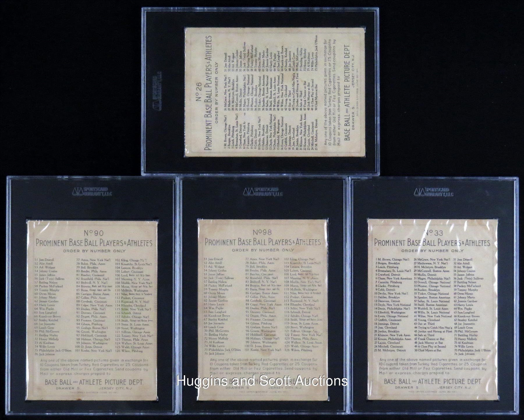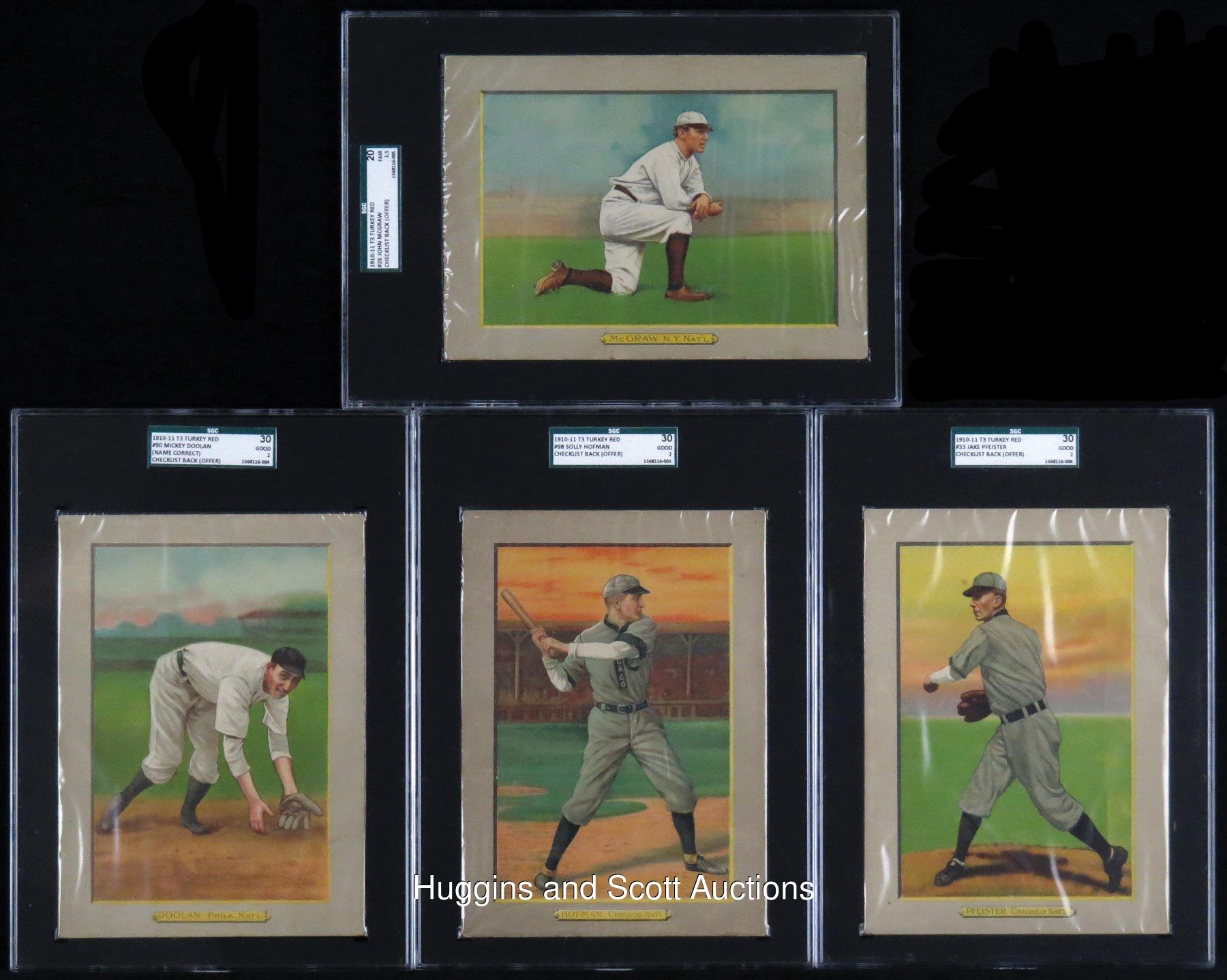 Graded either 30 Good 2 or 20 Fair 1.5 by SGC. Intricate player detailing and intense action sequences are attributes of these four 1910-11 T3 Turkey Red Cabinets. Each antiquity presents at the peak of its technical assessment and displays checklist reverses. Aside from general peripheral wear, the lush obverses display only minor age-induced soiling. Careful removal from a period album along with faint reverse writing account for the assessments. Includes: SGC 30: (3 cards) with #33 Pfeister, #90 Doolan, #98 Hofman and SGC 20: #26 McGraw.