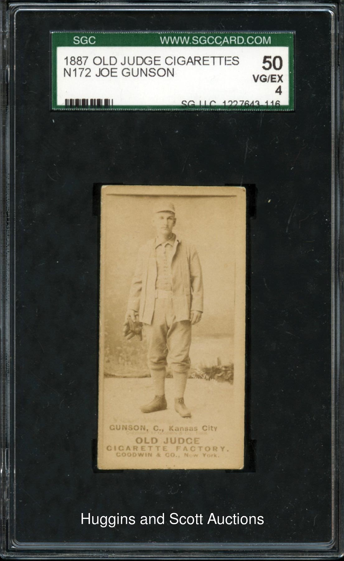 Graded 50 VG-EX 4 by SGC and confirmed as pose 205-4. This 1887 N172 Old Judge Joe Gunson depicts the light-hitting catcher during his stint with the Kansas City Cowboys of the American Association. The tobacco relic displays only general perimeter wear consistent with the technical judgment. The blank reverse concedes a horizontal crease along the upper edge which does not protrude the obverse.