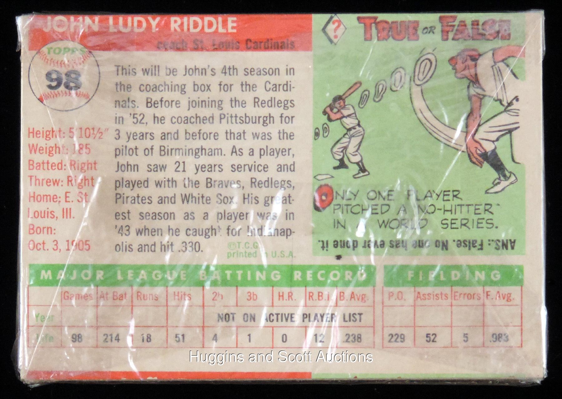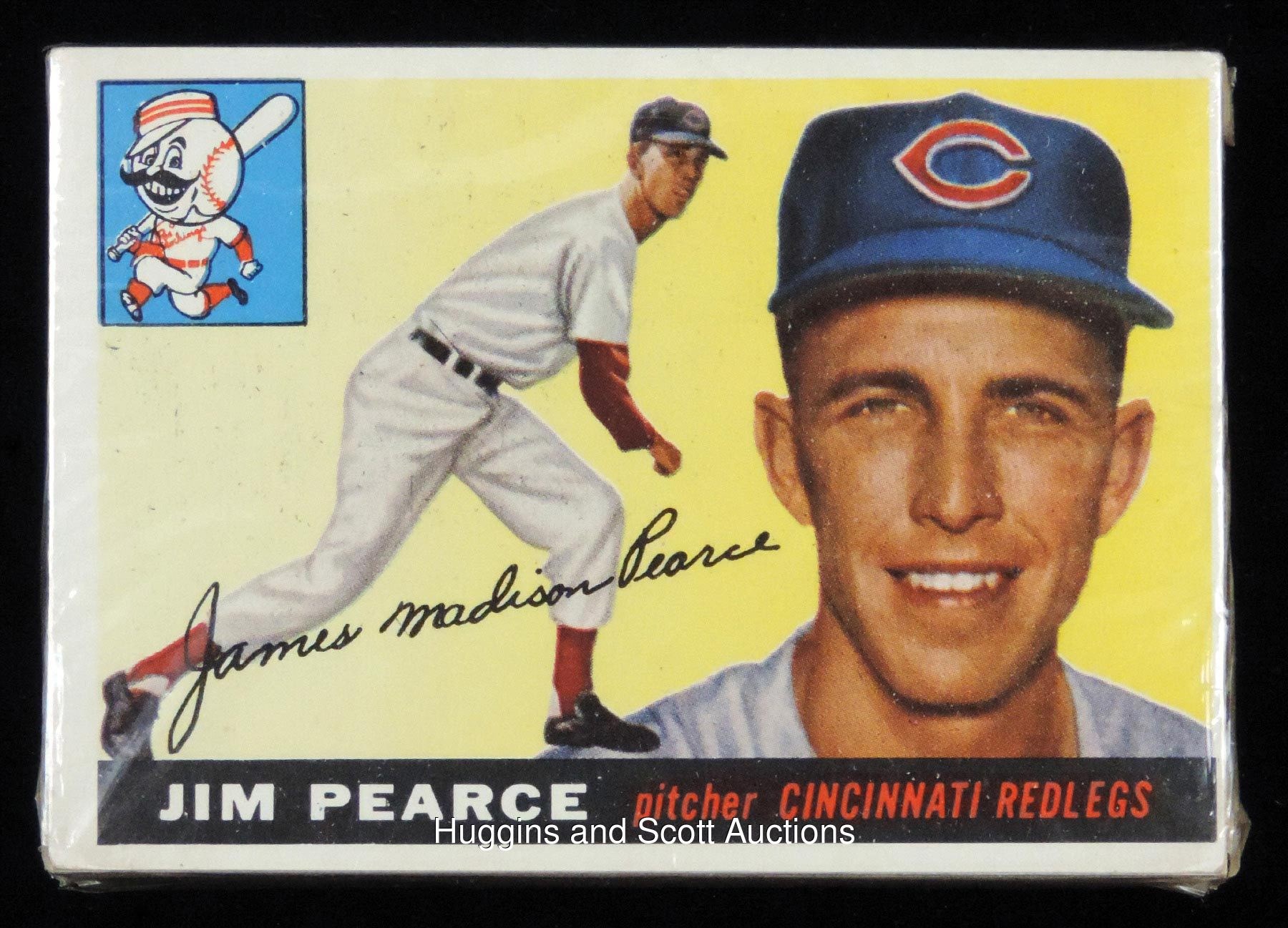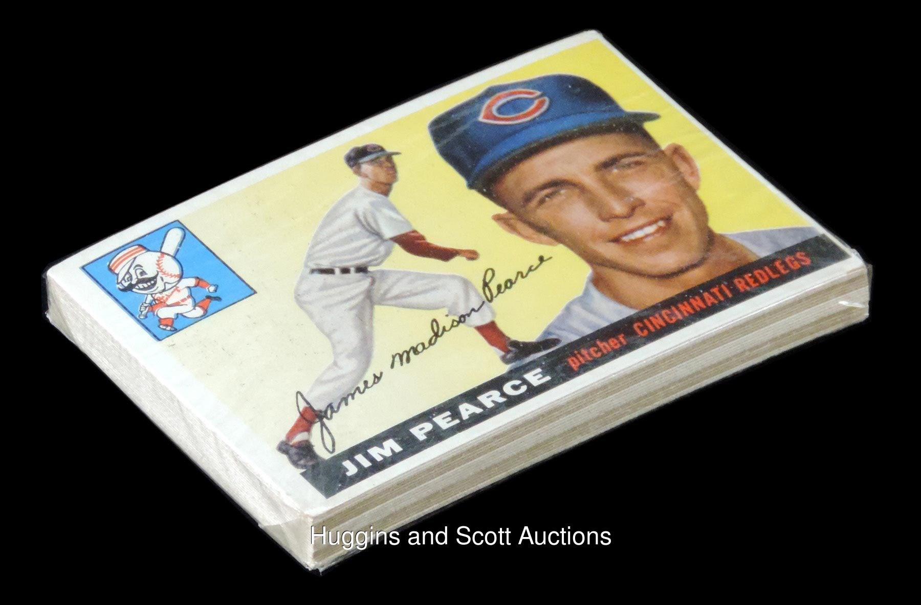 Koufax, Williams, Aaron, Kaline, Banks, Robinson, Killebrew—any of those legends could be lurking inside this snugly wrapped time capsule. Because the back seal is "popped" (that is, the original adhesive has dried out and the flaps are no longer adhered down flat), PSA cannot perform its grading or encapsulation. However, we consulted with expert Steve Hart of BBCE during the recent National Convention and he stands behind this tightly held pack as never having been opened up or having had its contents disturbed. There appears to be approximately 20 cards, with #170 Jim Pearce on top and #98 Johnny Riddle on the bottom. Apparent EX-MT condition with a typical tiny slit in each cellophane corner.