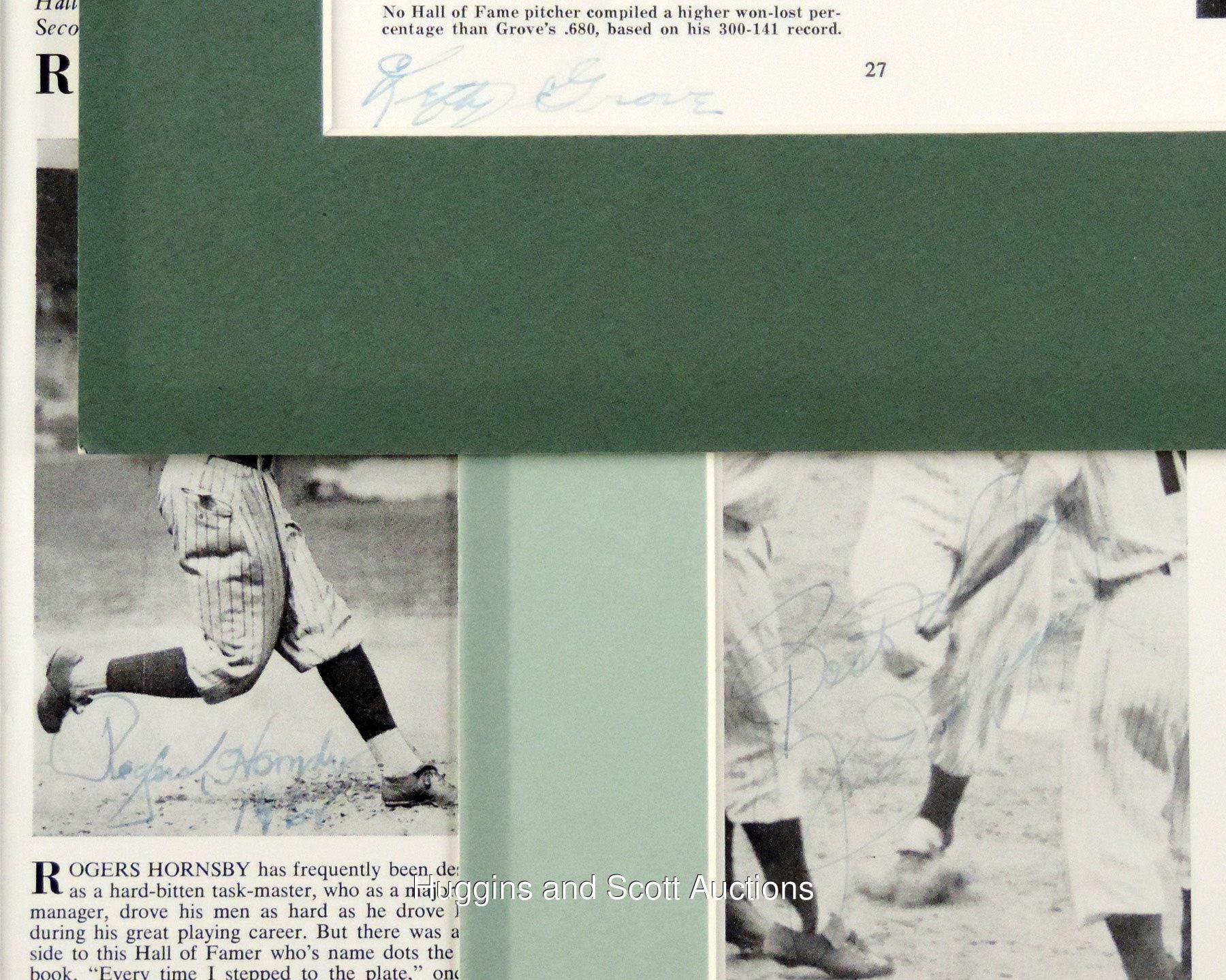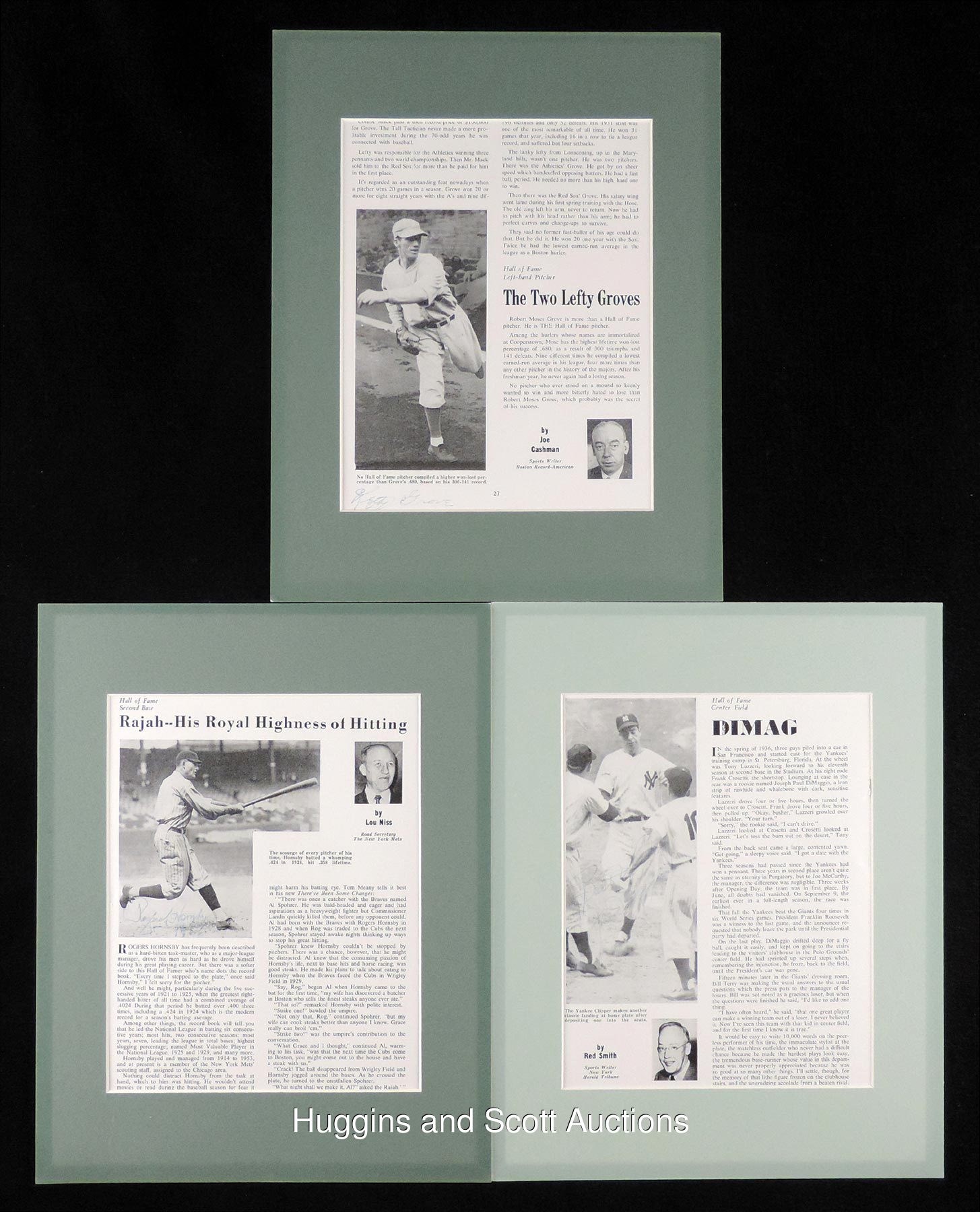 The 7-1/2 x 9-1/2" visible areas rate apparent EX/EX-MT overall and the 11x14 mattes show border toning due to past framing. Each magazine page is taped to the reverse of the matte. Includes: DiMaggio ("5-6"), Hornsby ("8") and Grove ("7-8"). Items were signed for baseball executive Frank Slocum at a Major League dinner. Auction LOA from JSA.