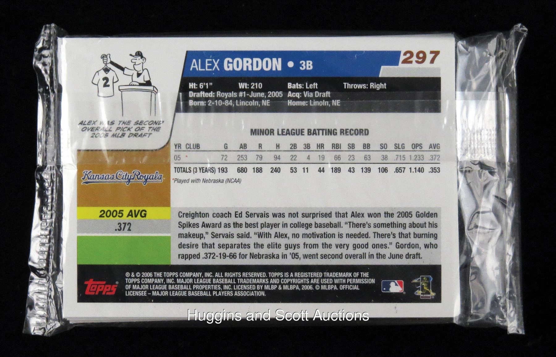 Pulled from production! Due to licensing guidelines, uber-prospect Alex Gordon was supposed to be completely omitted from 2006 Topps Baseball products. However, a hiccup in the trading card department led to only a few hundred #297 copies being "packed out" for public sale. This cello pack includes a whopping (5) copies of the rookie which books for $250 each! This potential windfall is tightly wrapped and pictures the card reverses of the Kansas City Royals star.
