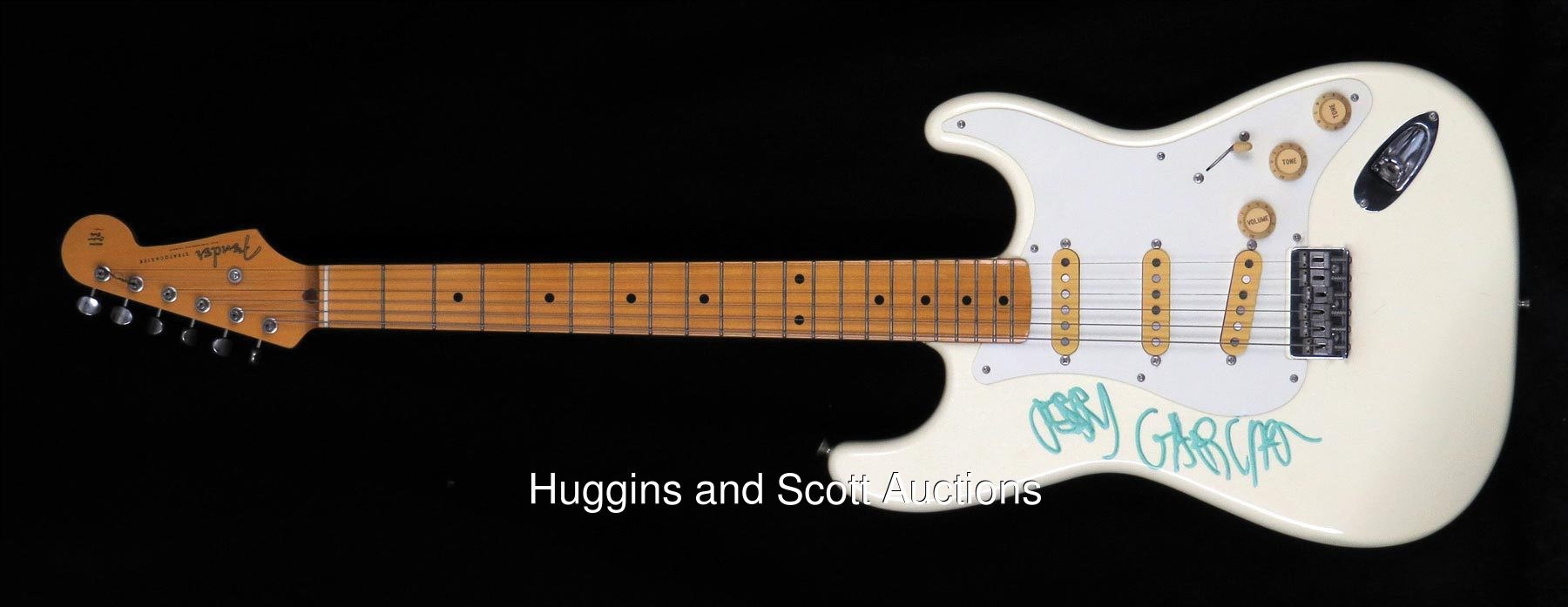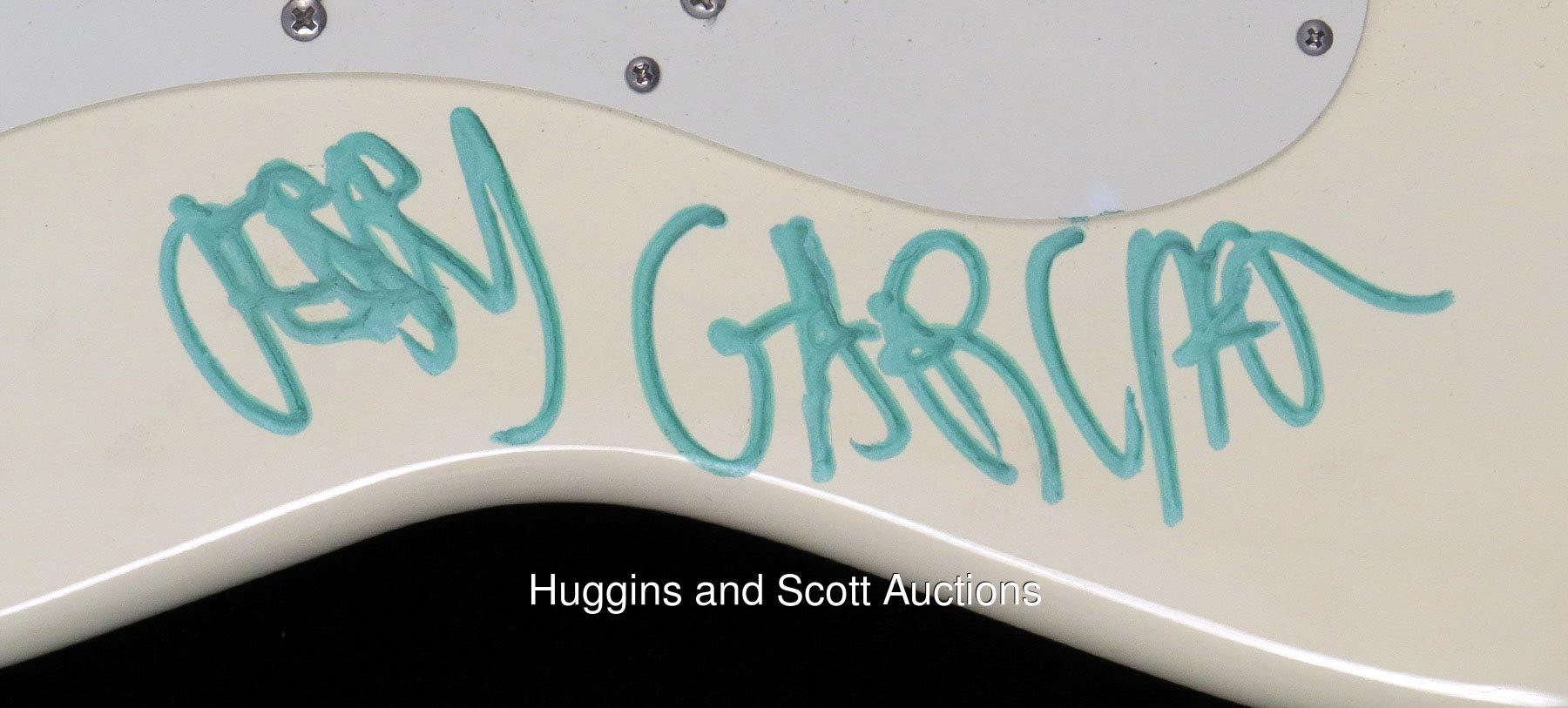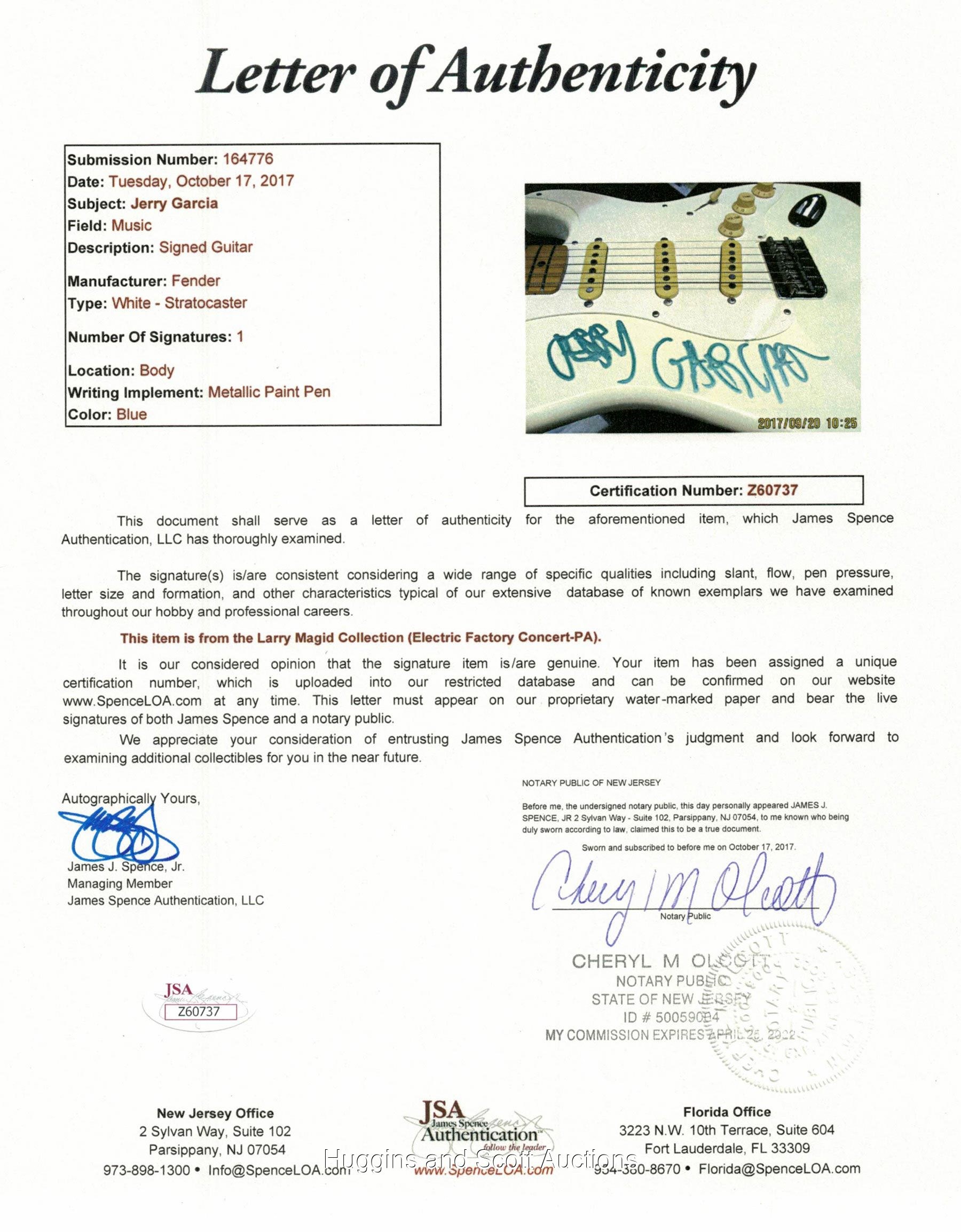Back in May, Jerry"s fabled "Wolf" guitar (which he had loyally played from the early 1970s to early 1990s) sold at auction for just shy of $2 million. And while it"s true that Captain Trips never strummed this particular Fender Strat up on stage, just his signature alone makes it almost equally rare. To our knowledge, this is the first Jerry Garcia single-signed electric guitar ever to reach a major auction house. The large, turquoise-Sharpie signature rates "10" strength and is distinctively whimsical in that it"s upside down relative to the Strat"s right-handed orientation. Which, Larry Magid tells us, was pure Jerry and done in jest. Magid had been promoting Garcia"s Dead shows since the earliest days of the Electric Factory, back in "68, and the two developed a warm collaborative relationship over the years. Please Note: Every single autograph in the Larry Magid Collection was obtained first-hand by Magid during personal, concert-related interactions with the legendary musicians themselves. Every single autograph comes with Larry’s signed LOA attesting to its authenticity, as well as a Full LOA from JSA. Each signed guitar is in unplayed NM condition and comes in a zipper guitar case.