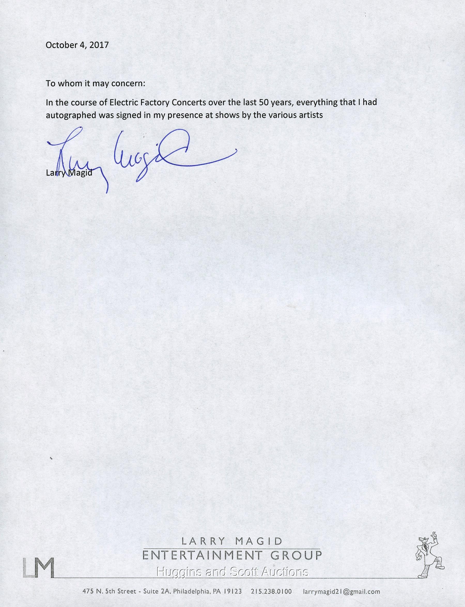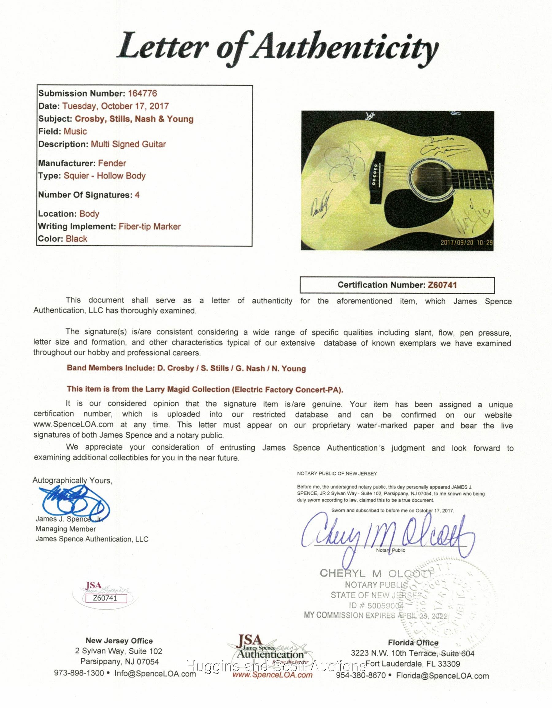 Featuring black-Sharpie "8-9" signatures of David Crosby, Stephen Stills, Graham Nash and Neil Young.Please Note: Every single autograph in the Larry Magid Collection was obtained first-hand by Magid during personal, concert-related interactions with the legendary musicians themselves. Every single autograph comes with Larry’s signed LOA attesting to its authenticity, as well as a Full LOA from JSA (specifically designating the Magid Collection). Each signed guitar is in unplayed NM condition and comes in a soft guitar case.
