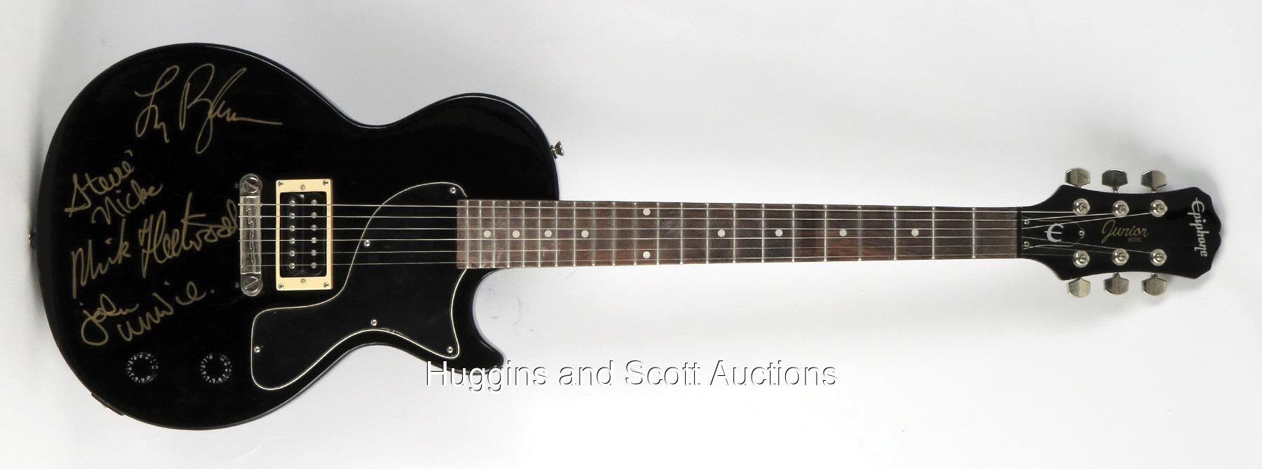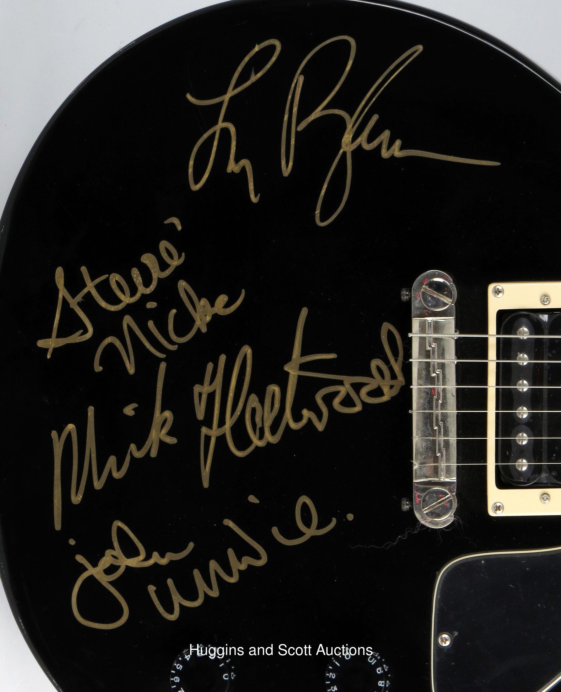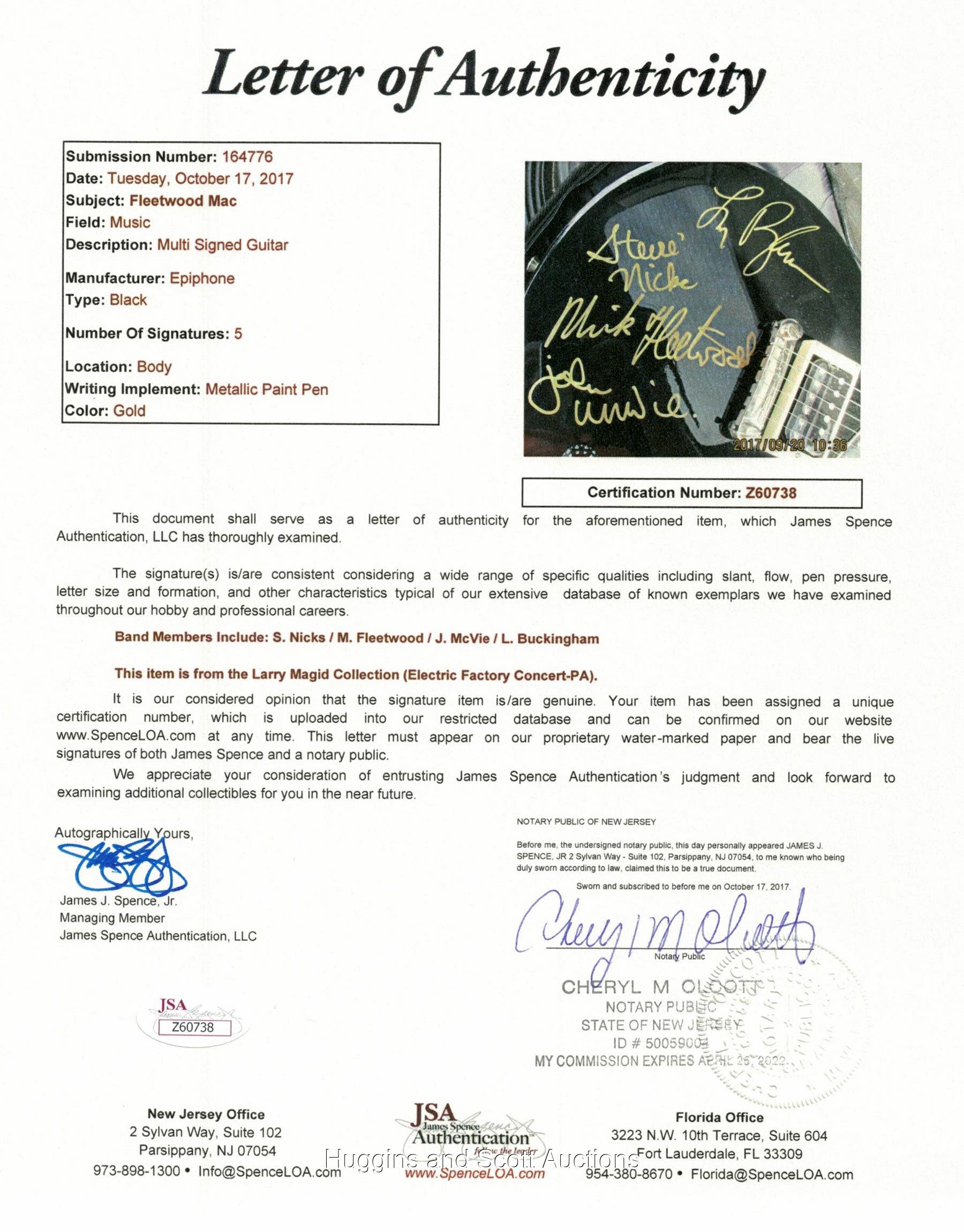 Featuring gold-Sharpie "10" signatures of Mick Fleetwood, Stevie Nicks, John McVie and Lindsey Buckingham.Please Note: Every single autograph in the Larry Magid Collection was obtained first-hand by Magid during personal, concert-related interactions with the legendary musicians themselves. Every single autograph comes with Larry’s signed LOA attesting to its authenticity, as well as a Full LOA from JSA (specifically designating the Magid Collection). Each signed guitar is in unplayed NM condition and comes in a soft guitar case.