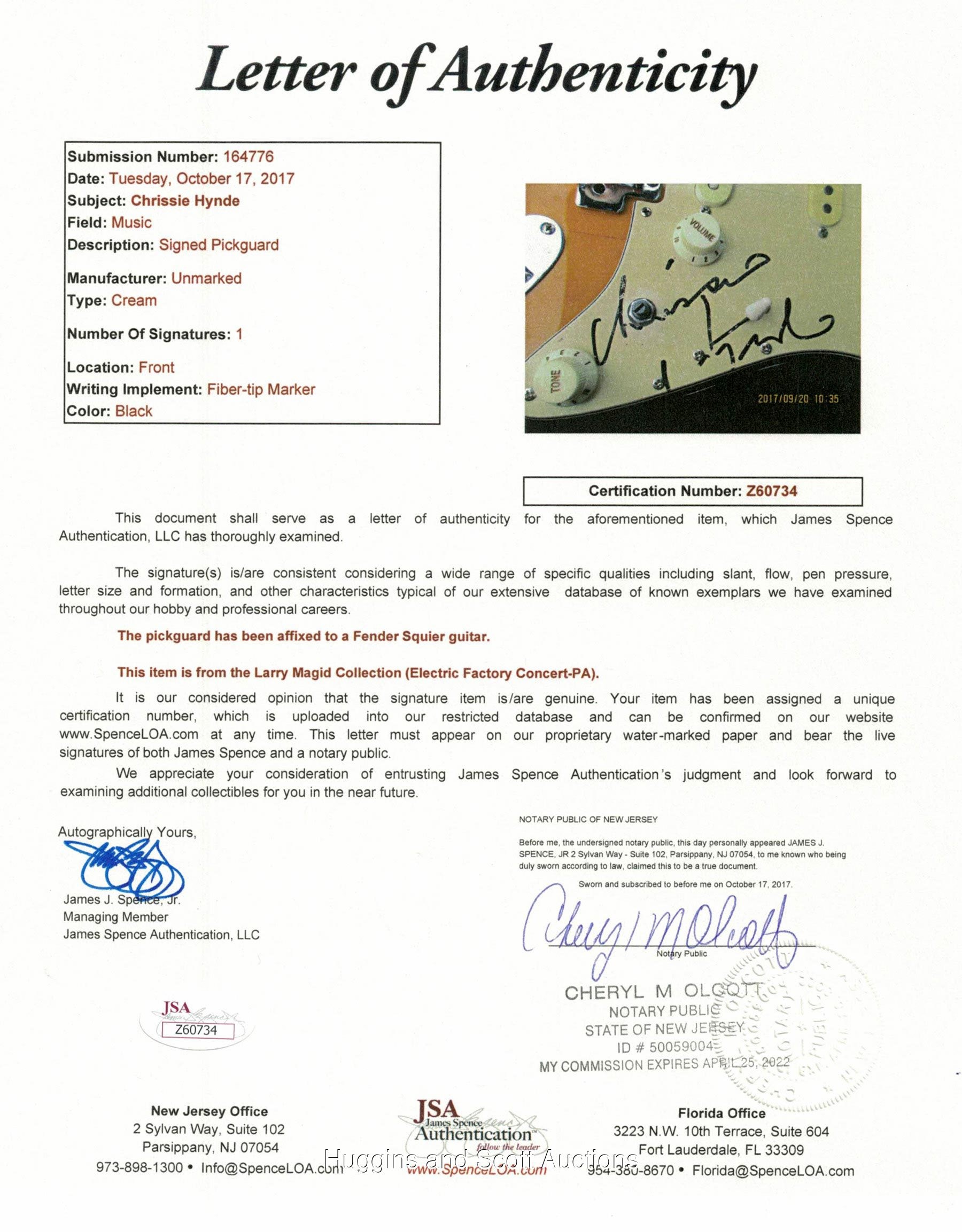 Featuring Hynde"s black-Sharpie "7-8" signature.Please Note: Every single autograph in the Larry Magid Collection was obtained first-hand by Magid during personal, concert-related interactions with the legendary musicians themselves. Every single autograph comes with Larry’s signed LOA attesting to its authenticity, as well as a Full LOA from JSA (specifically designating the Magid Collection). Each signed guitar is in unplayed NM condition and comes in a soft guitar case.