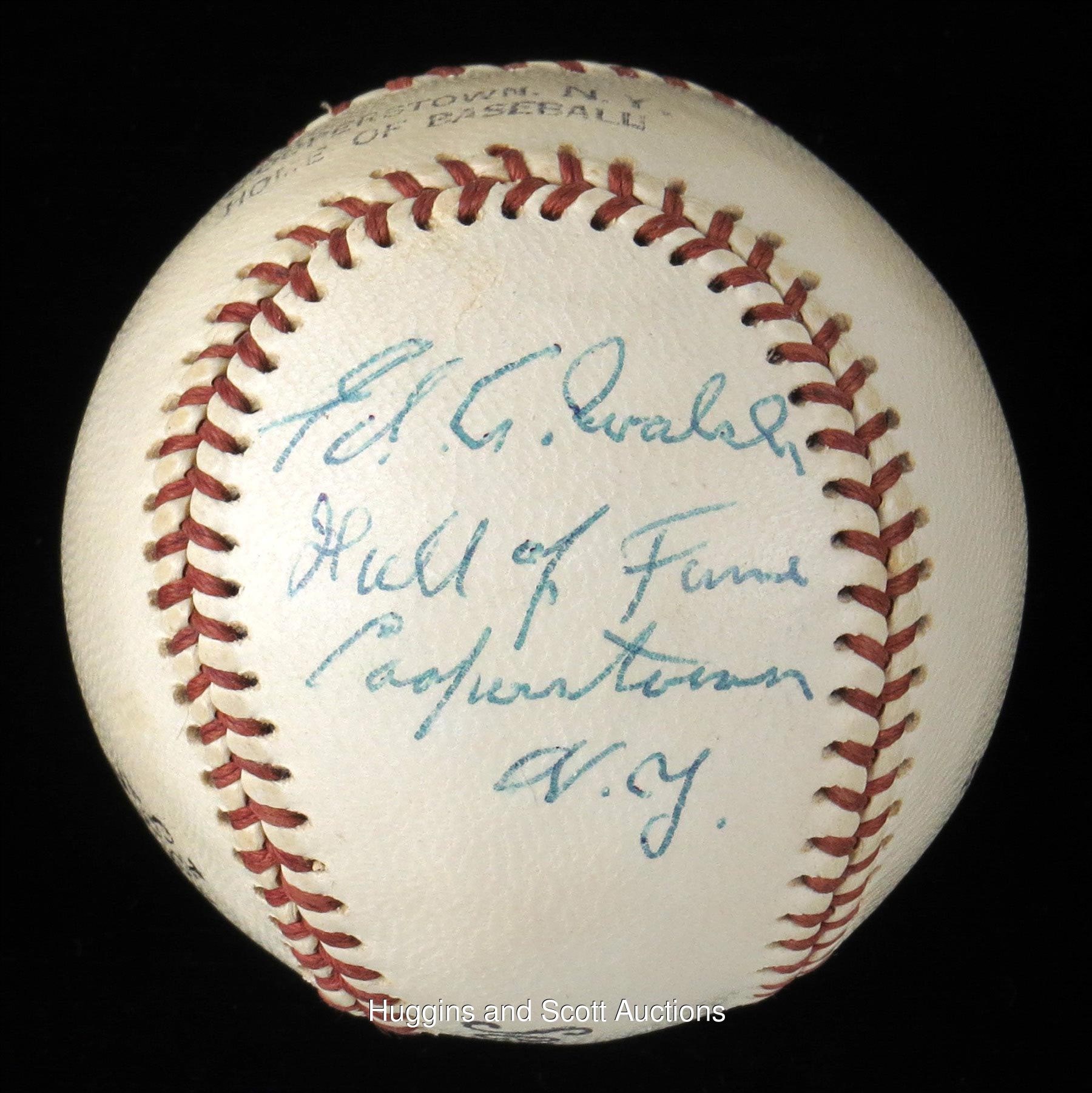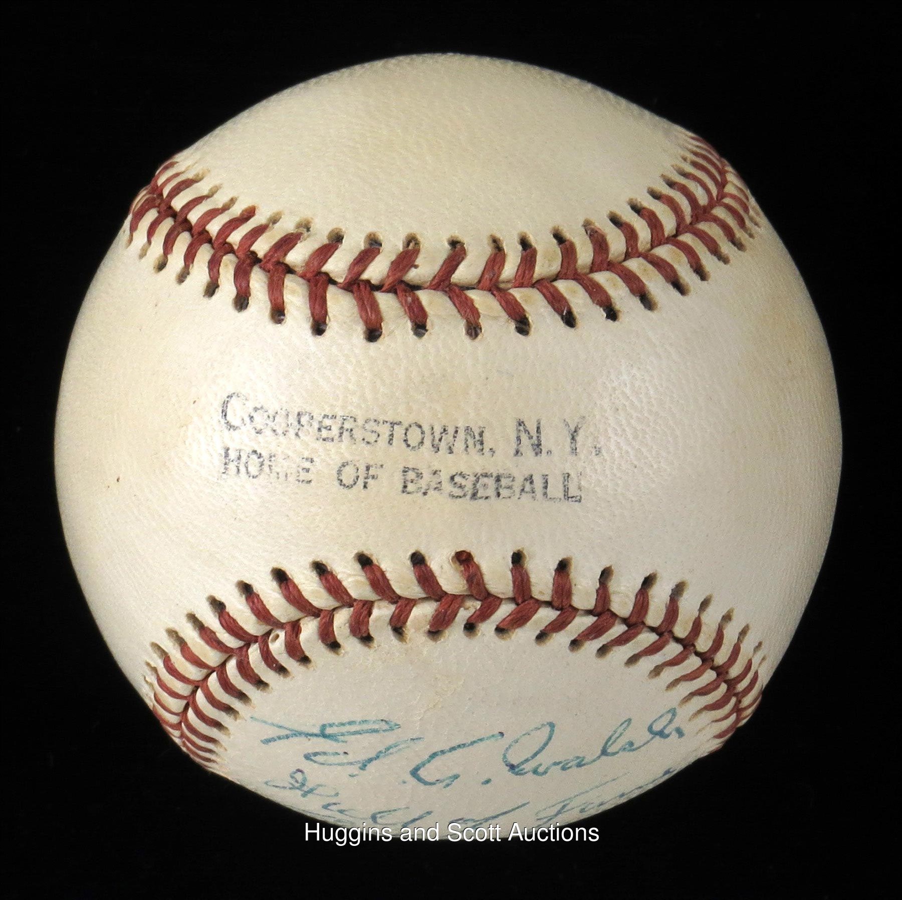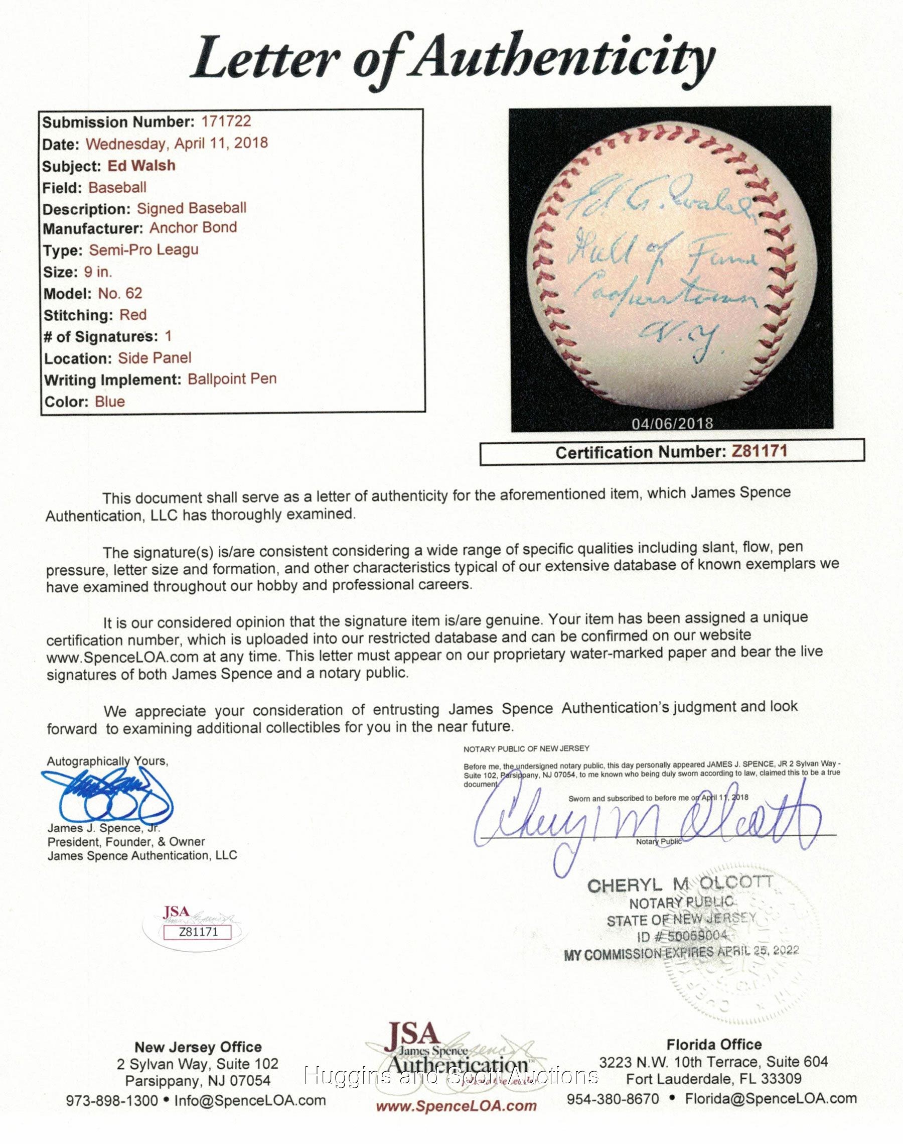 The finest Ed Walsh single to date hit the auction block in 2012 and sold for over $14,000. Forgive us, but we believe this one to be superior. And here"s why: First, provenance-wise, it was obtained first-hand by noted autograph seeker Charles Evers, who often visited players in their homes, and whose personal notes attest to having acquired Walsh"s signature at the legend"s home in Cheshire, Connecticut. A frequent Hall of Fame Weekend attendee, Evers supplied Walsh with a "Semi-Pro League" (de Beer & Son) ball that is stamped as having been issued in Cooperstown, and Big Ed appropriately added the inscription, "Hall of Fame / Cooperstown / N.Y." Second, the attractiveness of Walsh"s consistent blue-ballpoint "8-9" signature—in combination with the HOF inscription—can hardly be overstated. By contrast, the aforementioned predecessor that sold for such a princely sum in 2012 bore a disjointed inscription, where the word "White" appeared on the sweet spot and then "Sox" was drawn in logo form on a separate panel. Moreover, that $14,000 ball was quite soiled and toned (with light stampings), whereas Evers" exemplar has been well-protected and dutifully cared for over these many decades. Indeed, given the extreme rarity and extraordinary quality, it"s not outside the realm of possibility for this Walsh sphere to rival the adjacently offered Mathewson and Ruth cuts as the most valuable gem in the entire Charles Evers Autograph Collection. Full LOA from JSA.