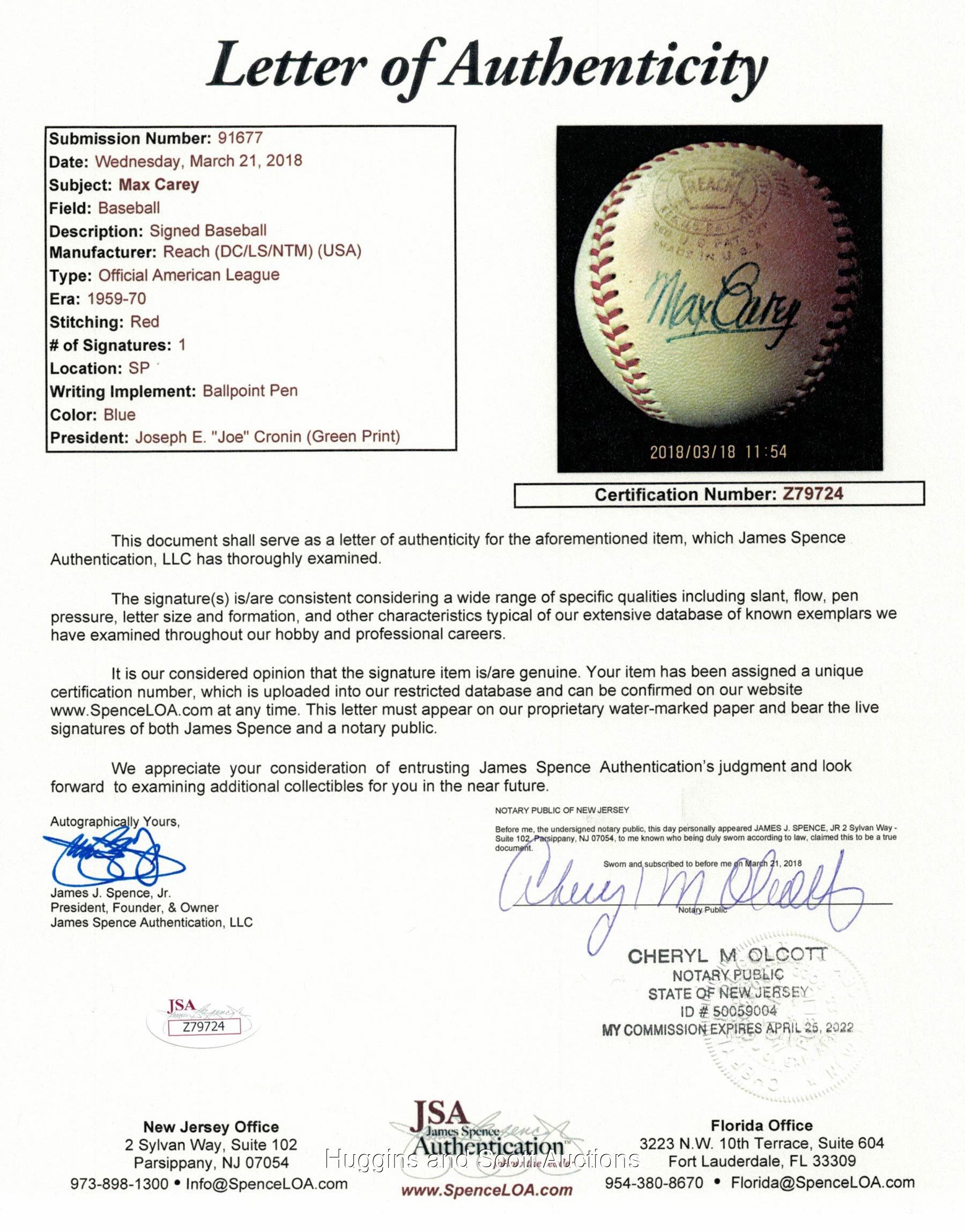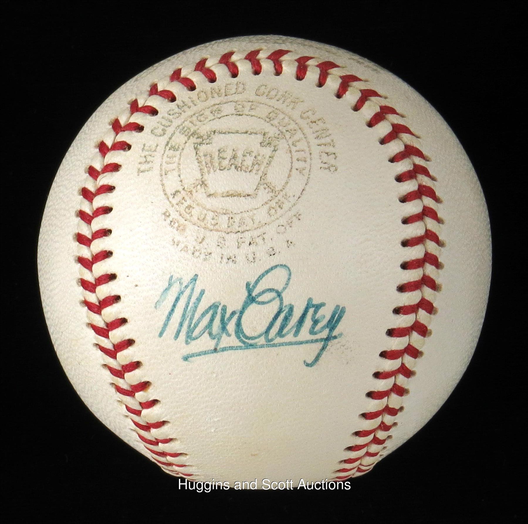 The few Max Carey singles that have ever reached auction have consistently sold for between $3,000 and $5,000, with one particular 1930s example soaring over $7,000. We believe the beauty presented here to be the best of them all in terms of condition and visual splendor. It"s a clean, creamy OAL (Cronin) ball boasting Carey"s vivid blue-ink "9" signature that leaps off the Reach panel with remarkable visual contrast. According to Charles Evers" notes, he obtained the autograph at Carey"s Miami Beach home in 1966—five years after Carey"s Hall of Fame induction, and ten years before his death. Full LOA from JSA.