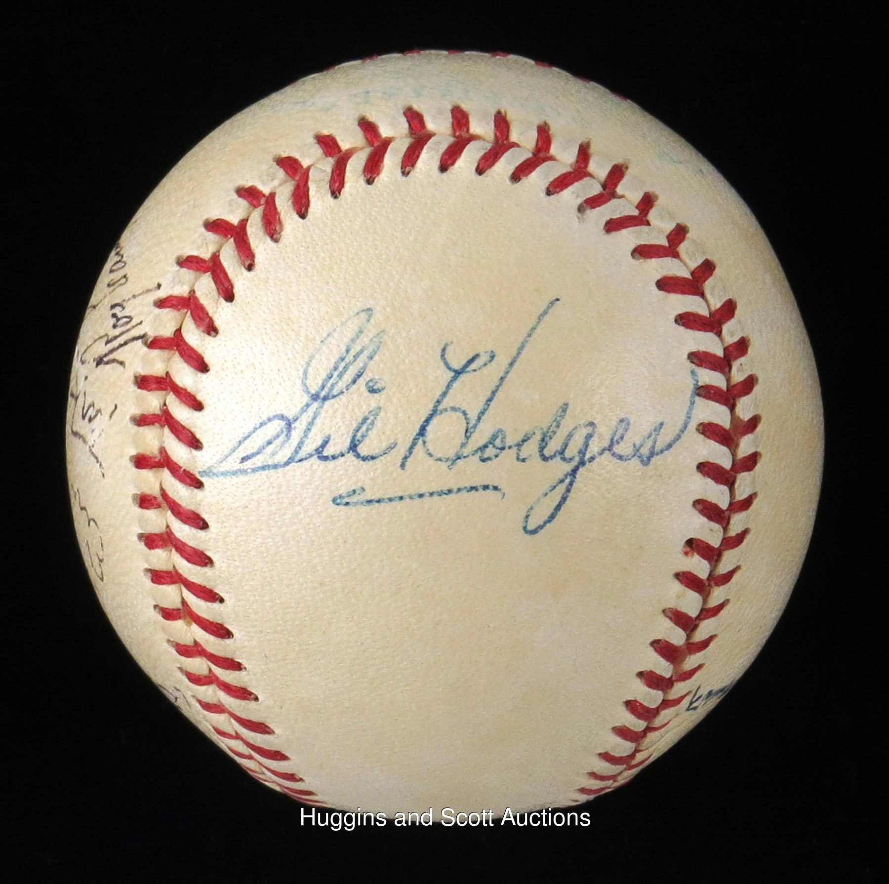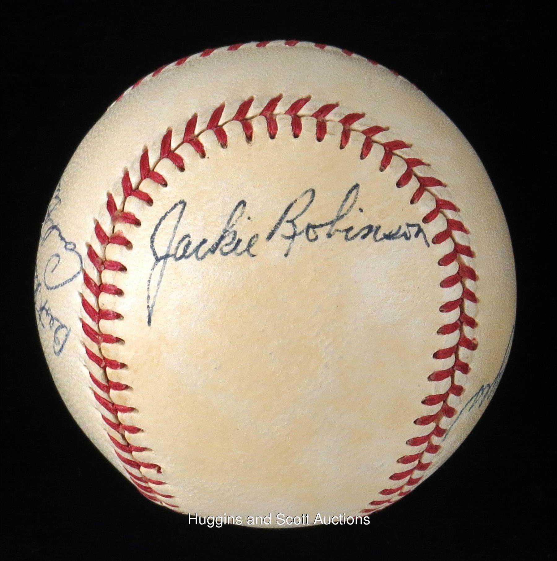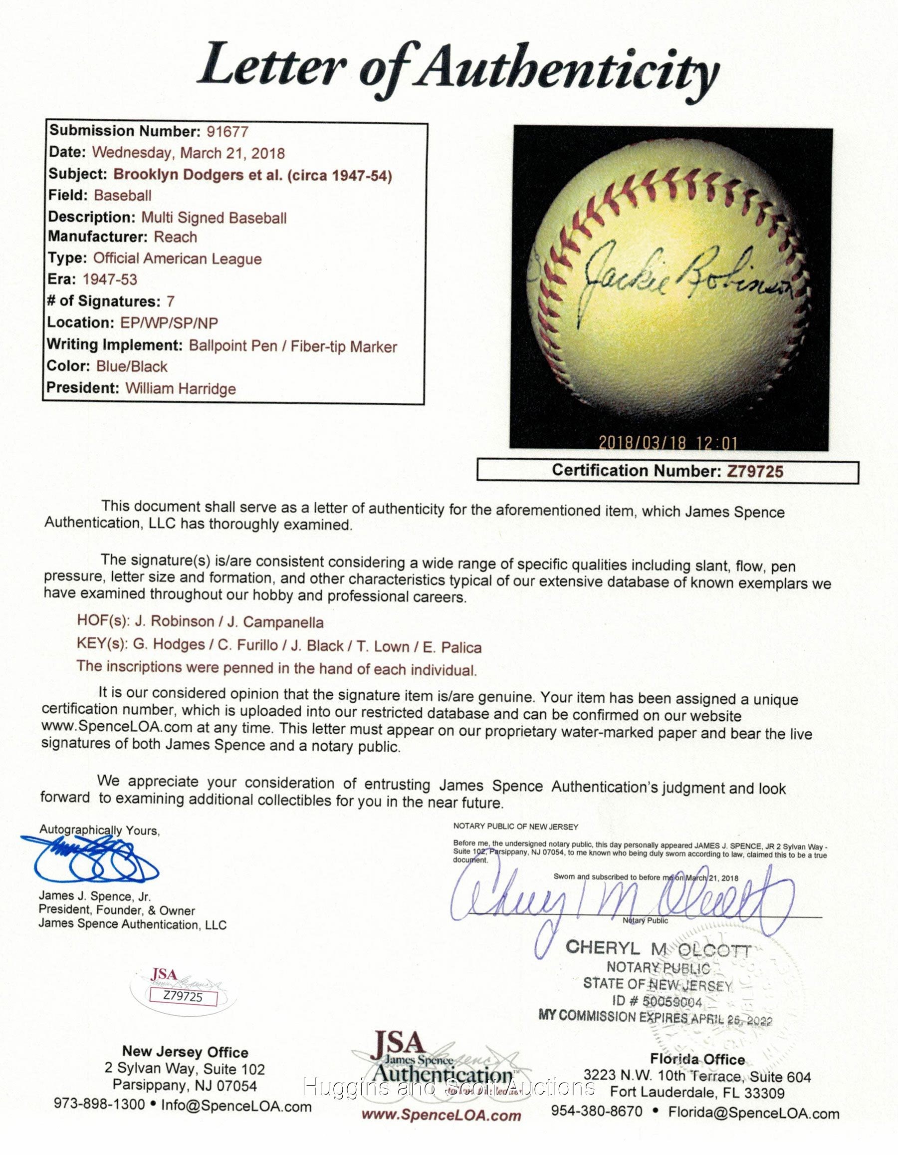 On this creamy-toned, light-stamping OAL (Harridge) ball, the Jackie Robinson ("8") and Gil Hodges ("9") are beauties that display as side-panel singles. The other key is Roy Campanella ("7-8"), and then there"s a quartet of Joe Black, Erv Palica, Carl Furillo and non-Dodger Turk Lown (all "6-8"). According to Charles Evers" personal notes, all but two of the signatures were actually obtained in the players" homes in February 1954, with Furillo later signing at his New York deli in 1966, and Hodges at his Brooklyn home in 1967. Full LOA from JSA.