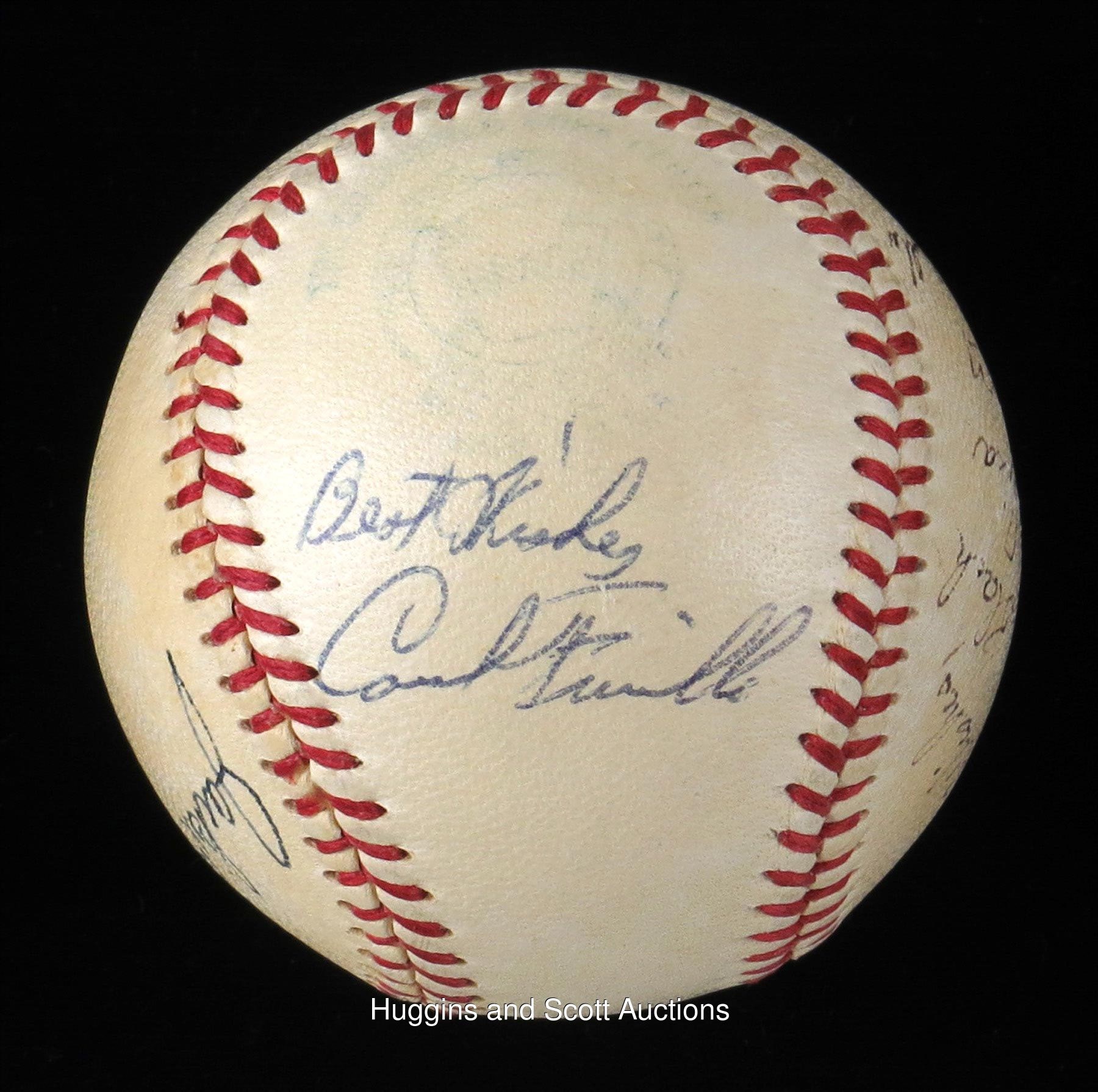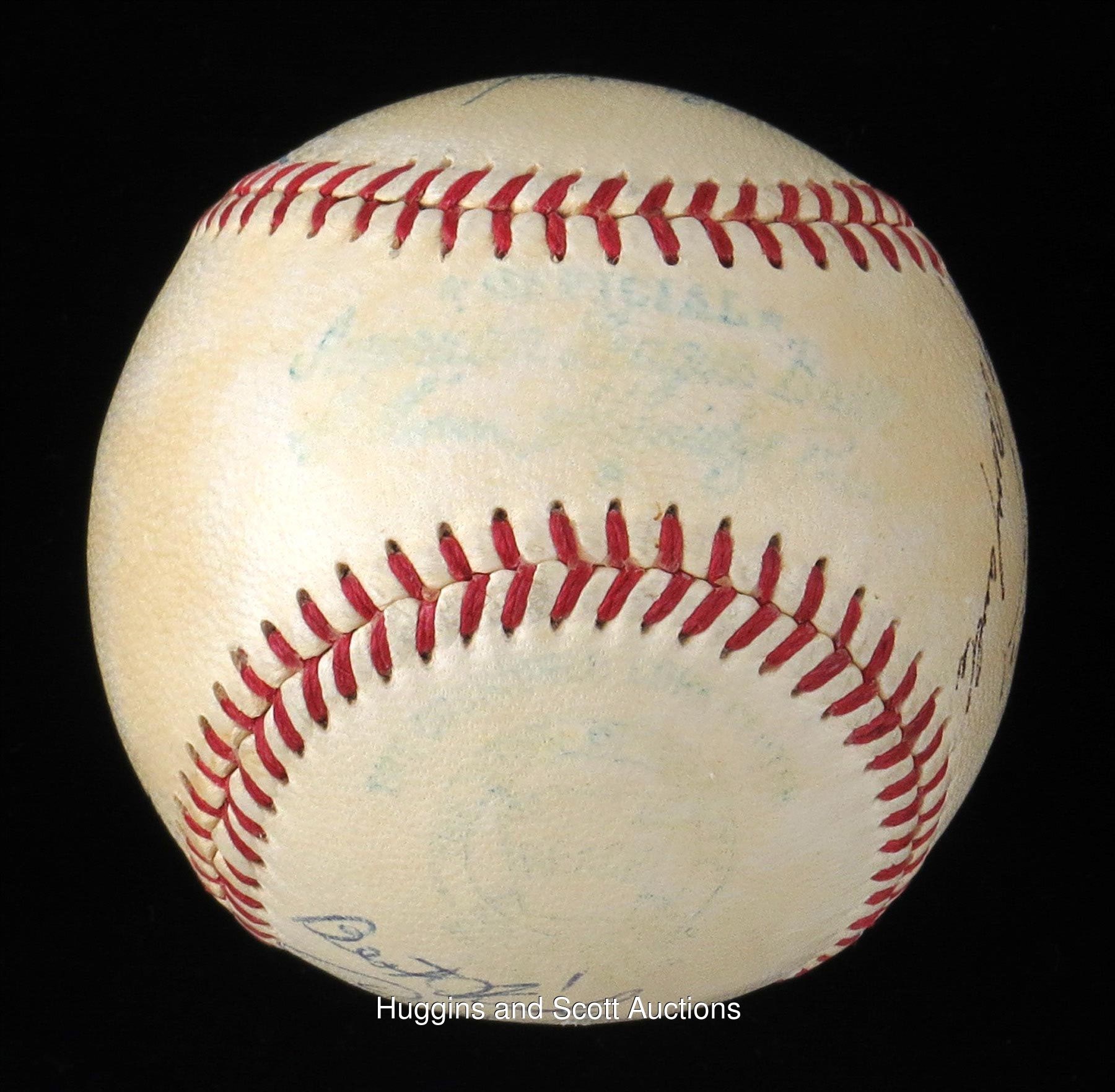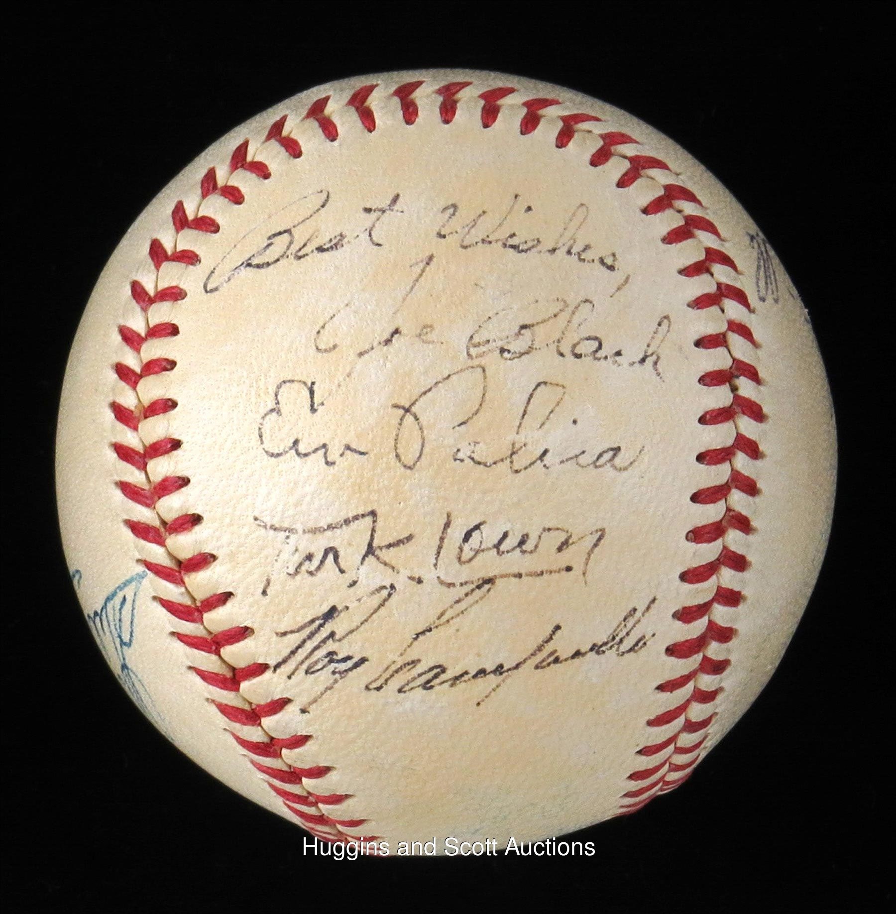 On this creamy-toned, light-stamping OAL (Harridge) ball, the Jackie Robinson ("8") and Gil Hodges ("9") are beauties that display as side-panel singles. The other key is Roy Campanella ("7-8"), and then there"s a quartet of Joe Black, Erv Palica, Carl Furillo and non-Dodger Turk Lown (all "6-8"). According to Charles Evers" personal notes, all but two of the signatures were actually obtained in the players" homes in February 1954, with Furillo later signing at his New York deli in 1966, and Hodges at his Brooklyn home in 1967. Full LOA from JSA.