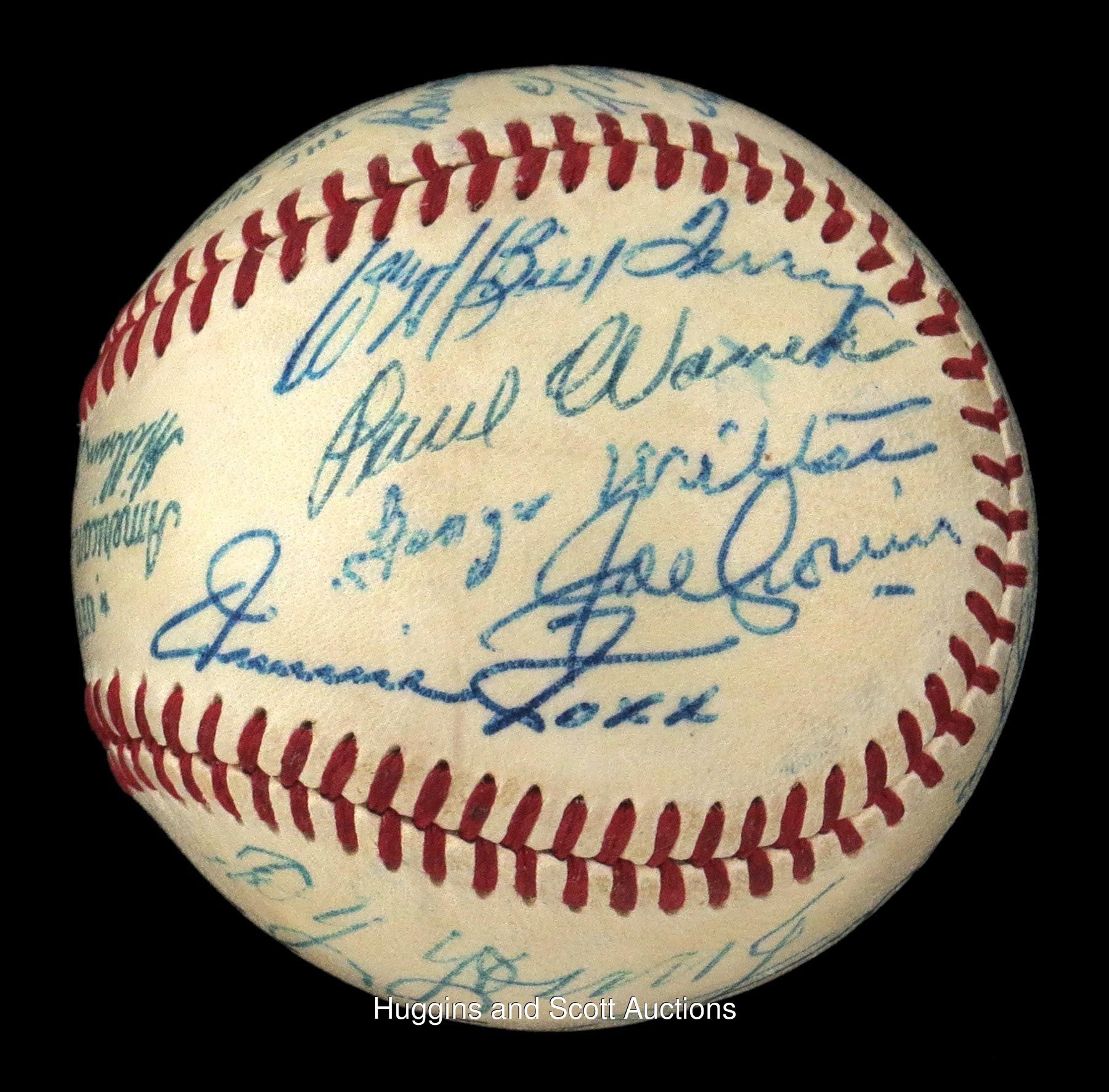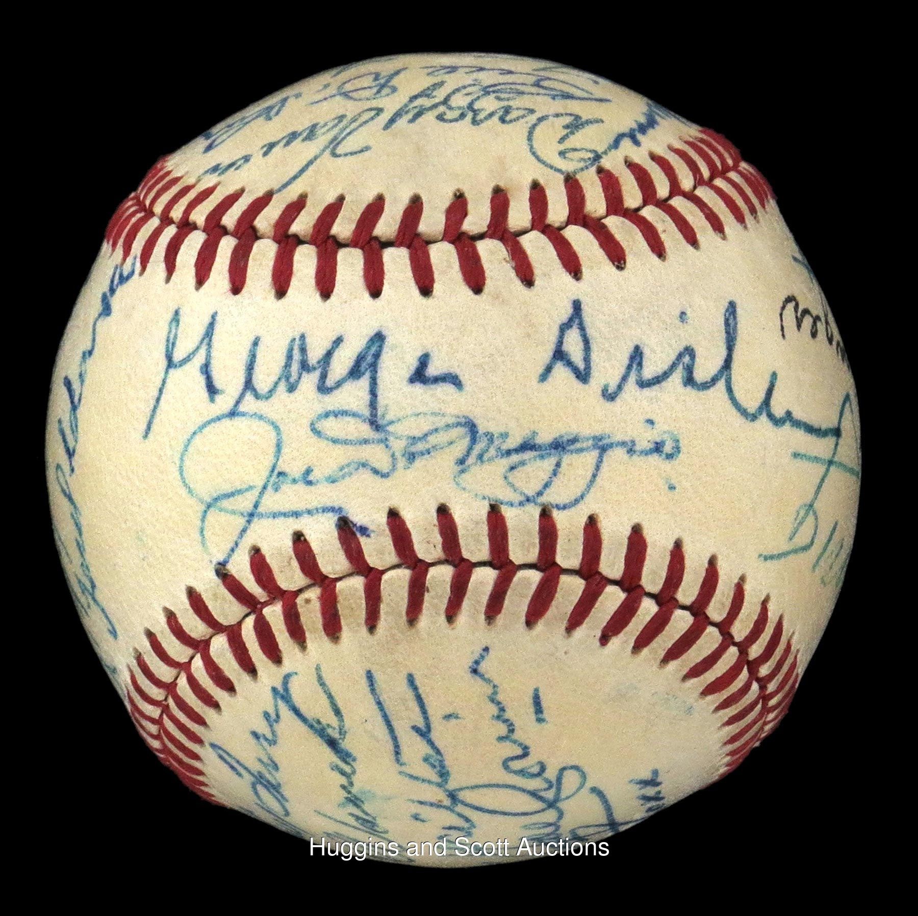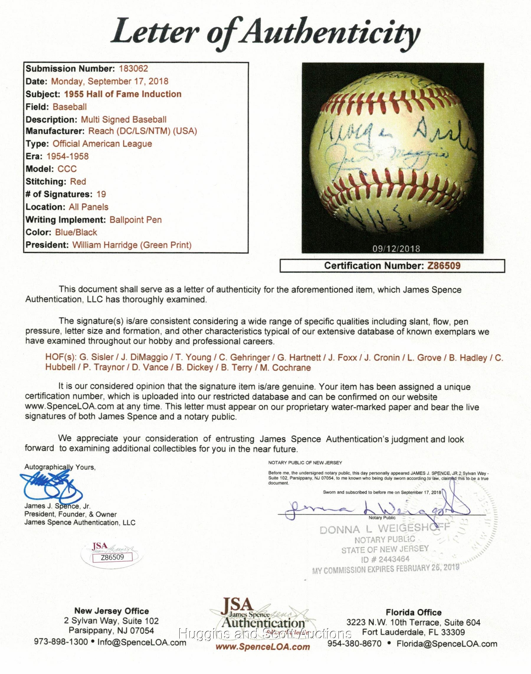With the largest Hall of Fame class and biggest crowd since 1939, Cooperstown opened its arms to 6 new inductees, including the great Joltin" Joe. (A brief news clip of induction-ceremony footage can be viewed on our website.) The festivities also marked the very last of many Hall of Fame appearances by Cy Young, whose autograph is present here but who died a few months later. The creamy-toned OAL (Harridge) ball features "8-10" signatures overall. Sweet Spot: Sisler, DiMaggio North Panel: Vance, Dickey, Frisch, Traynor, Hubbell, Cochrane South Panel: Terry, P. Waner, Wiltse, Cronin, Foxx ("9-10") West Panel: Hadley, Grove, Clarke ("8"), East Panel: Young ("6-7"), Gehringer, Hartnett Full LOA from PSA.